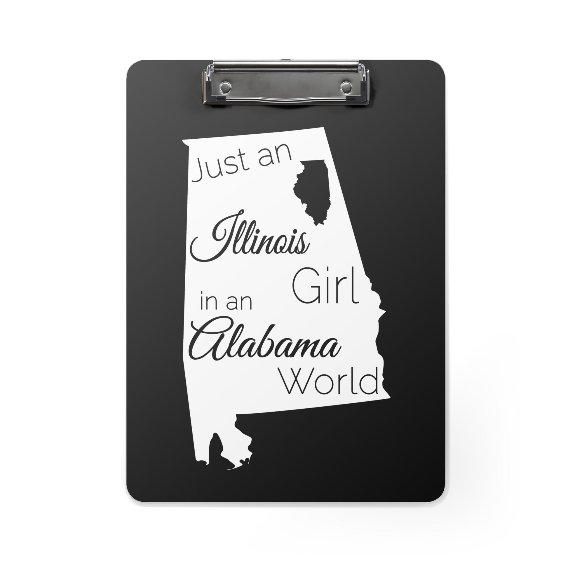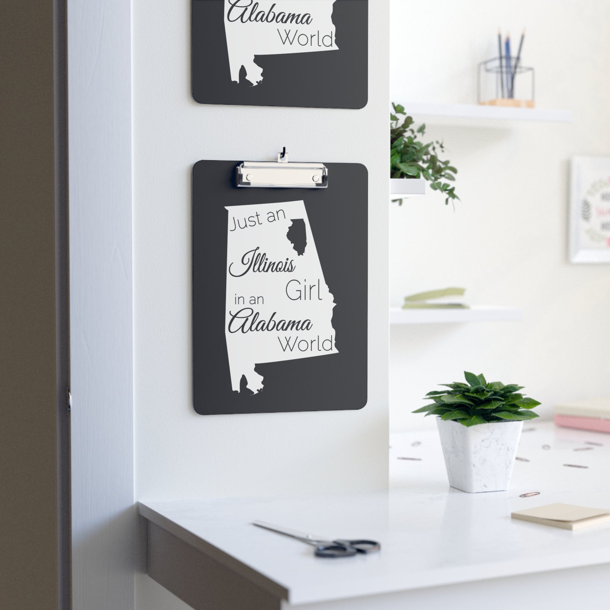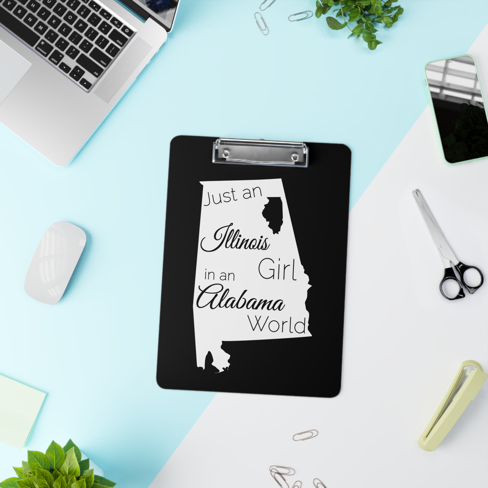 Show your pride in your home state with this clipboard showing Just an Illinois Girl in an Alabama World. Clipboards are an office staple.
