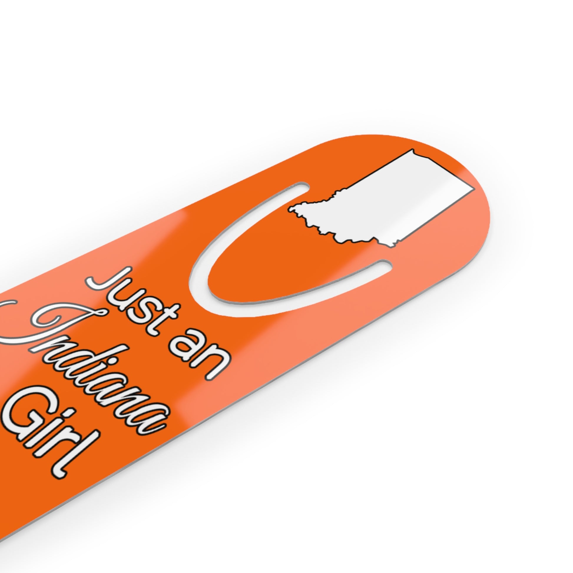 Show your pride in your home state with this bookmark showing Just an Indiana Girl in an Alabama World.  Made with robust aluminum, features top slot that holds single pages in place.