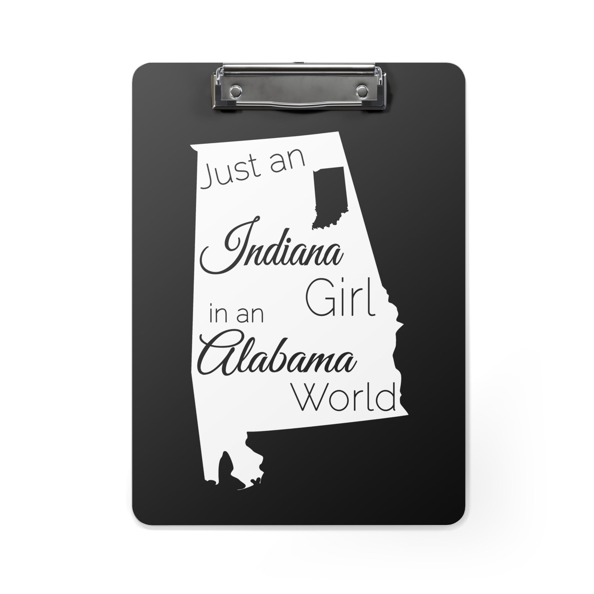 Show your pride in your home state with this clipboard showing Just an Indiana Girl in an Alabama World. Clipboards are an office staple.