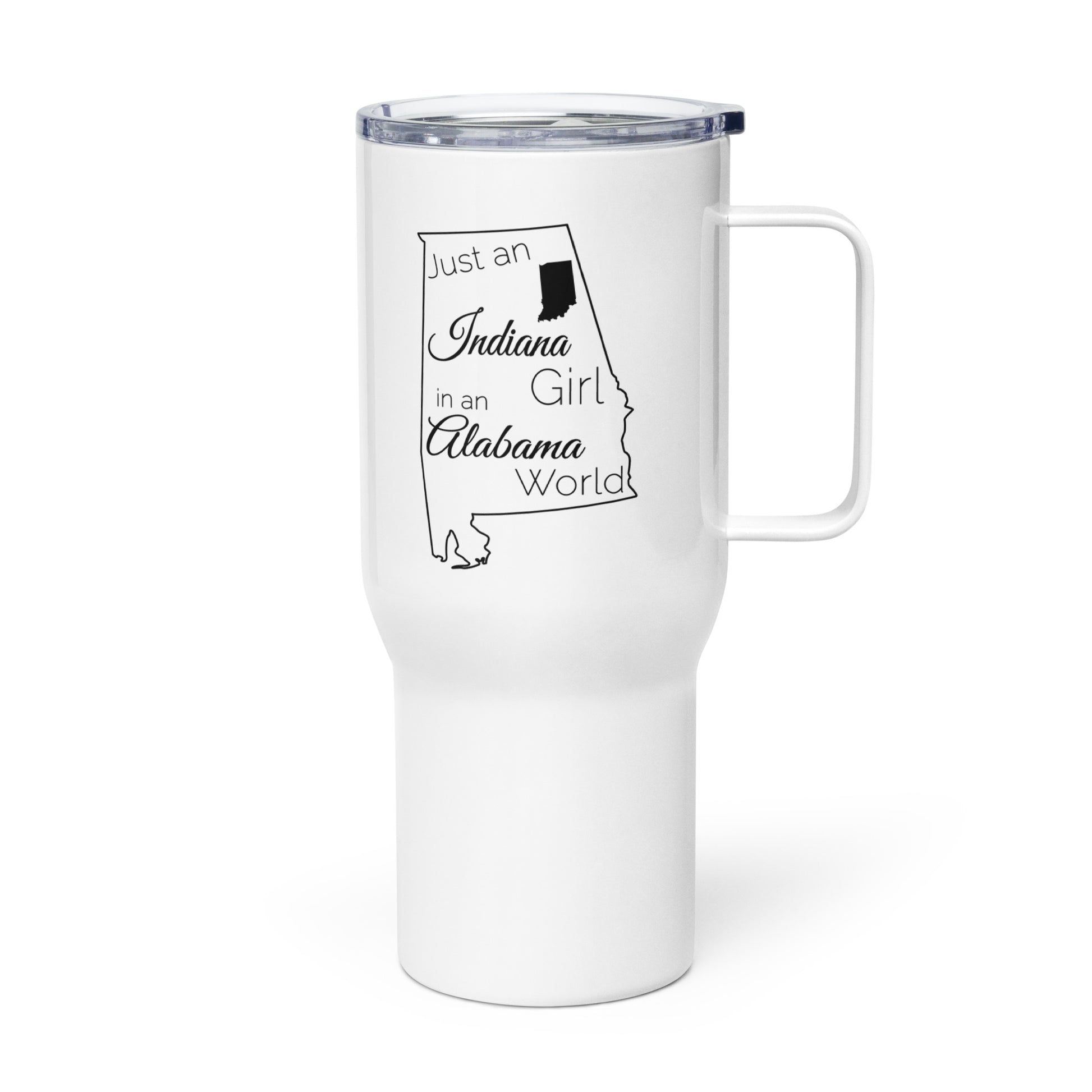 Just an Indiana Girl in an Alabama World Travel mug with a handle