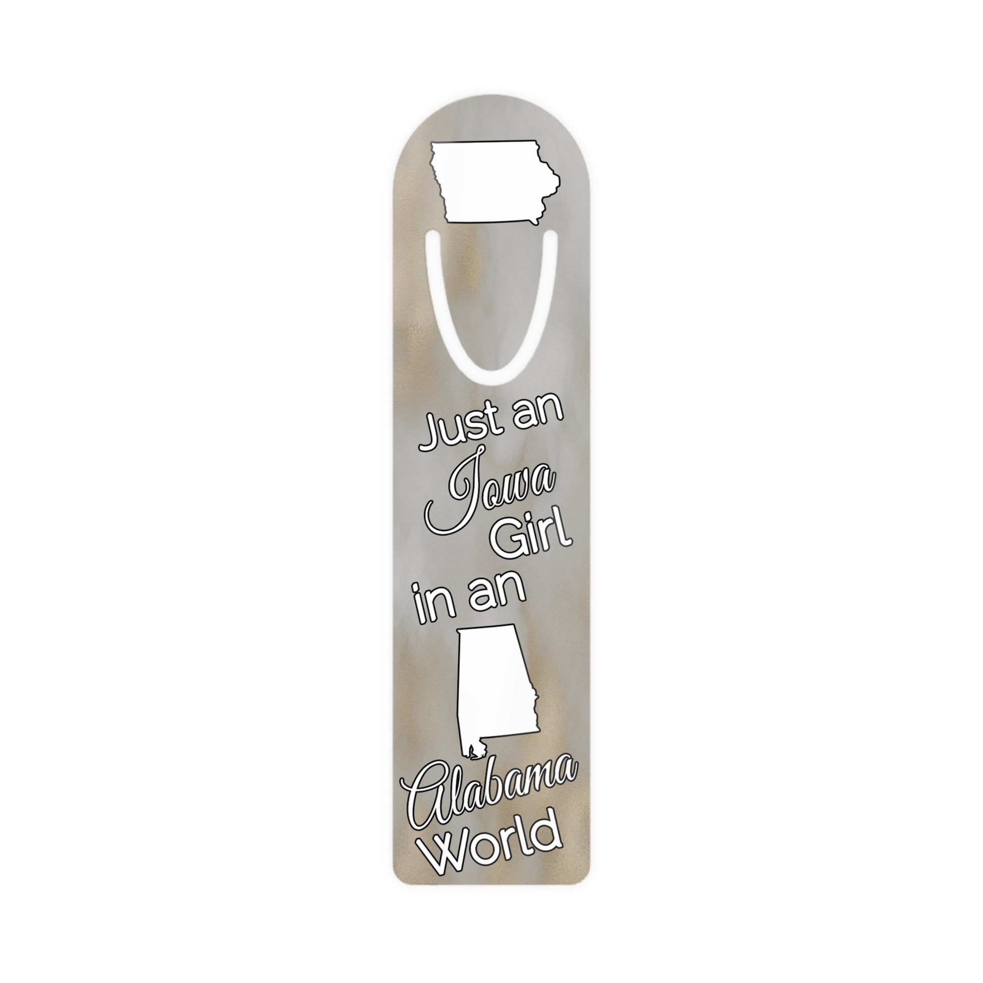 Show your pride in your home state with this bookmark showing Just an Iowa Girl in an Alabama World. Made with robust aluminum, features top slot that holds single pages in place.