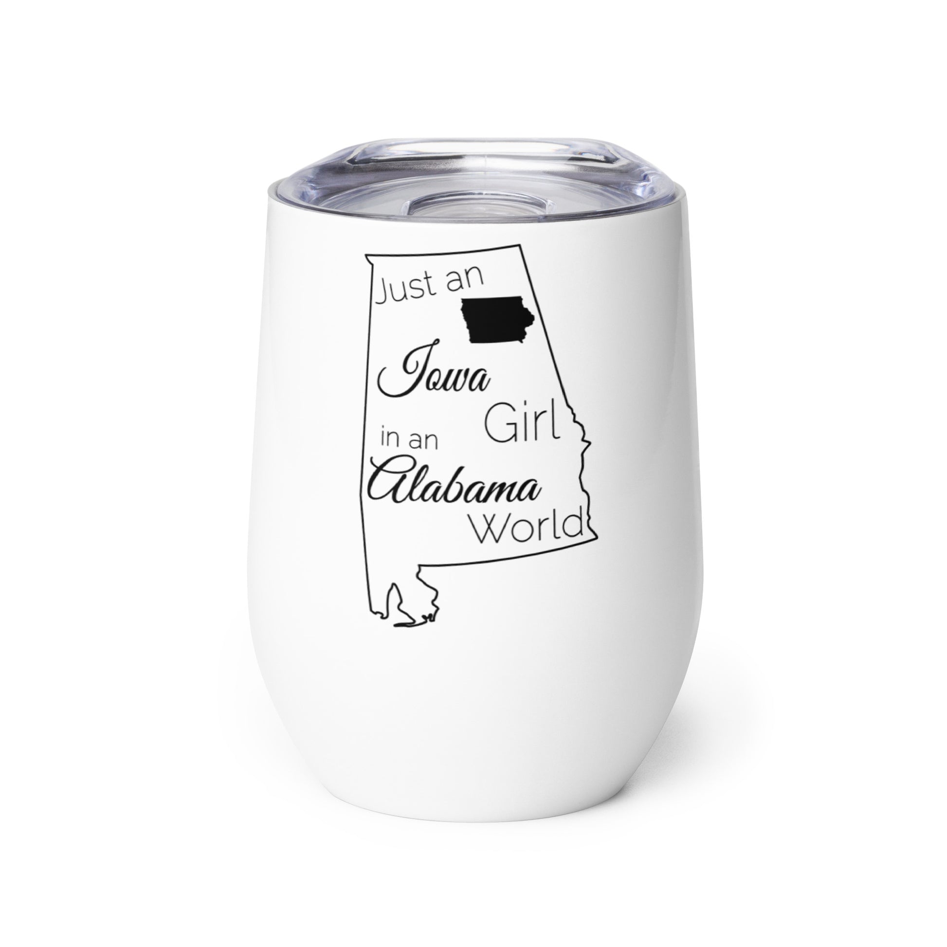 Show your pride in your home state with this wine tumbler saying Just an Iowa Girl in an Alabama World. What’s an outdoor party without a wine tumbler to keep a drink fresh and at just the right temperature? Forget breakable glasses—give this uniquely shaped wine tumbler a chance and have fun with friends without worry.