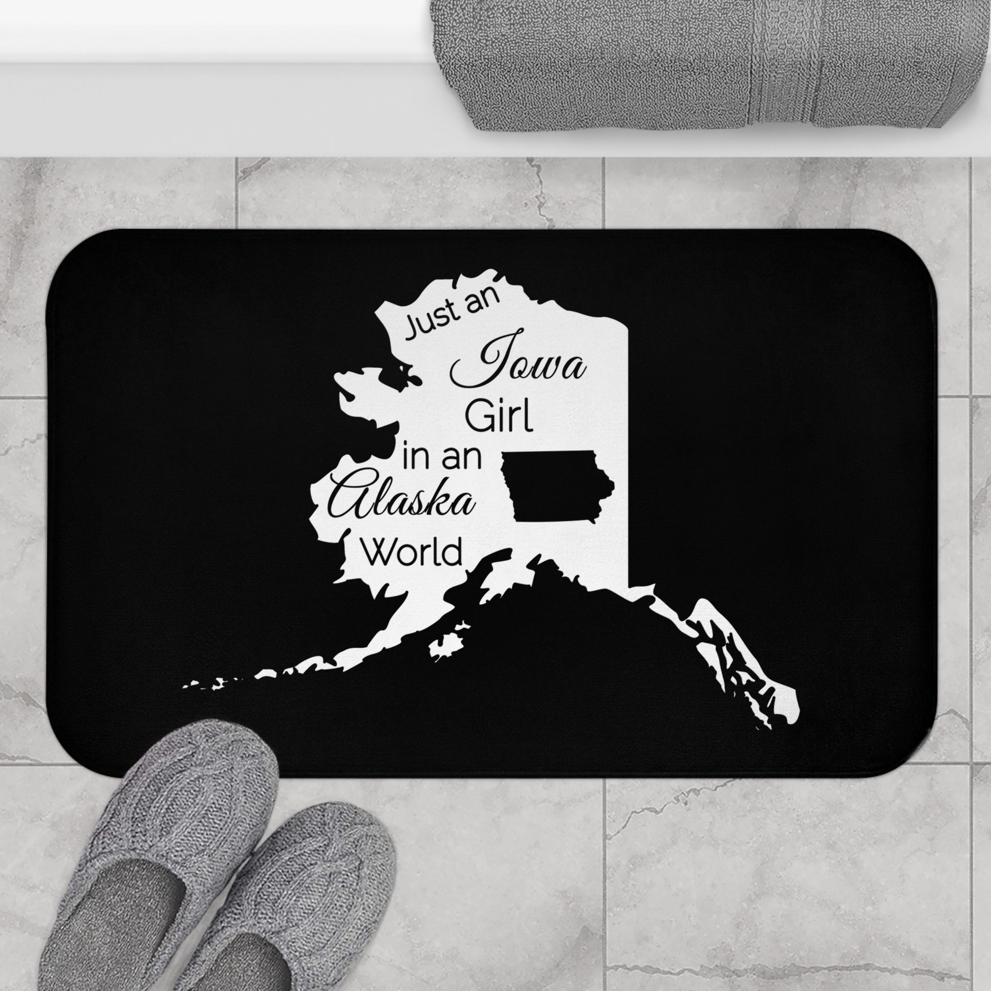 Show your pride in your home state with this bath mat showing Just an Iowa Girl in an Alaska World. This bath mat is as practical as it is stylish - the anti-slip backing keeps the bath mat firmly in place and reduces the risk of slipping.