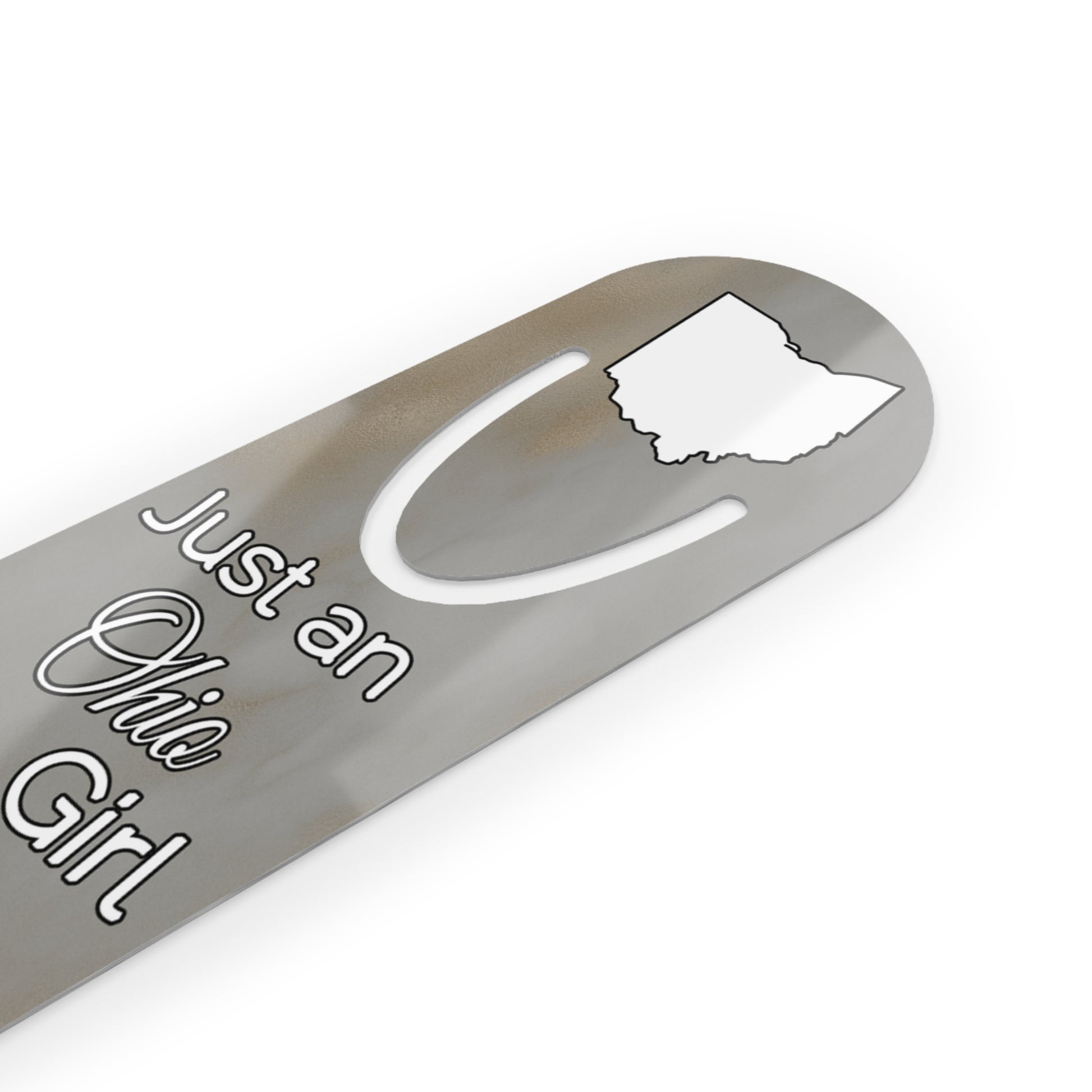 Show your pride in your home state with this bookmark showing Just an Ohio Girl in an Alabama World.  Made with robust aluminum, features top slot that holds single pages in place.