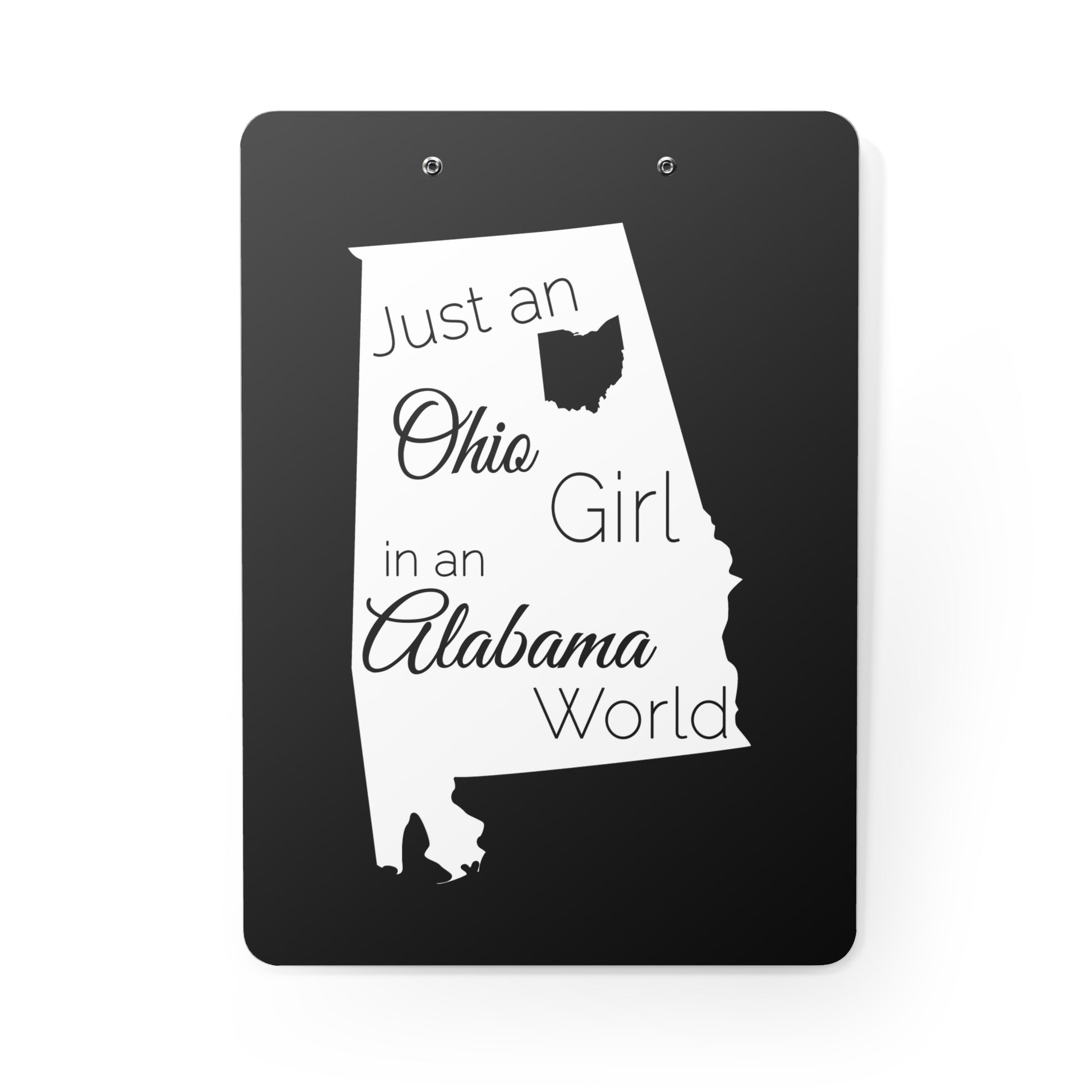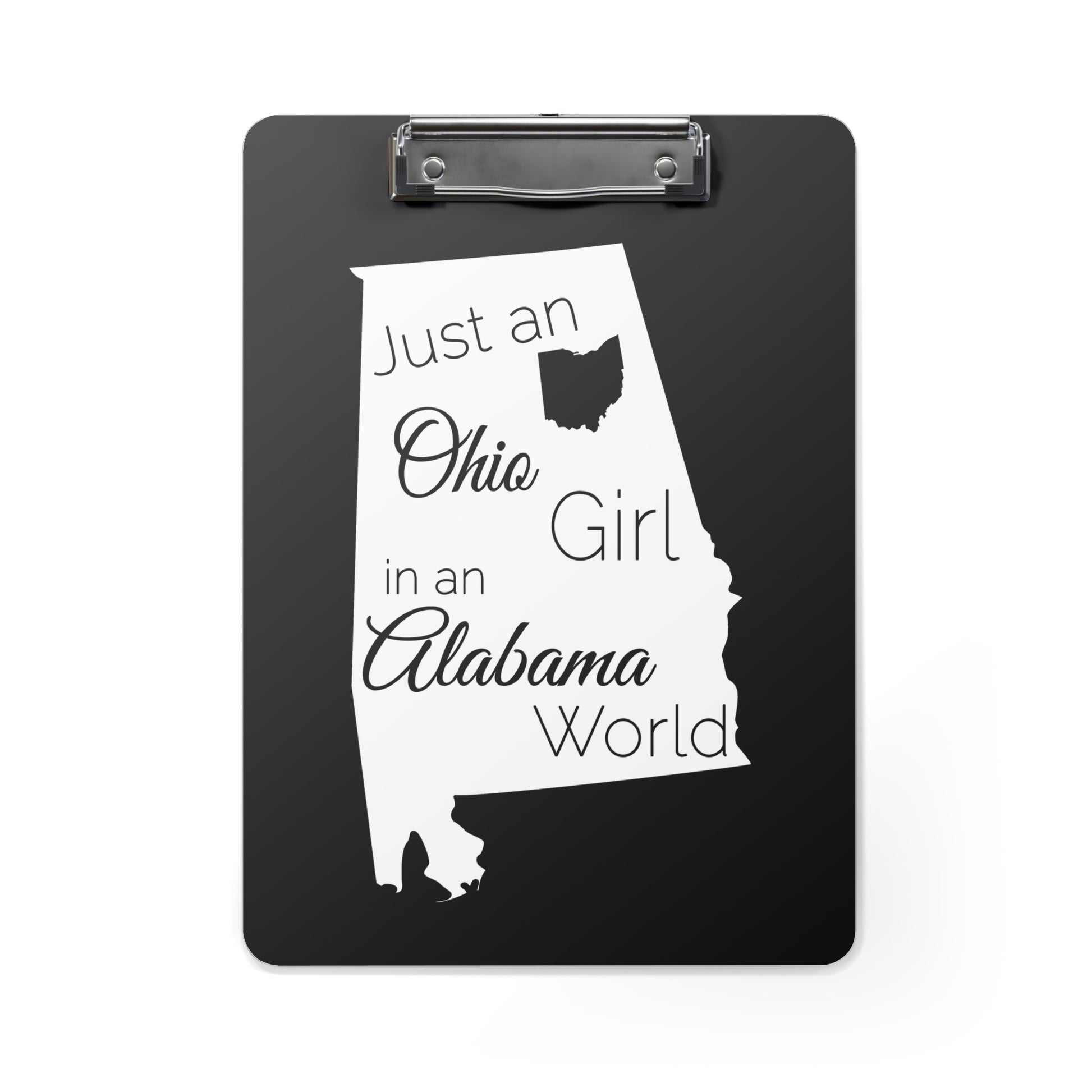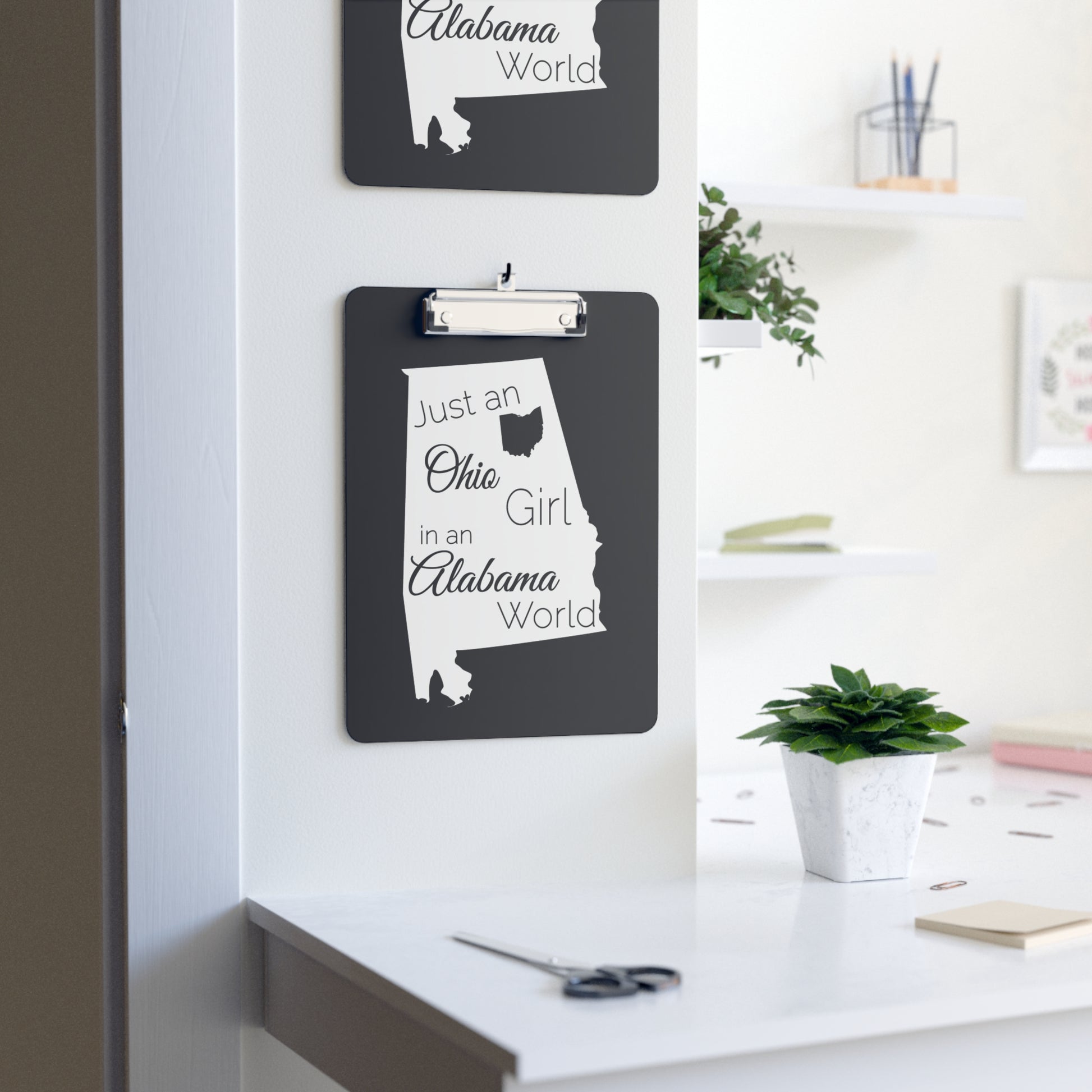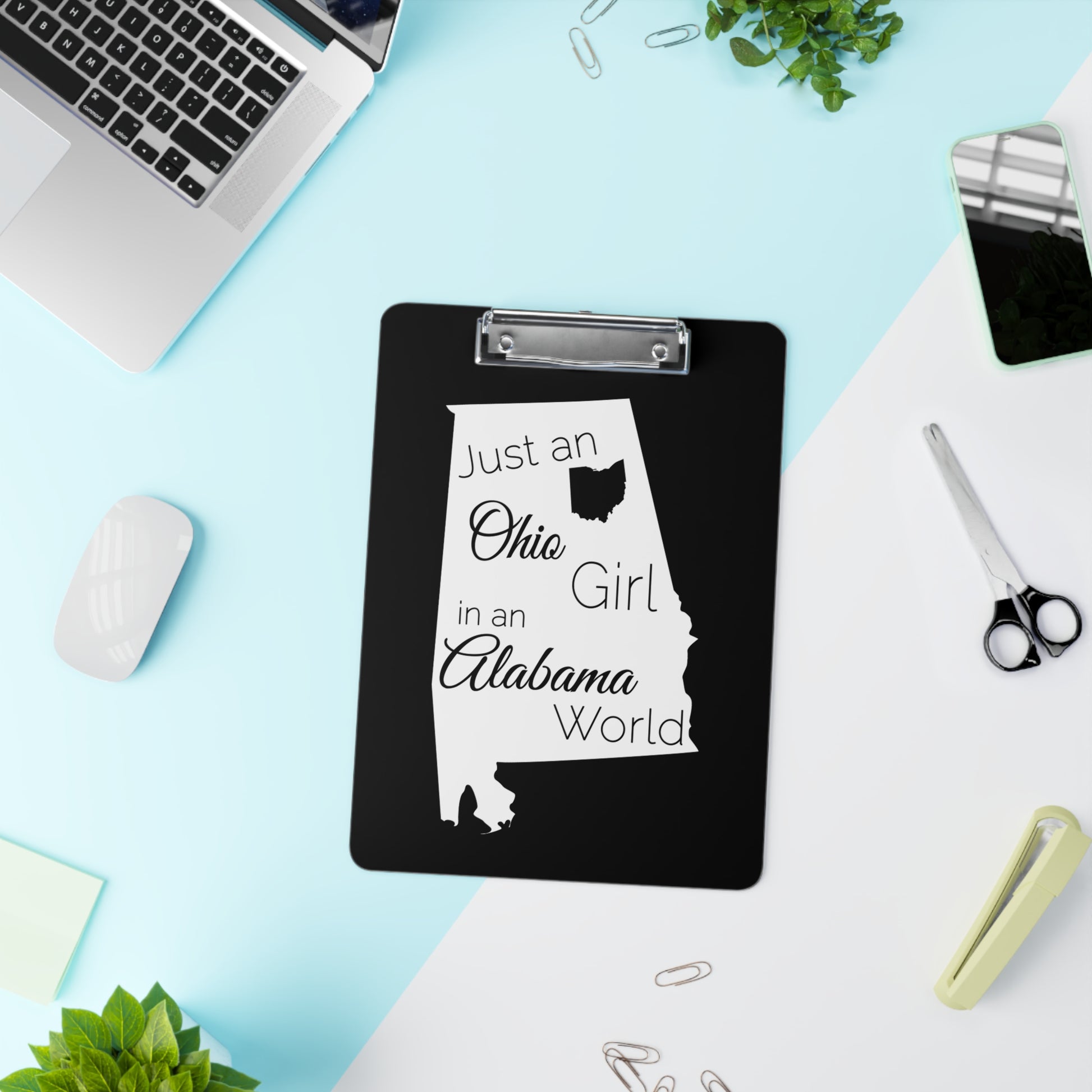 Show your pride in your home state with this clipboard showing Just an Ohio Girl in an Alabama World. Clipboards are an office staple.