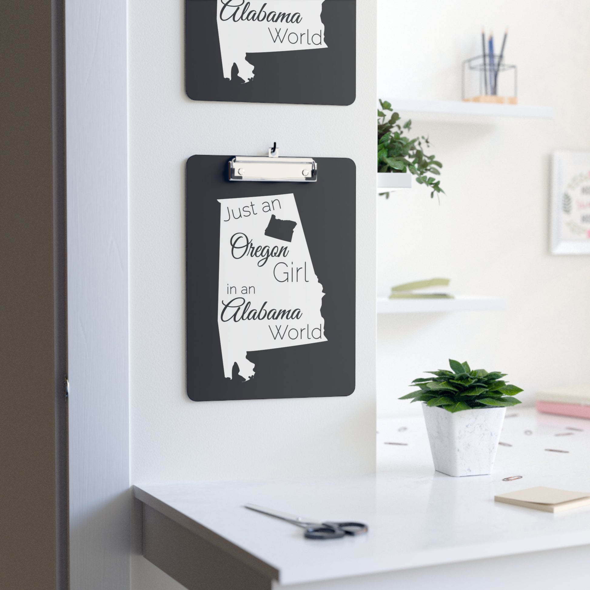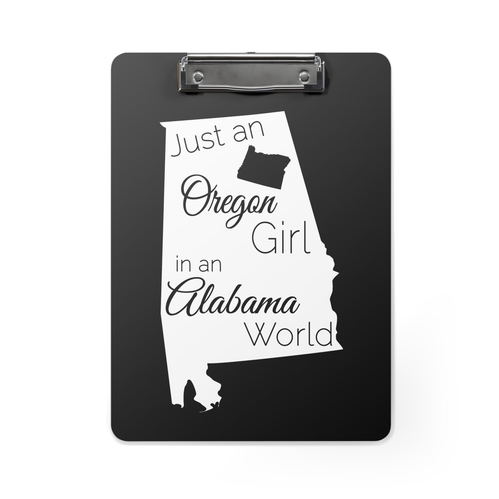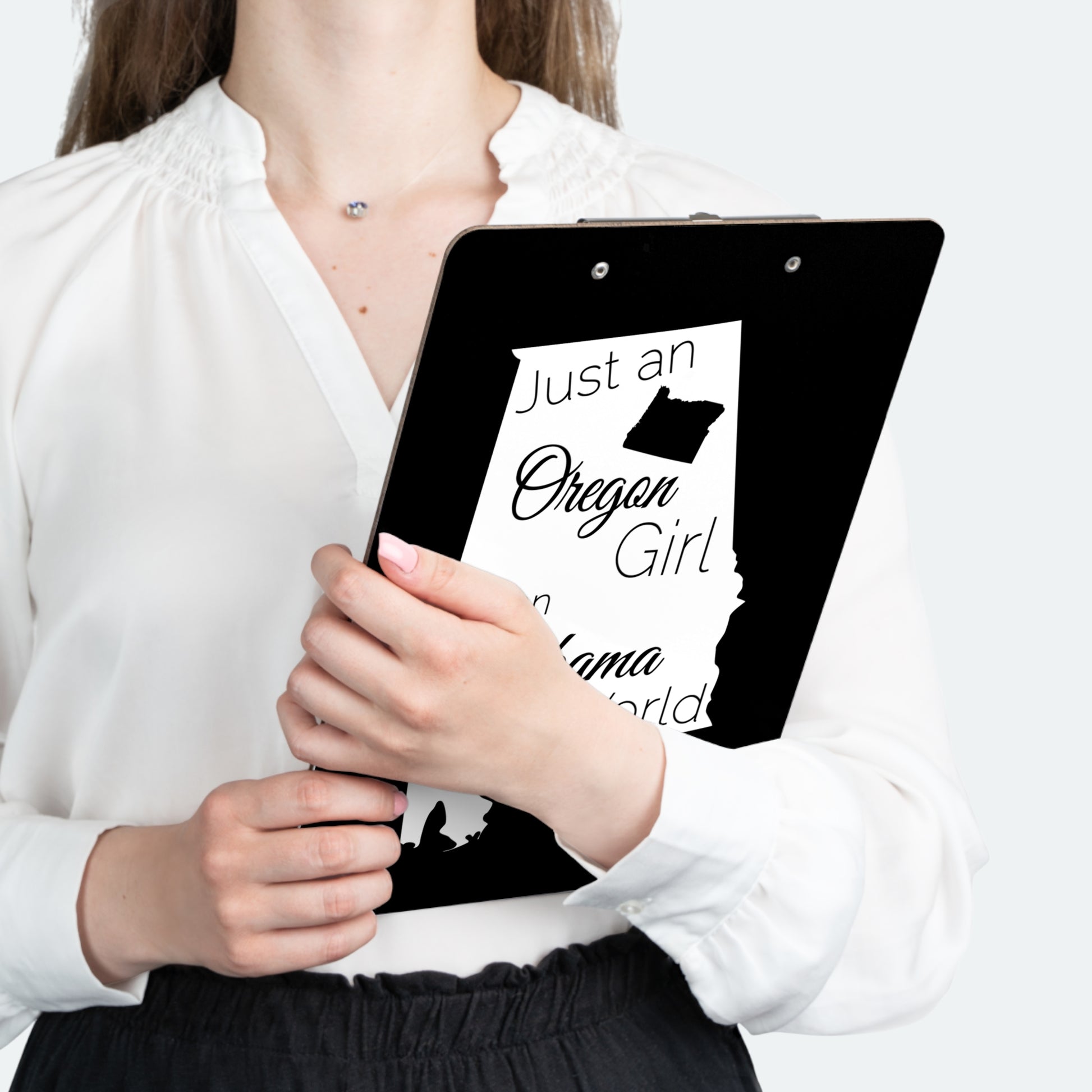 Show your pride in your home state with this clipboard showing Just an Oregon Girl in an Alabama World. Clipboards are an office staple.