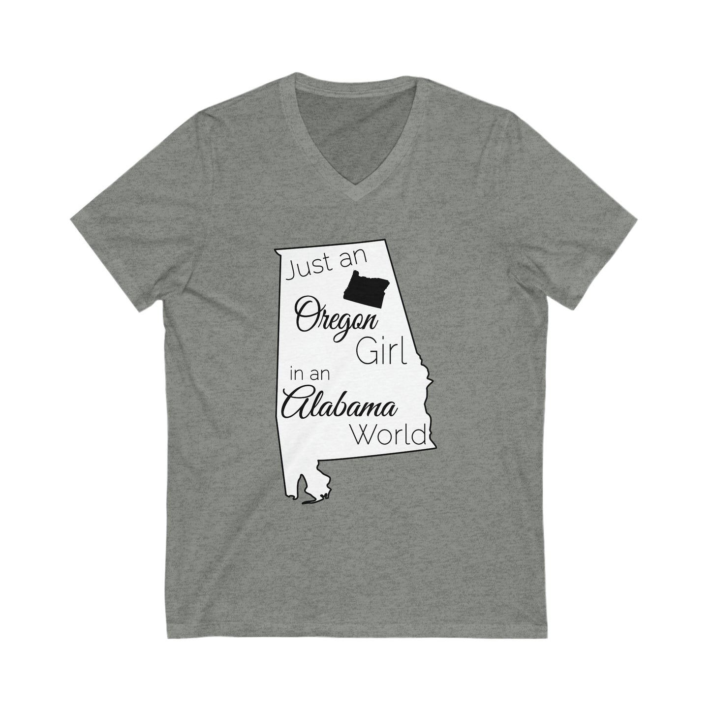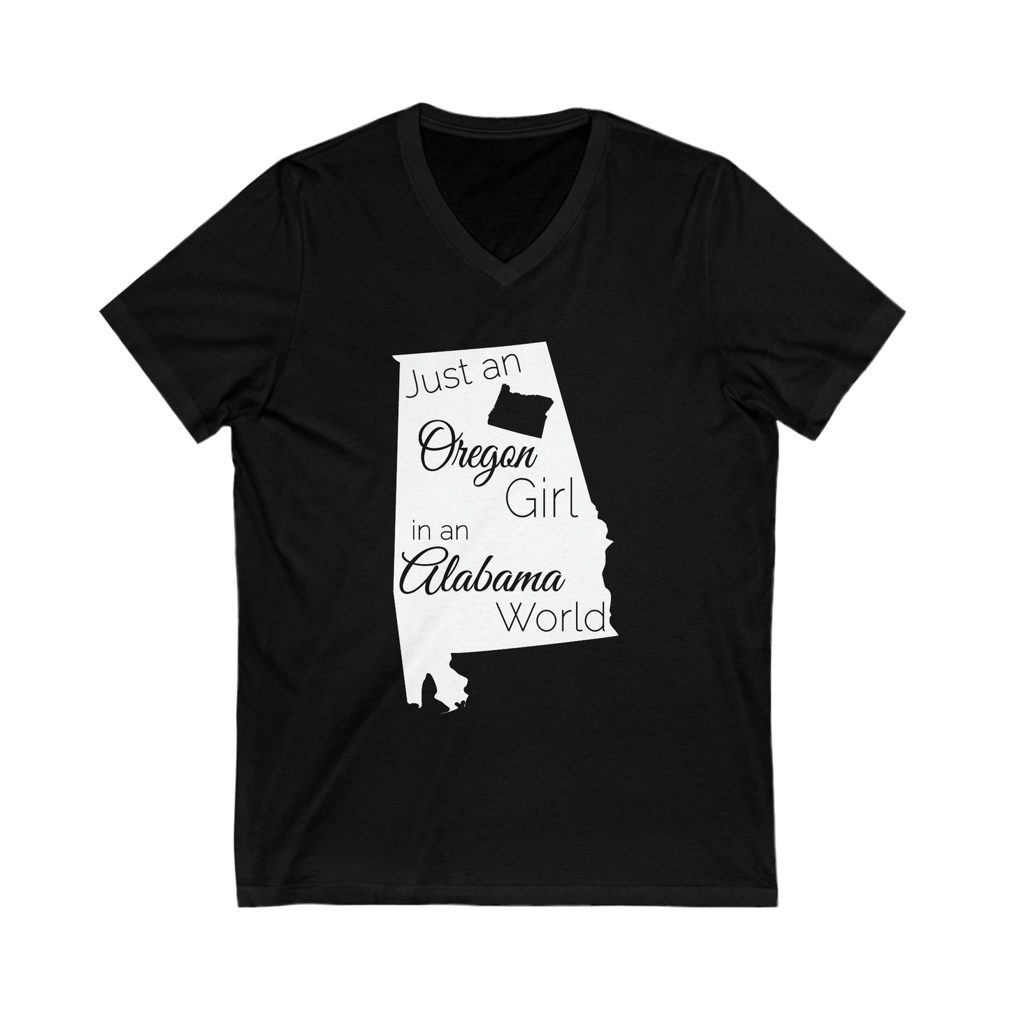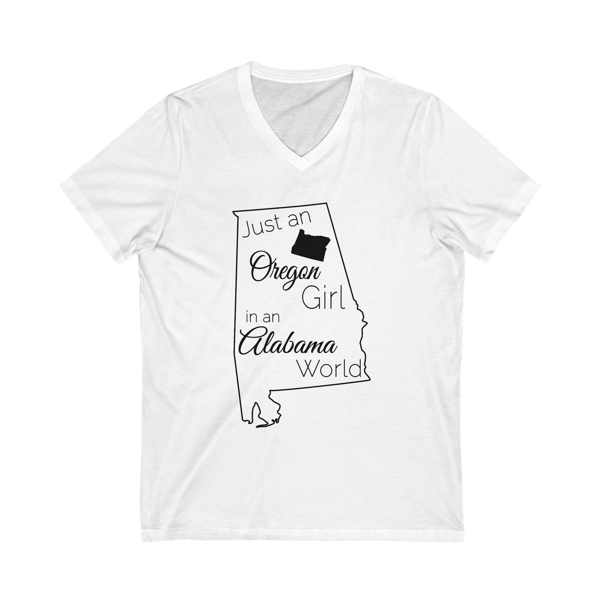 Just an Oregon Girl in an Alabama World Unisex Jersey Short Sleeve V-Neck Tee