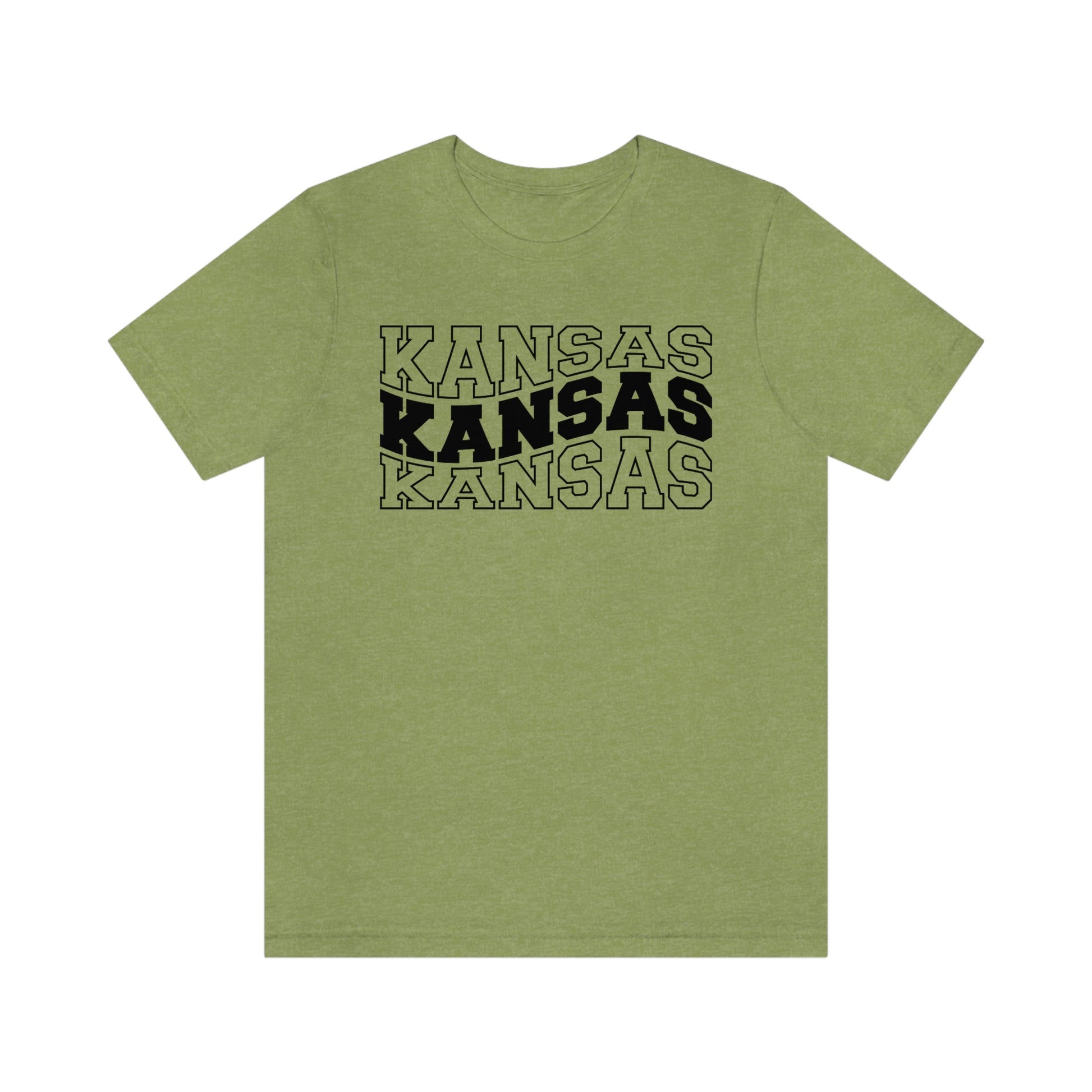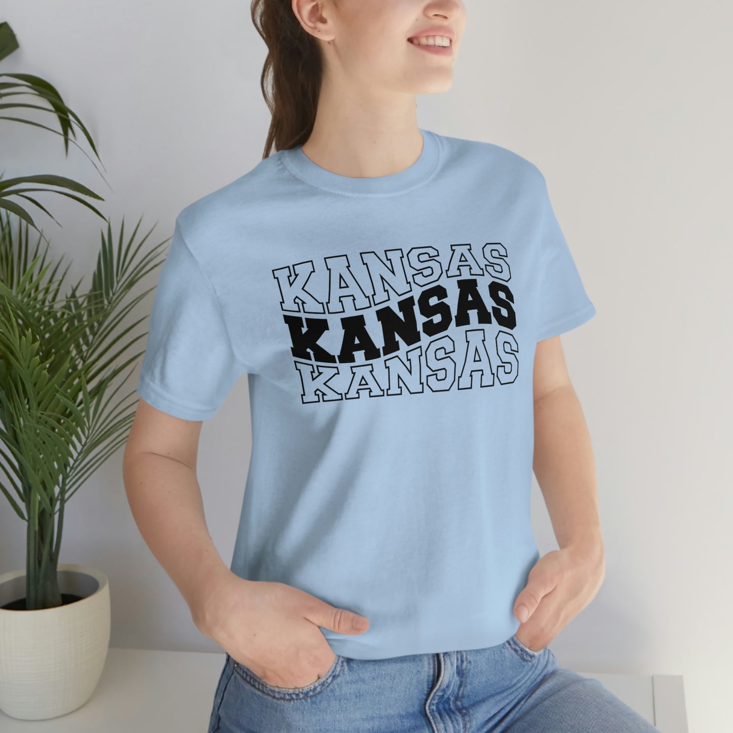 Show off your love and pride in Kansas with this classic unisex short sleeve t-shirt showing Kansas written in varsity letters in a triple wave design. This tee fits like a well-loved favorite. Soft cotton and quality print make you fall in love with it over and over again. These t-shirts have ribbed knit collars to bolster shaping. The shoulders have taping for better fit over time. Dual side seams hold the garment's shape for longer.