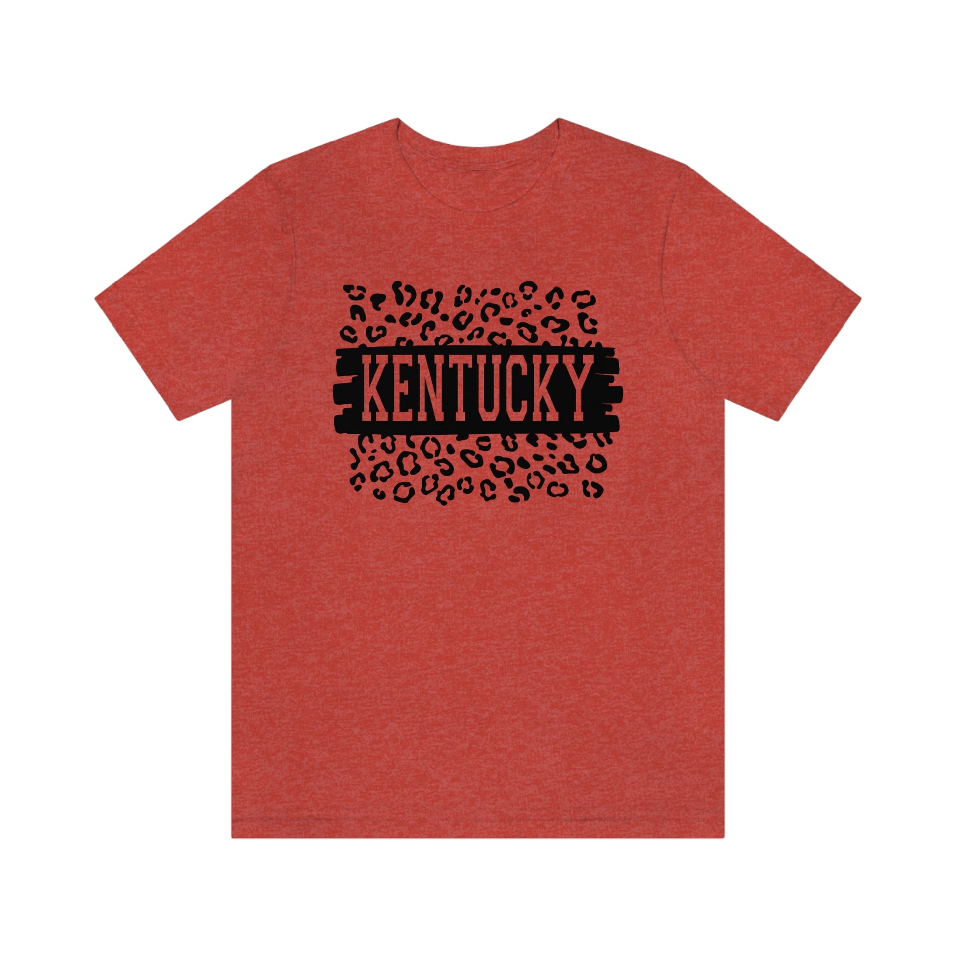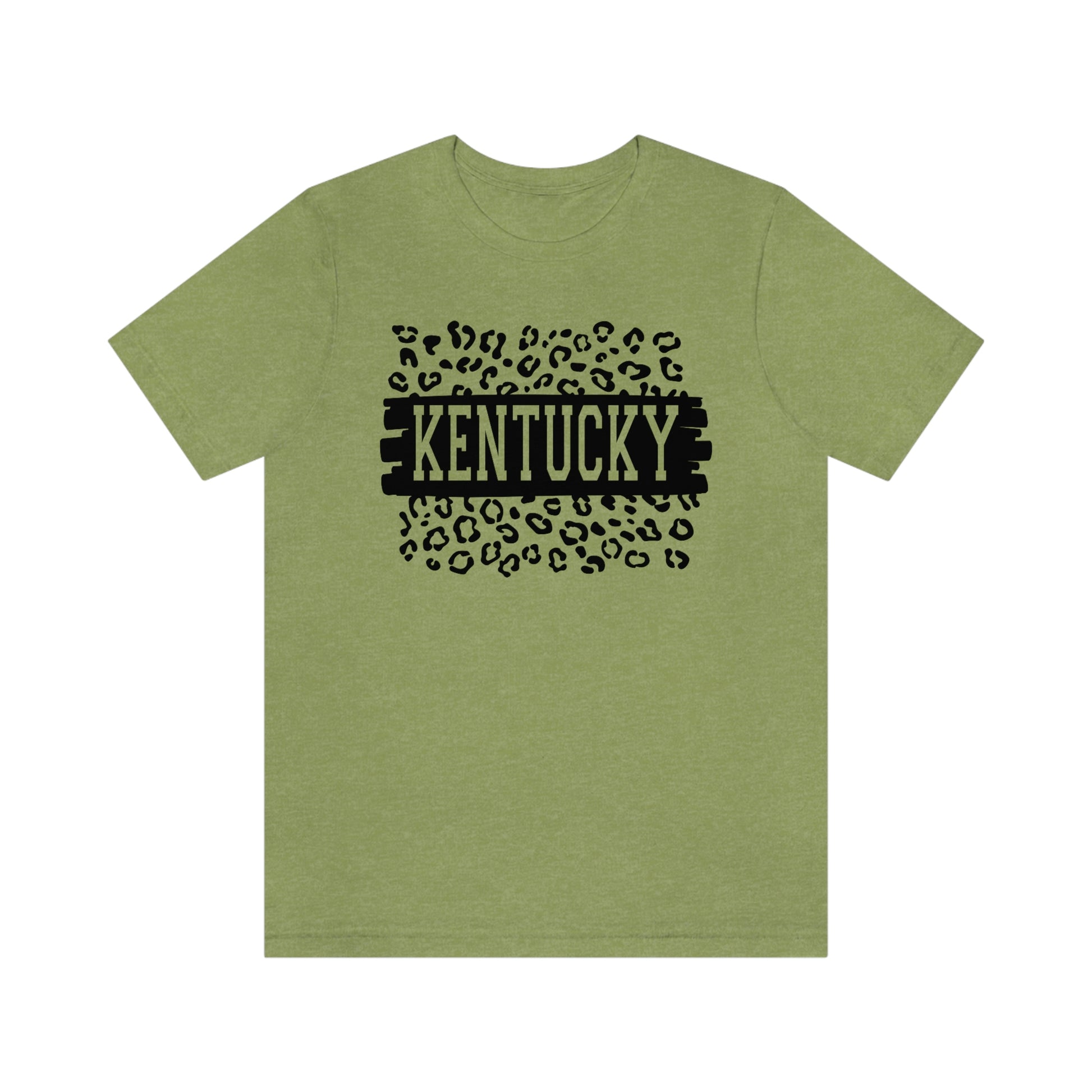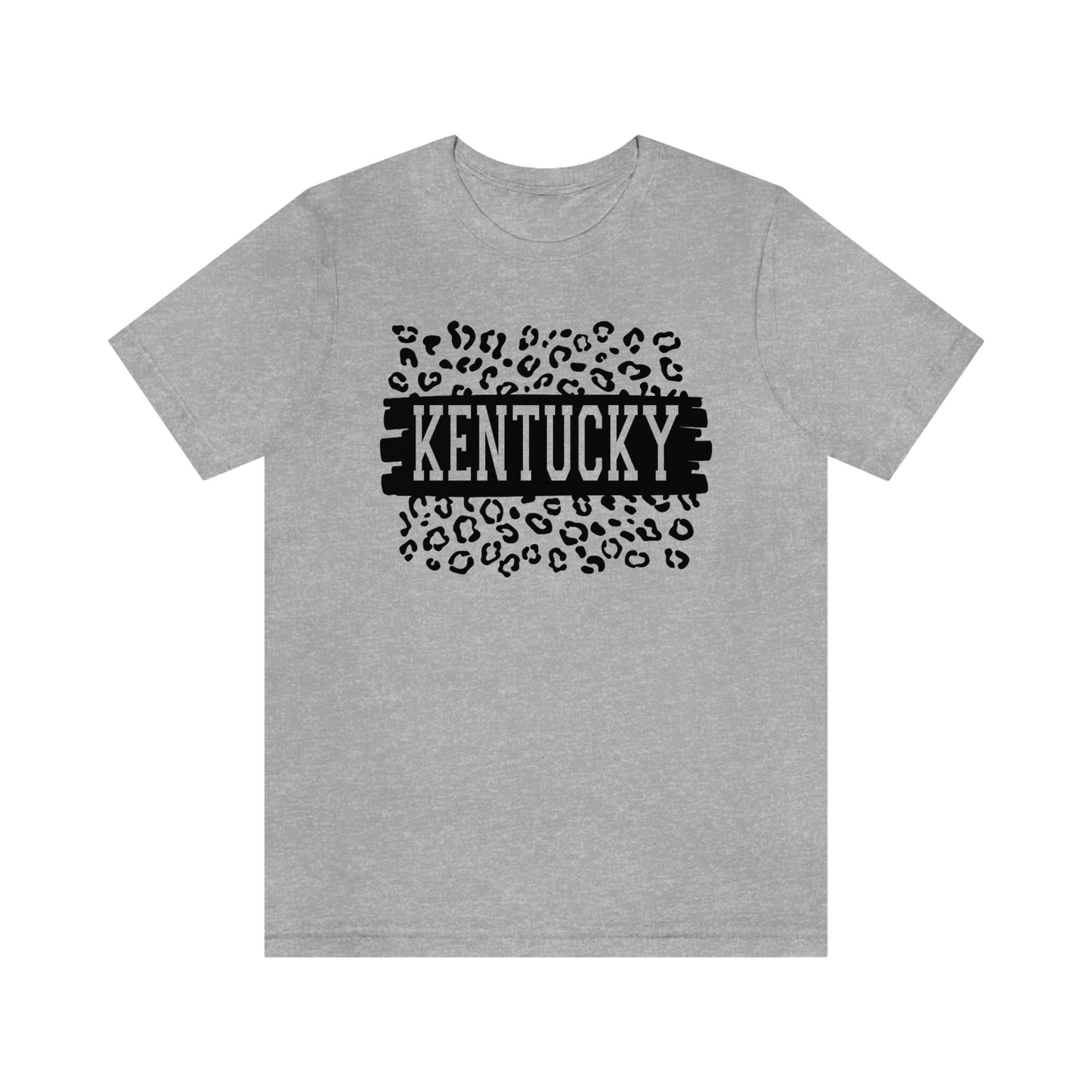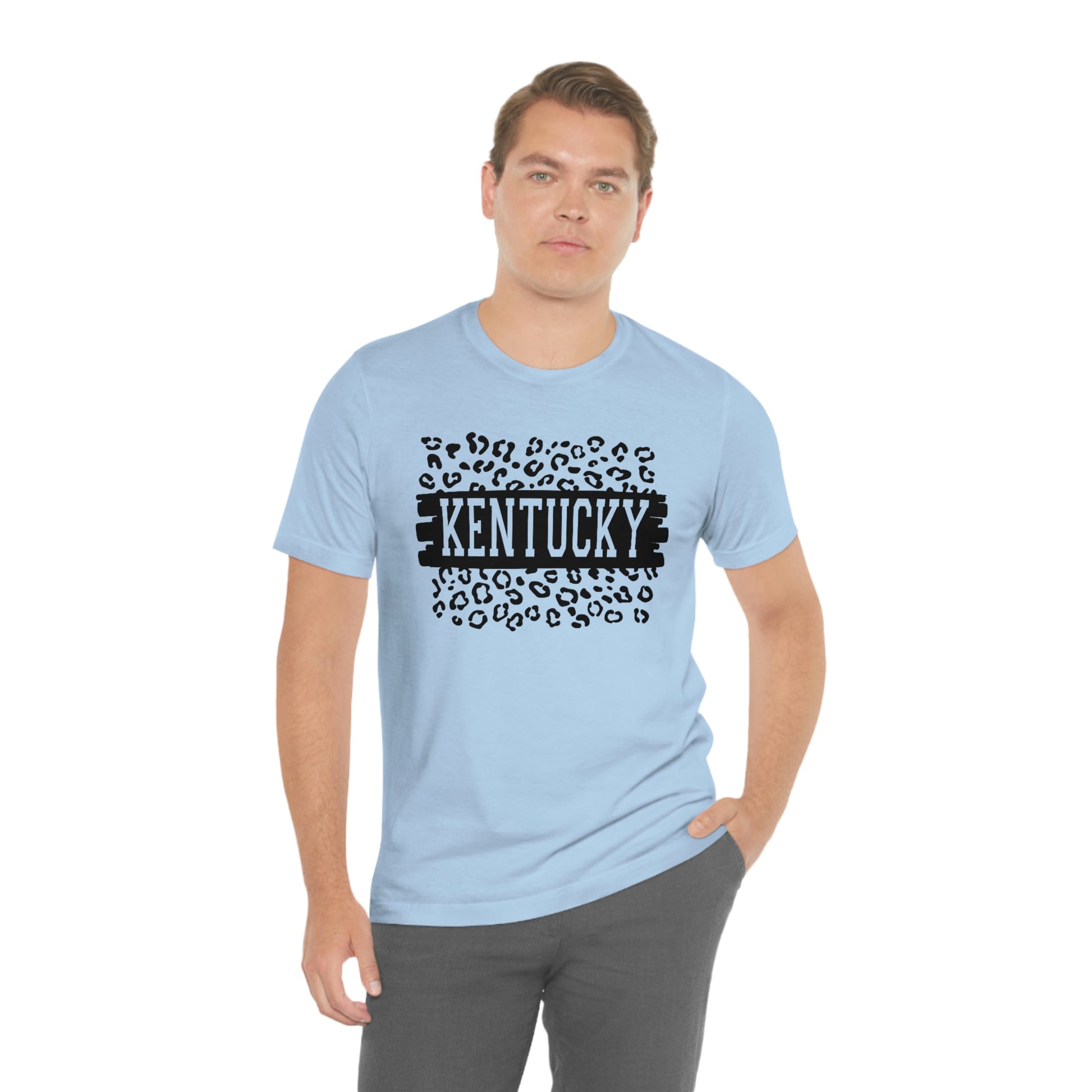 Show off your love and pride in Kentucky with this classic unisex short sleeve t-shirt showing Kentucky written on a black band over a leopard print background. This tee fits like a well-loved favorite. Soft cotton and quality print make you fall in love with it over and over again. These t-shirts have ribbed knit collars to bolster shaping. The shoulders have taping for better fit over time. Dual side seams hold the garment's shape for longer.