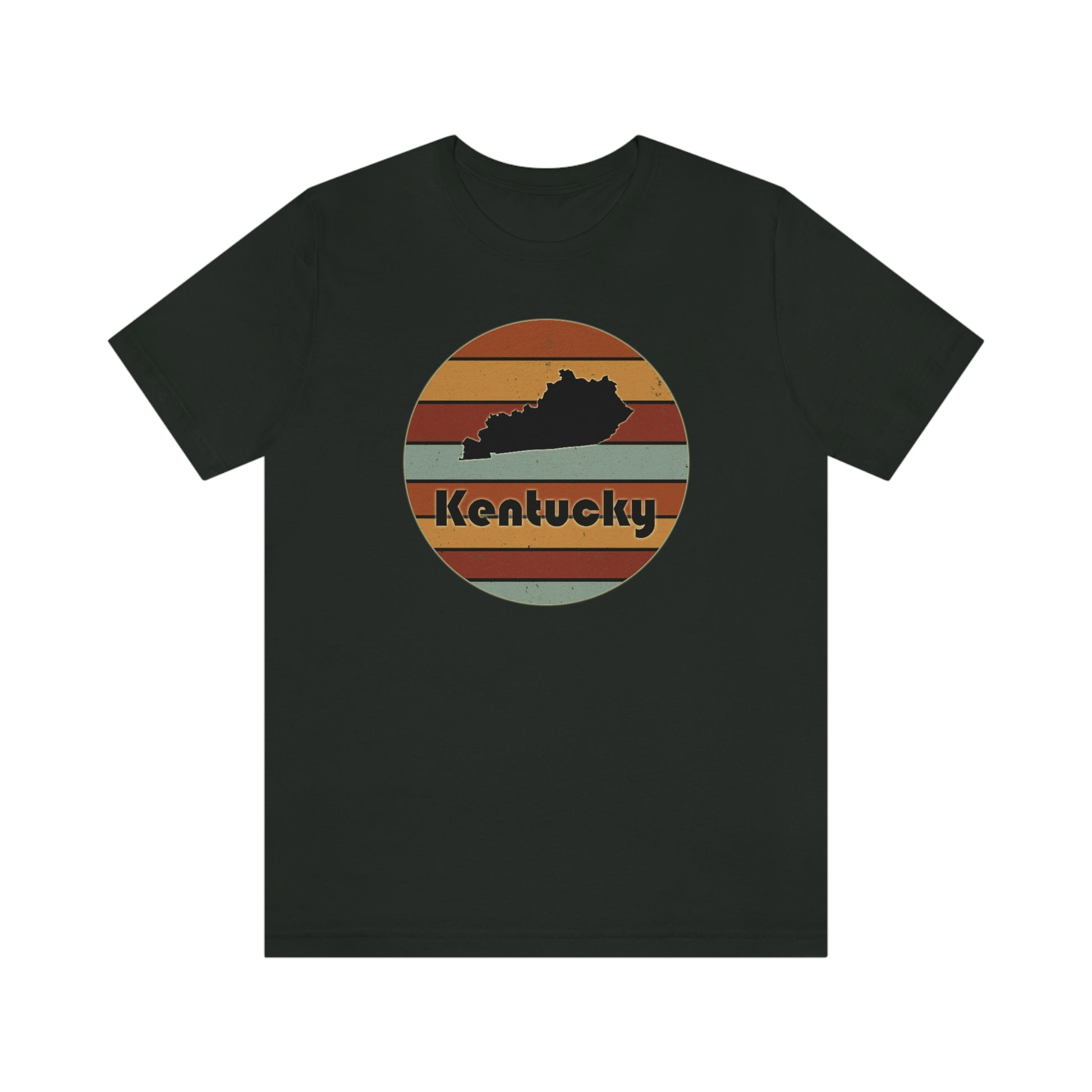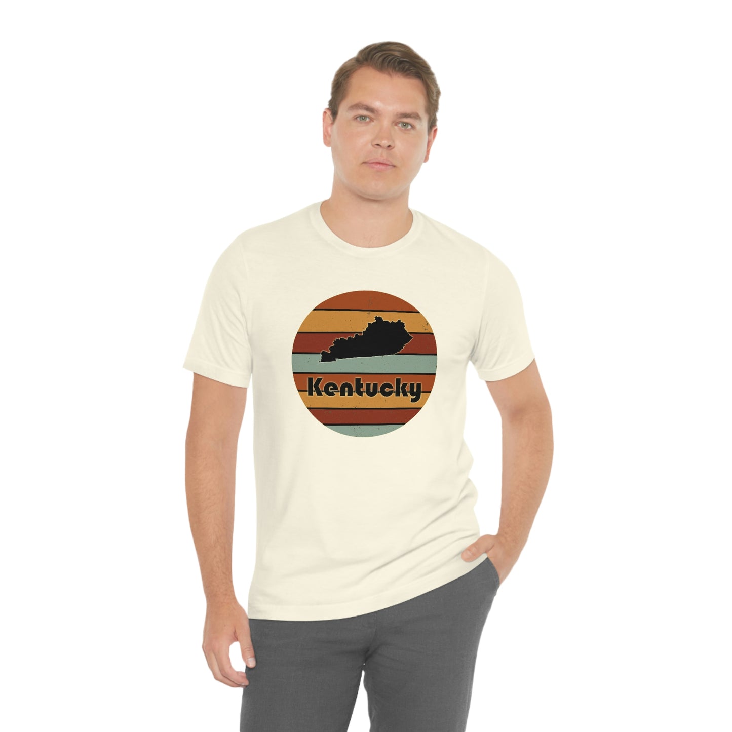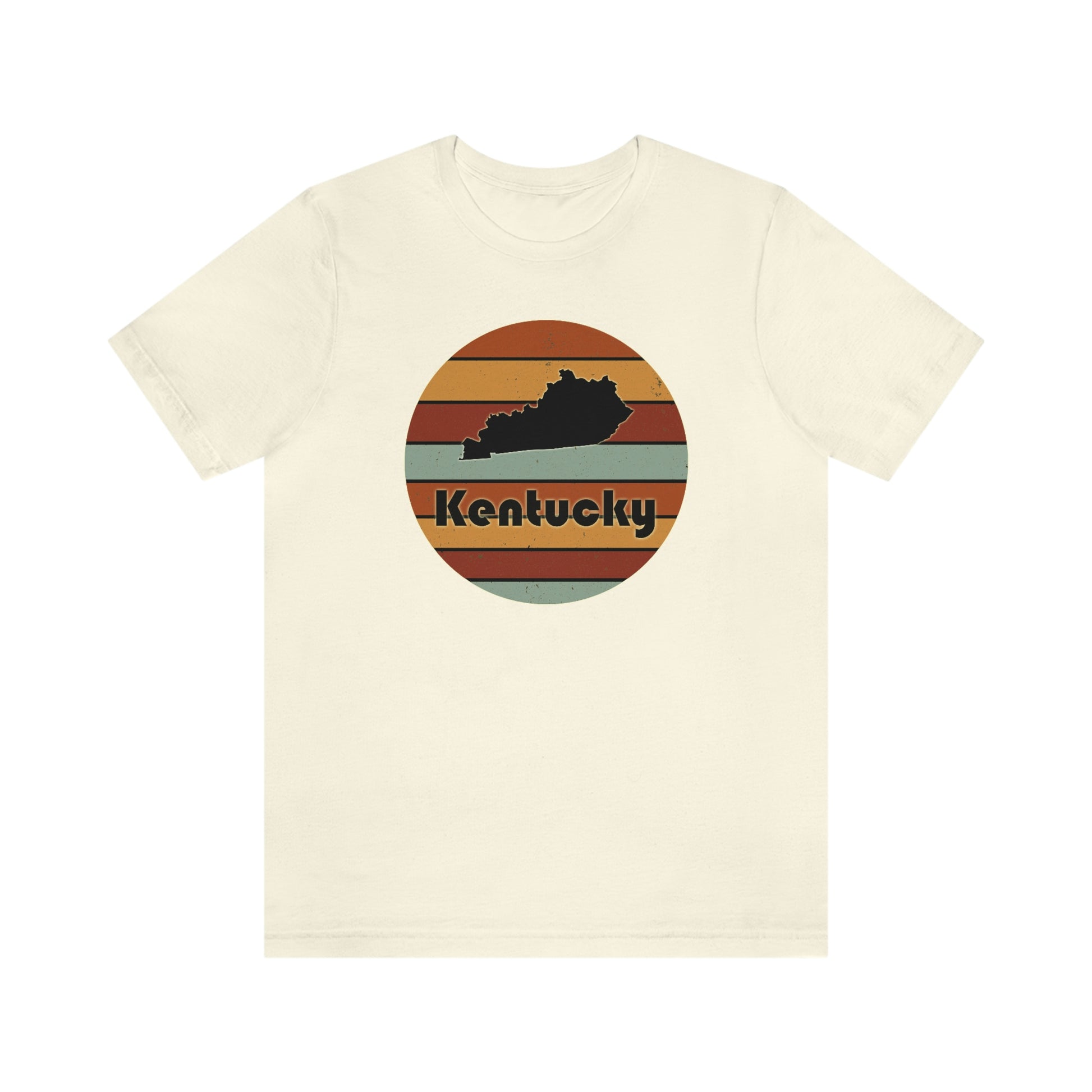 Show off your love and pride in Kentucky with this classic unisex short sleeve t-shirt showing shape of Kentucky over a retro sunset background with the name of the state written underneath it. This tee fits like a well-loved favorite. Soft cotton and quality print make you fall in love with it over and over again. These t-shirts have ribbed knit collars to bolster shaping. The shoulders have taping for better fit over time. Dual side seams hold the garment's shape for longer.