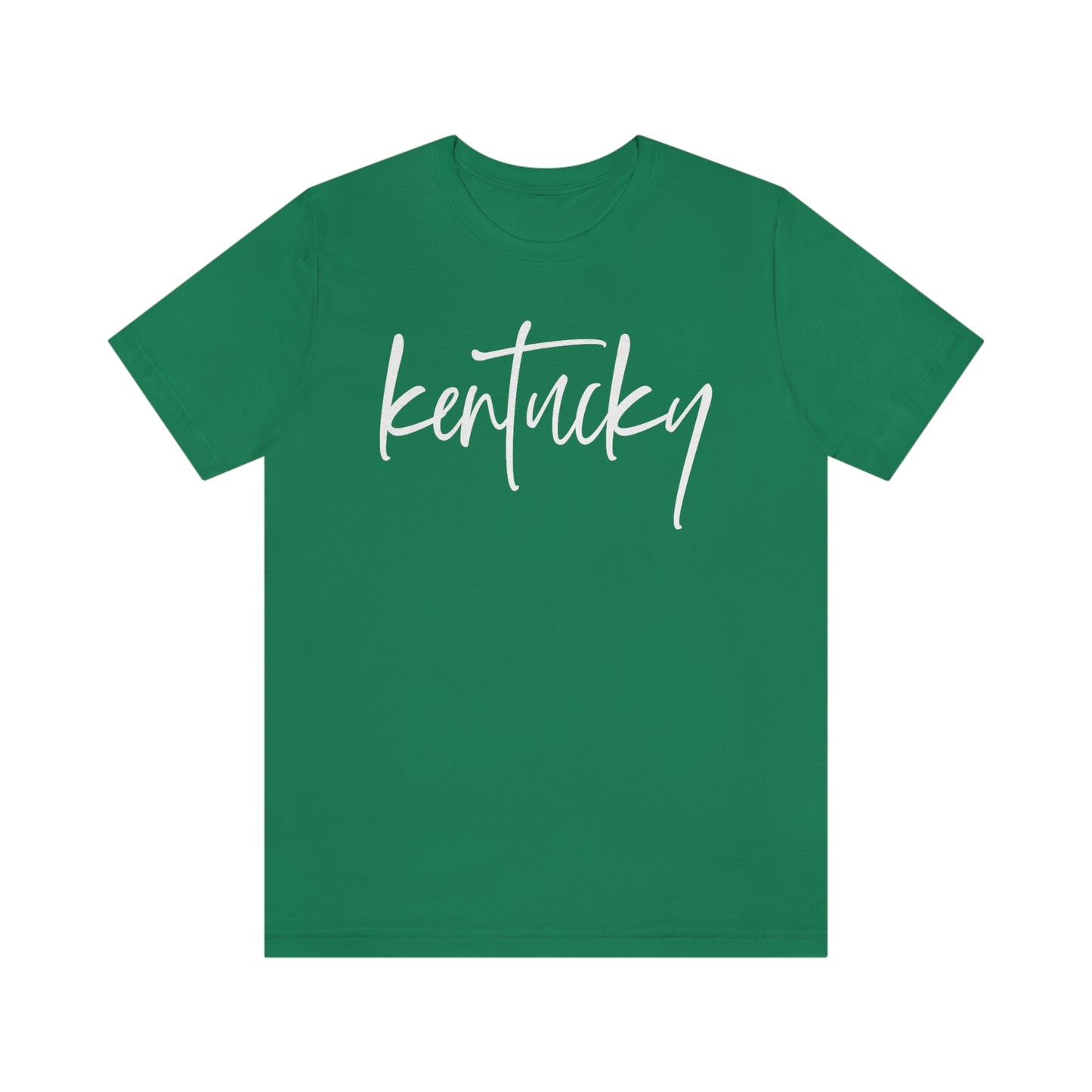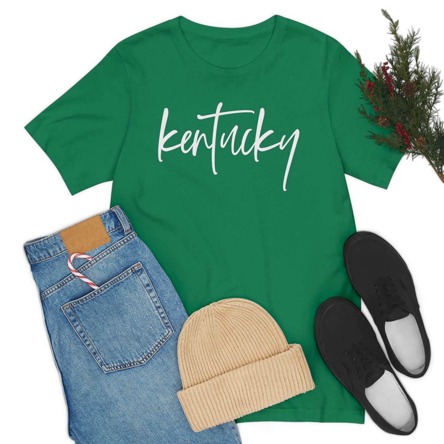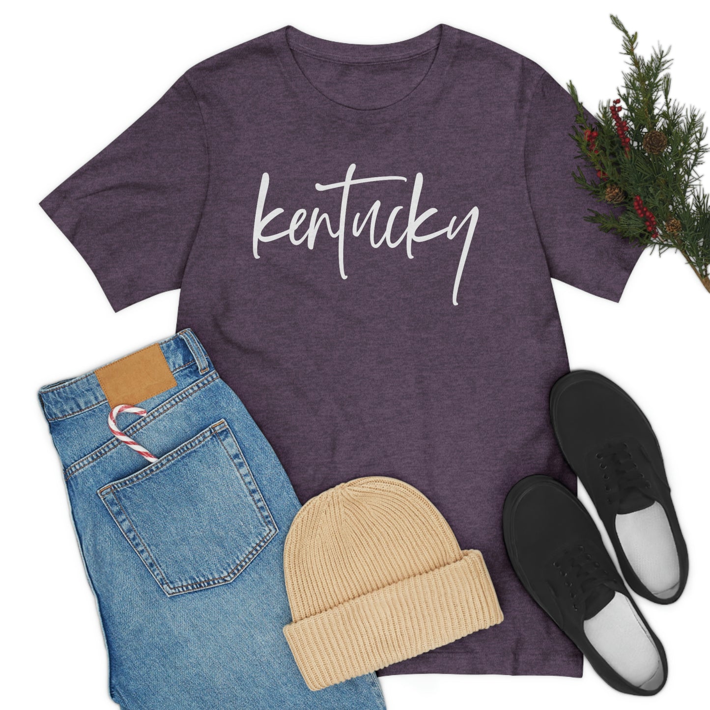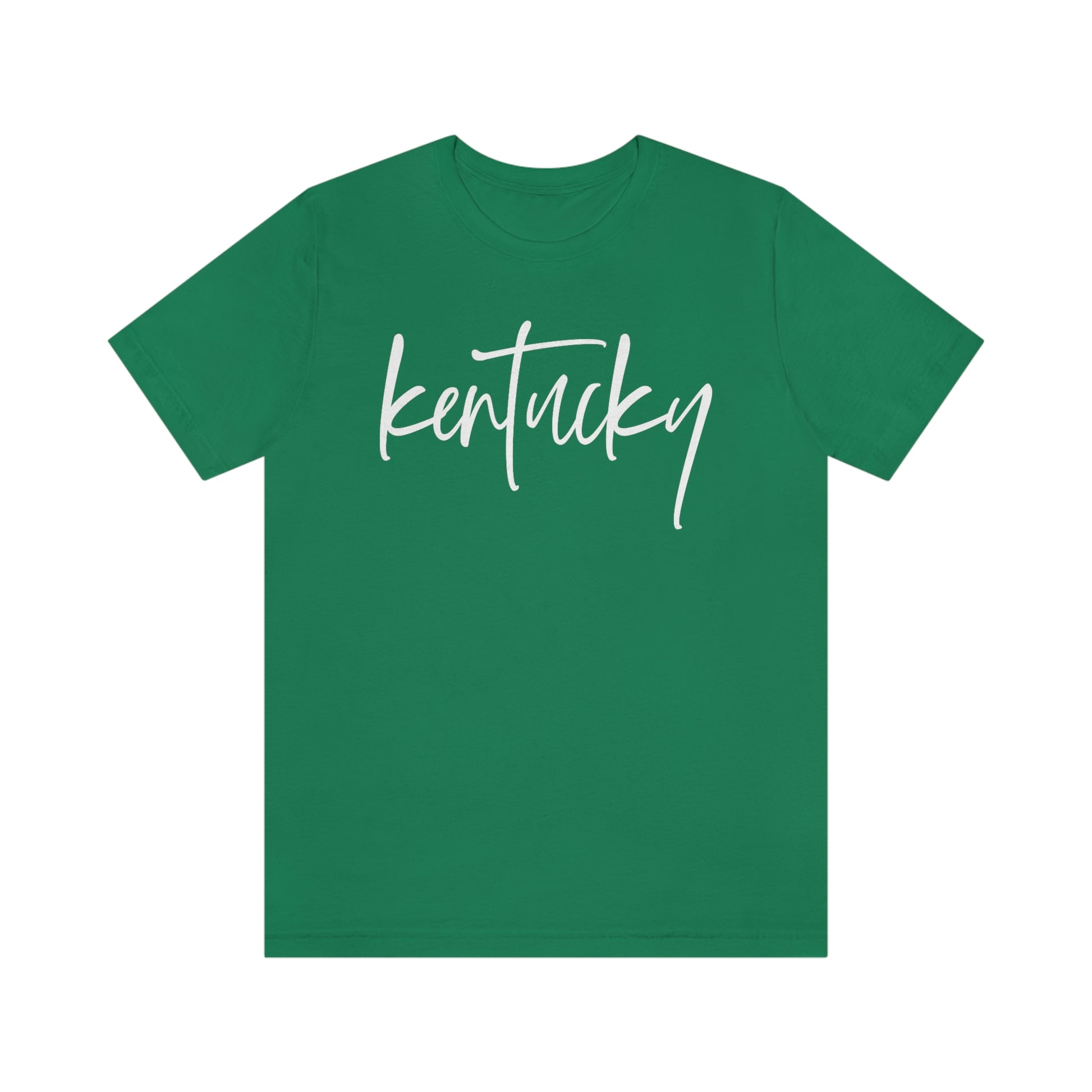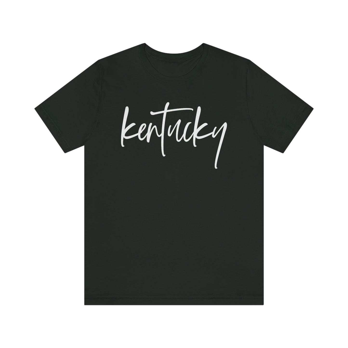 Show off your love and pride in Kentucky with this classic unisex short sleeve t-shirt showing Kentucky written in white script. This tee fits like a well-loved favorite. Soft cotton and quality print make you fall in love with it over and over again. These t-shirts have ribbed knit collars to bolster shaping. The shoulders have taping for better fit over time. Dual side seams hold the garment's shape for longer.