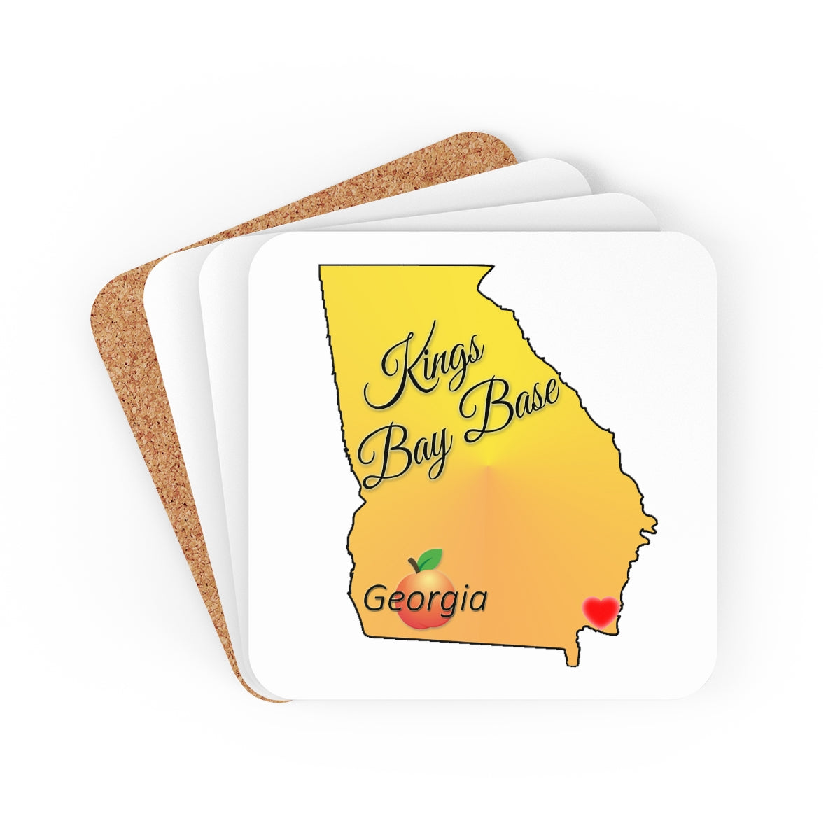 This coaster set comes with 4 coasters in one size. They are made with a high-gloss top and feature a cork back to prevent sliding.