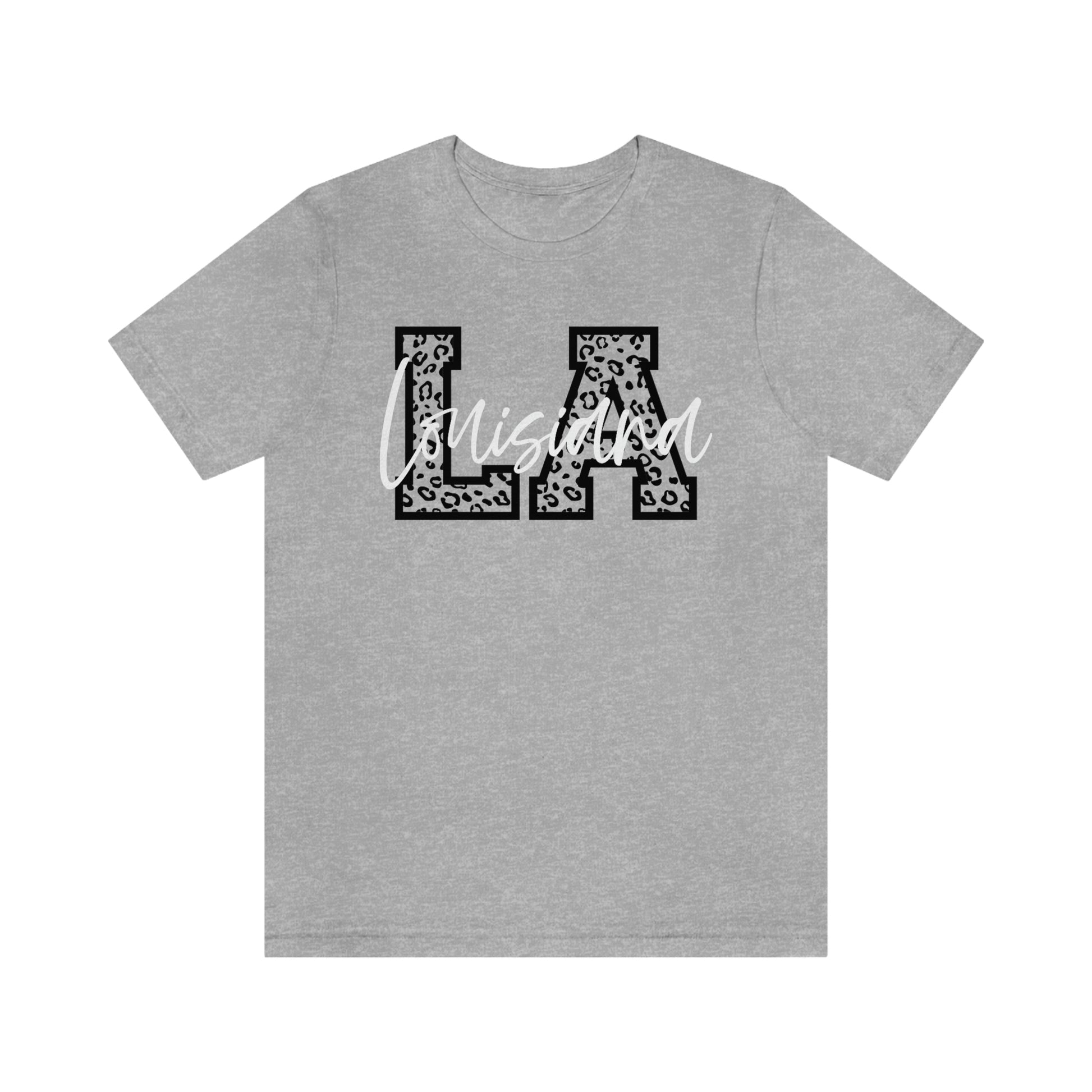 Show off your love and pride in Louisiana with this classic unisex short sleeve t-shirt showing the letters LA in leopard print letters with Louisiana in white script. This tee fits like a well-loved favorite. Soft cotton and quality print make you fall in love with it over and over again. These t-shirts have ribbed knit collars to bolster shaping. The shoulders have taping for better fit over time. Dual side seams hold the garment's shape for longer.