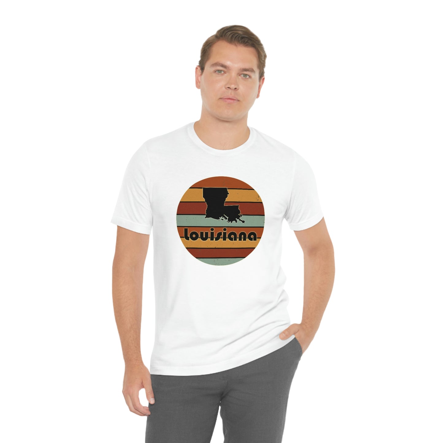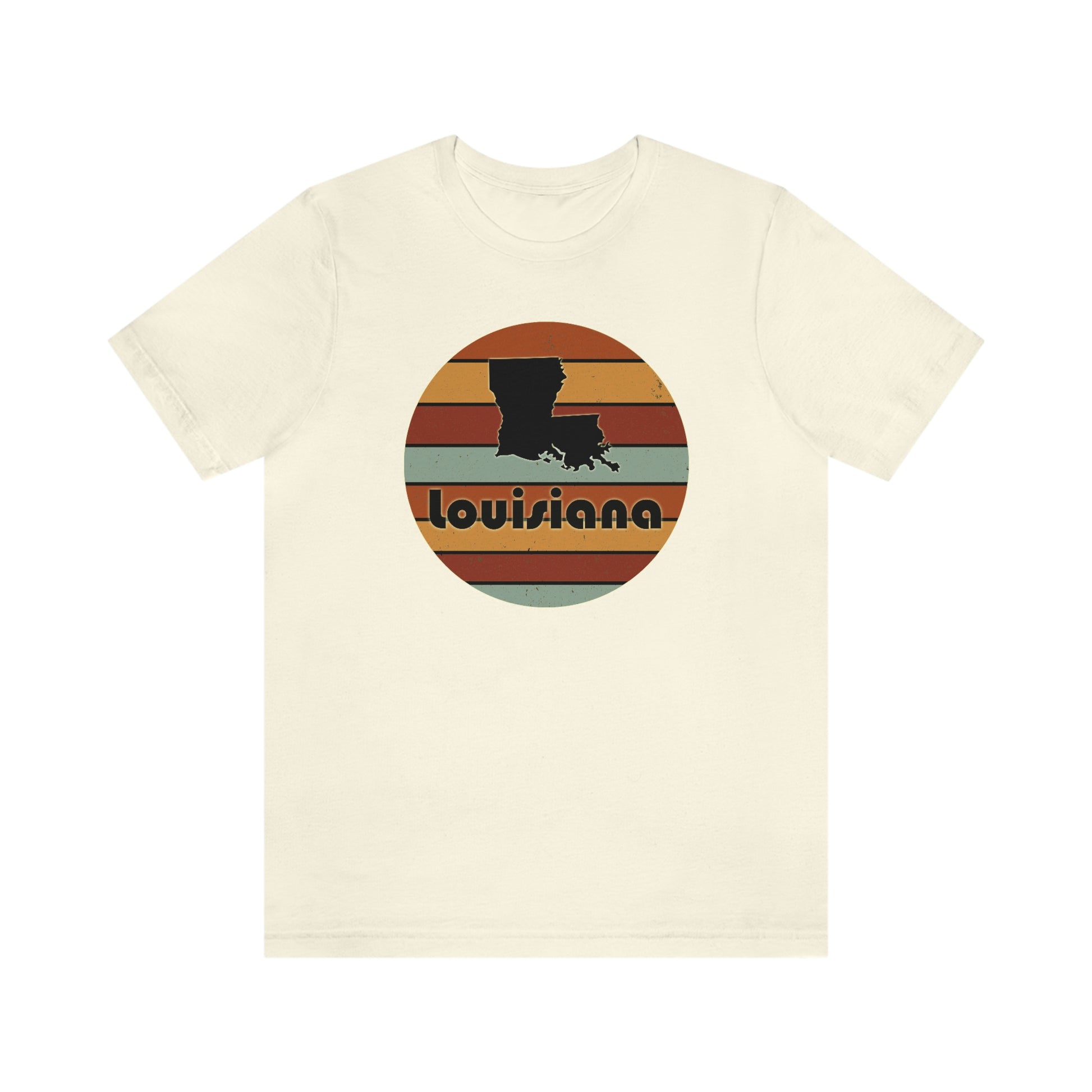 Show off your love and pride in Louisiana with this classic unisex short sleeve t-shirt showing shape of Louisiana over a retro sunset background with the name of the state written underneath it. This tee fits like a well-loved favorite. Soft cotton and quality print make you fall in love with it over and over again. These t-shirts have ribbed knit collars to bolster shaping. The shoulders have taping for better fit over time. Dual side seams hold the garment's shape for longer.