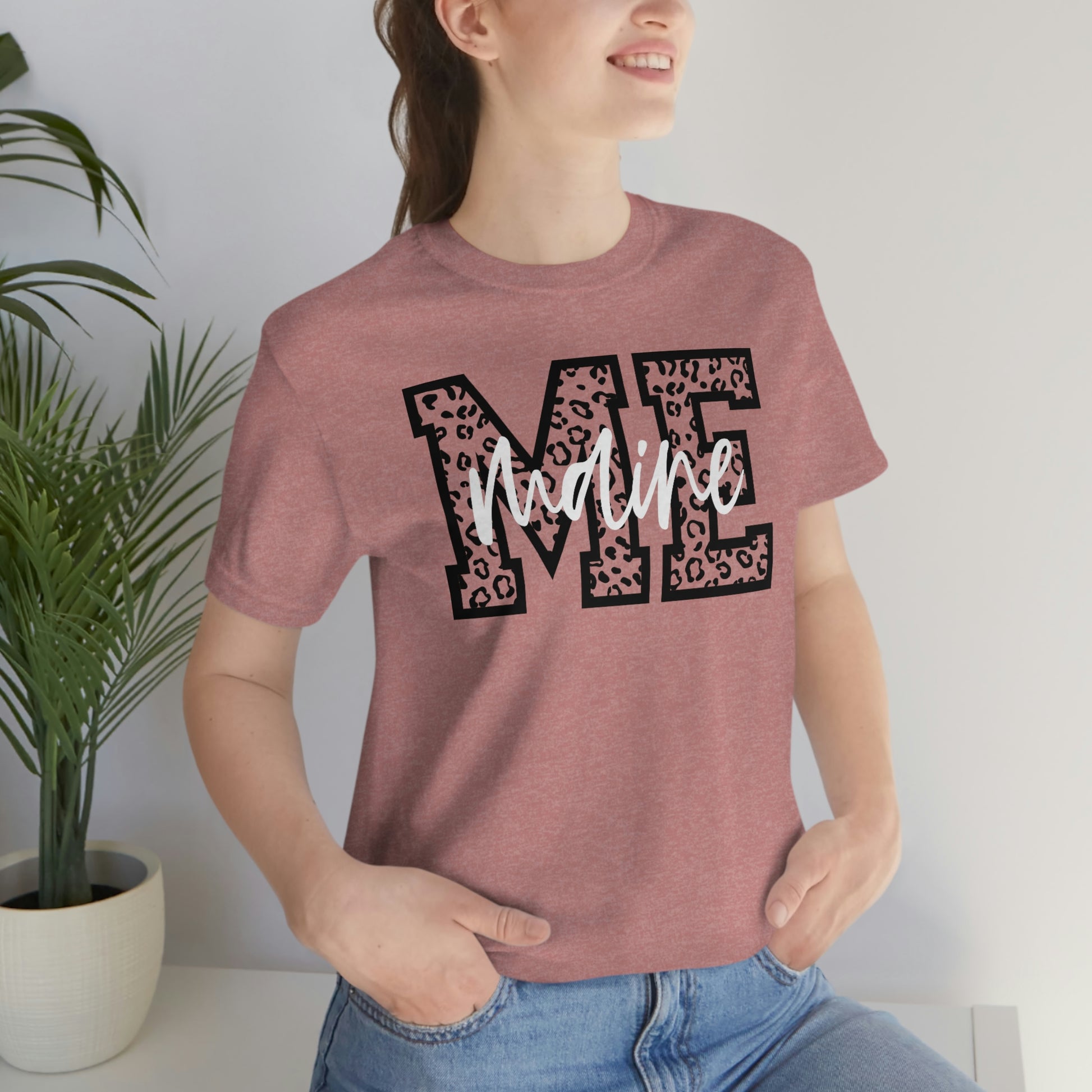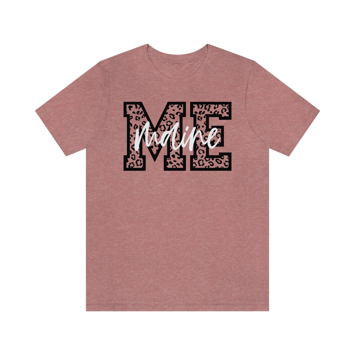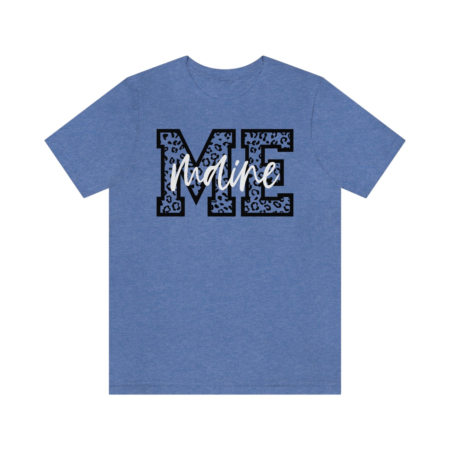 Show off your love and pride in Maine with this classic unisex short sleeve t-shirt showing the letters ME in leopard print letters with Maine in white script. This tee fits like a well-loved favorite. Soft cotton and quality print make you fall in love with it over and over again. These t-shirts have ribbed knit collars to bolster shaping. The shoulders have taping for better fit over time. Dual side seams hold the garment's shape for longer.