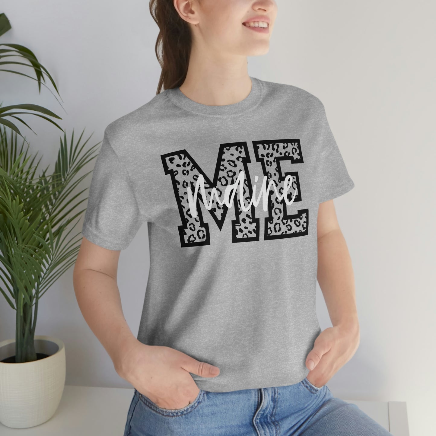 Maine ME Leopard Print Letters White Script Short Sleeve T-shirt