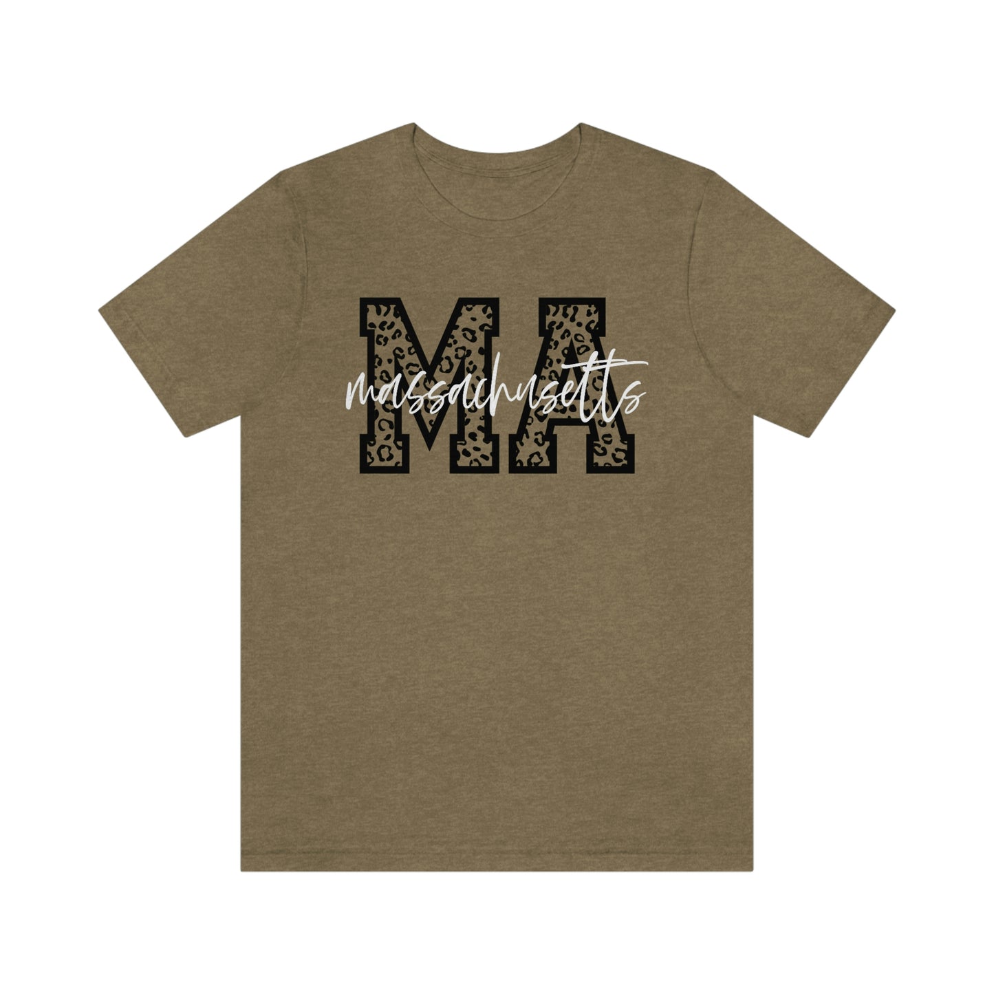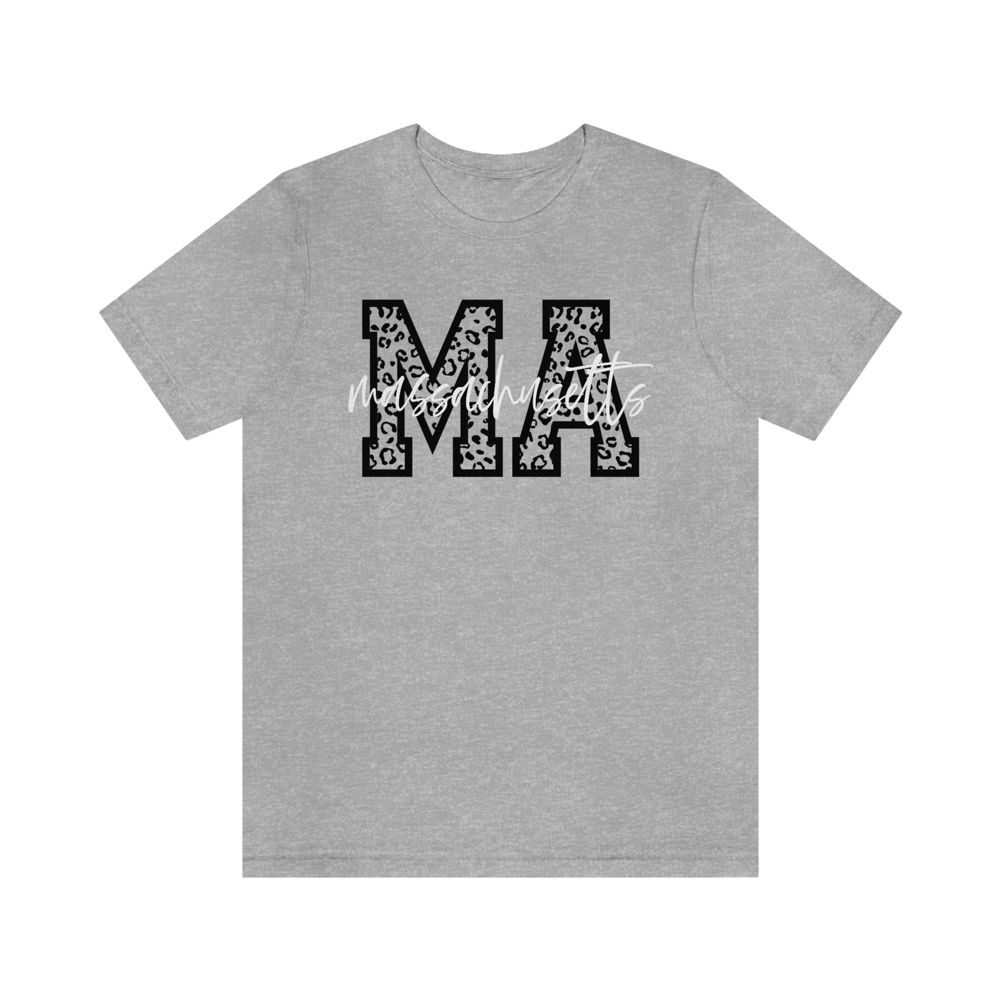 Show off your love and pride in Massachusetts with this classic unisex short sleeve t-shirt showing the letters MA in leopard print letters with Massachusetts in white script. This tee fits like a well-loved favorite. Soft cotton and quality print make you fall in love with it over and over again. These t-shirts have ribbed knit collars to bolster shaping. The shoulders have taping for better fit over time. Dual side seams hold the garment's shape for longer.