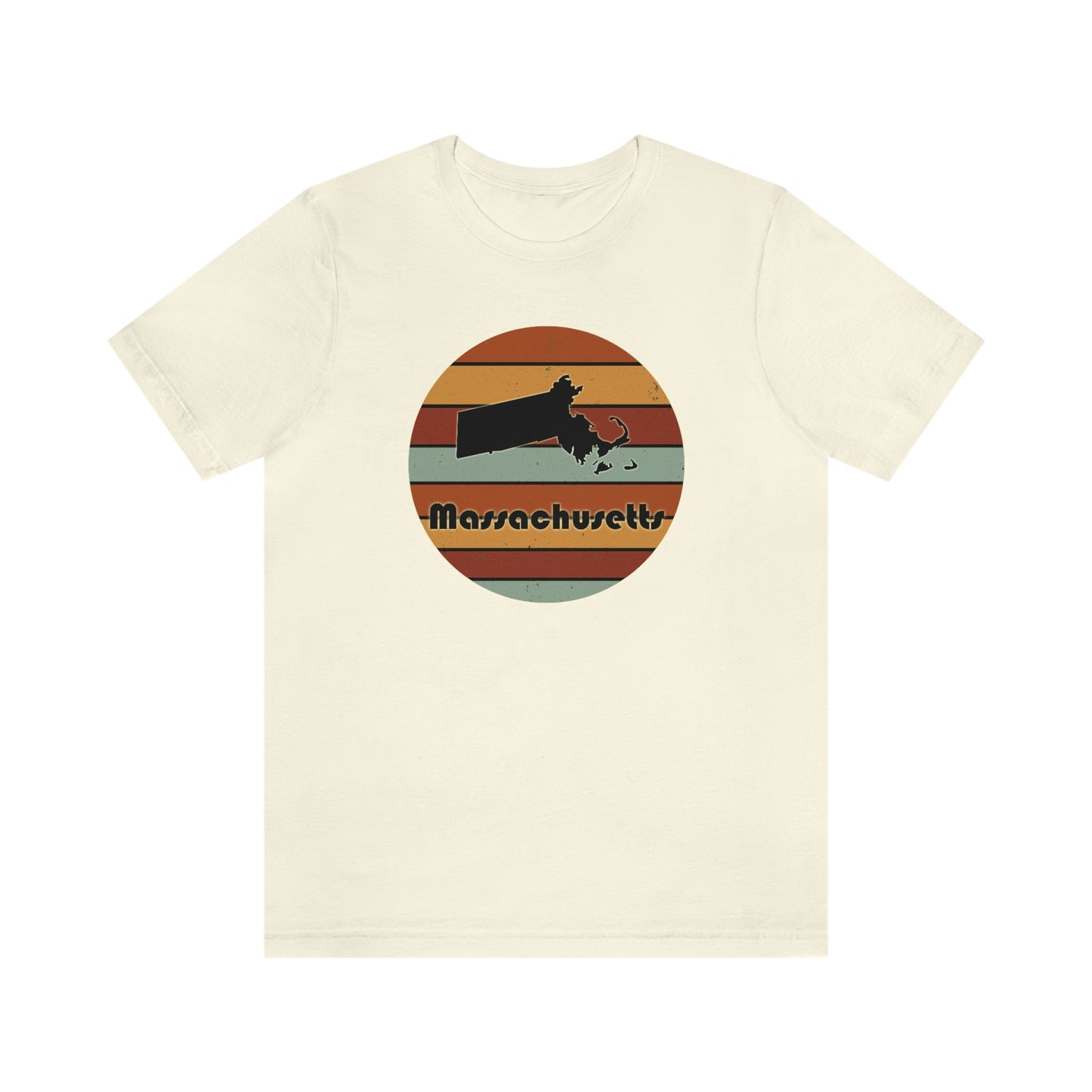 Show off your love and pride in Massachusetts with this classic unisex short sleeve t-shirt showing shape of Massachusetts over a retro sunset background with the name of the state written underneath it. This tee fits like a well-loved favorite. Soft cotton and quality print make you fall in love with it over and over again. These t-shirts have ribbed knit collars to bolster shaping. The shoulders have taping for better fit over time. Dual side seams hold the garment's shape for longer.