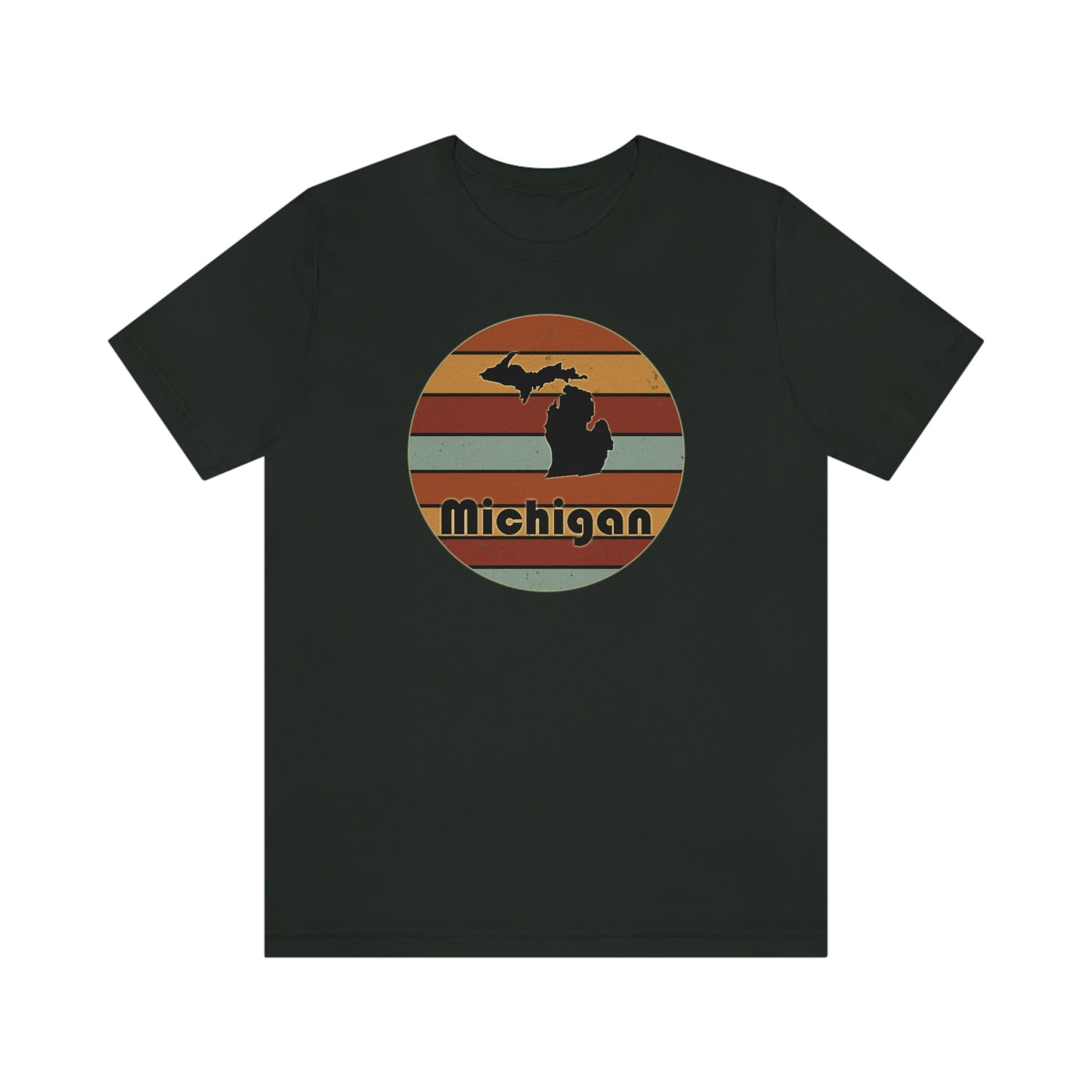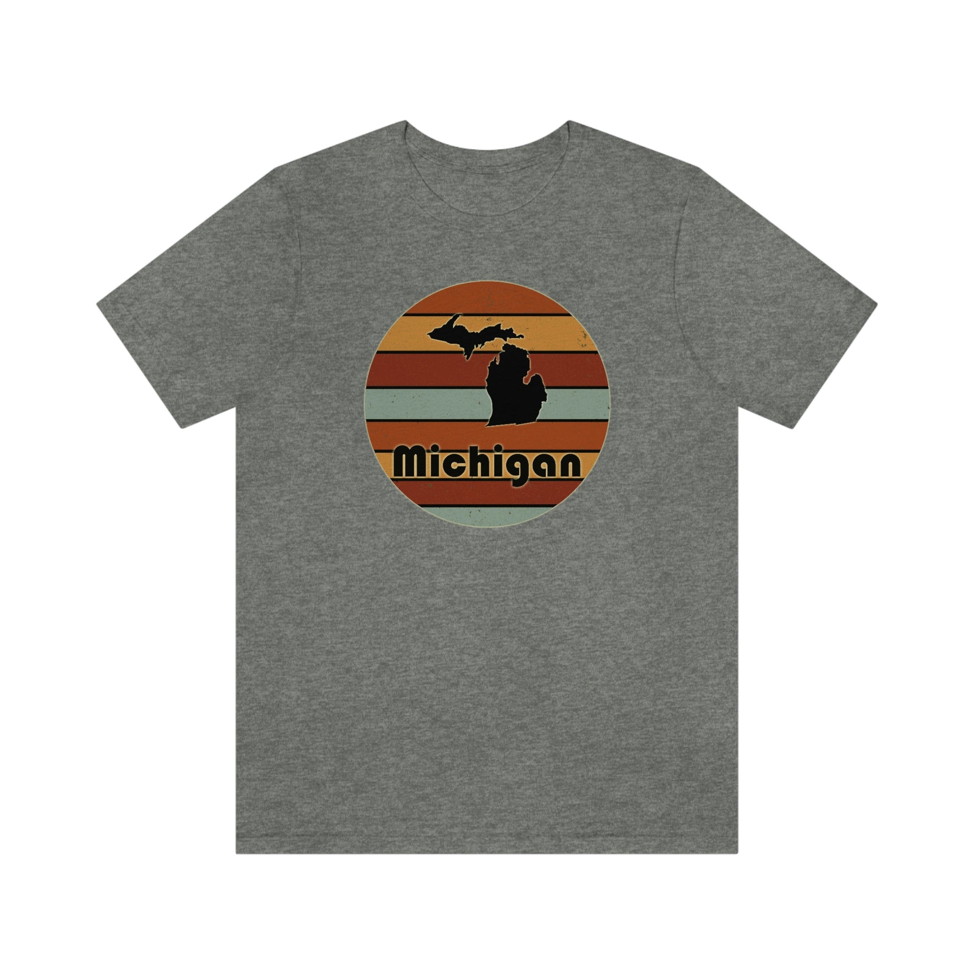 Show off your love and pride in Michigan with this classic unisex short sleeve t-shirt showing shape of Michigan over a retro sunset background with the name of the state written underneath it. This tee fits like a well-loved favorite. Soft cotton and quality print make you fall in love with it over and over again. These t-shirts have ribbed knit collars to bolster shaping. The shoulders have taping for better fit over time. Dual side seams hold the garment's shape for longer.