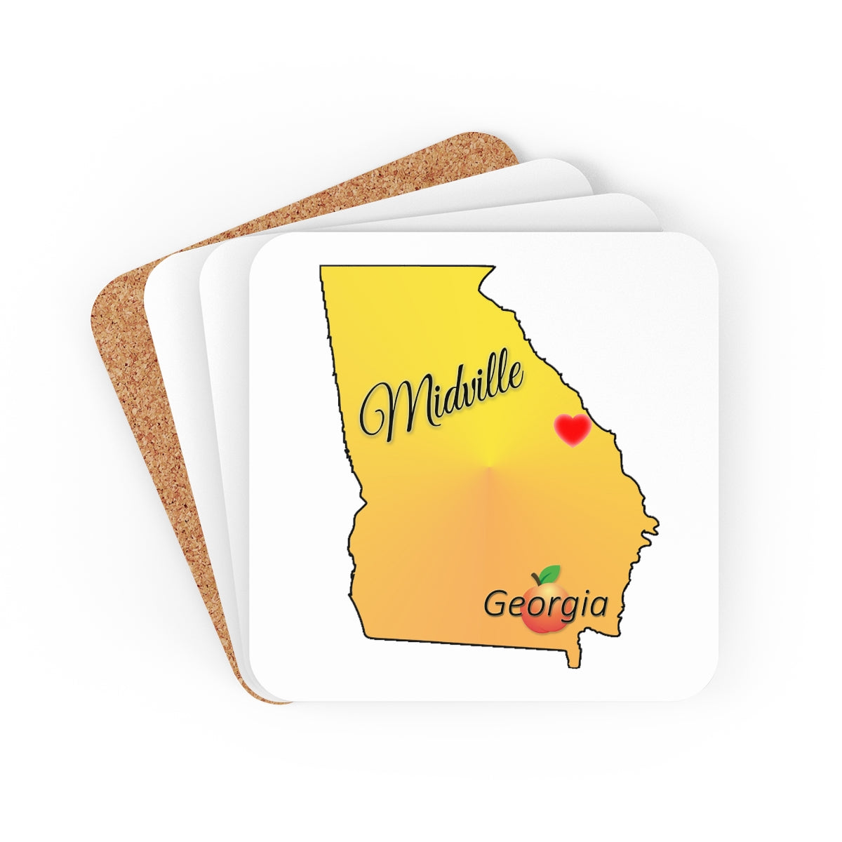 This coaster set comes with 4 coasters in one size. They are made with a high-gloss top and feature a cork back to prevent sliding.