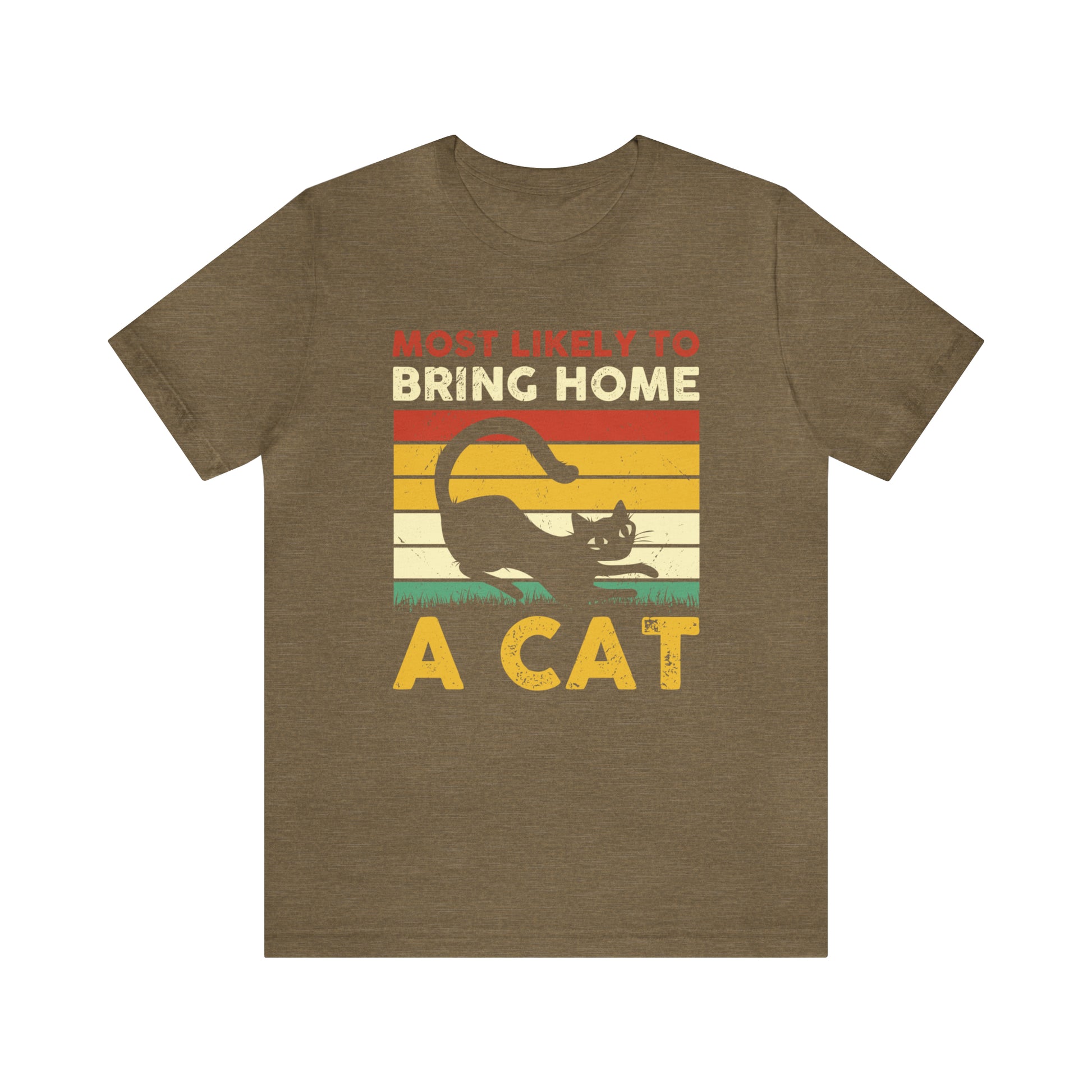 This classic unisex short sleeve cat t-shirt reads Most Likely to Bring Home a Cat. This tee fits like a well-loved favorite. Soft cotton and quality print make you fall in love with it over and over again. These t-shirts have ribbed knit collars to bolster shaping. The shoulders have taping for better fit over time. Dual side seams hold the garment's shape for longer.