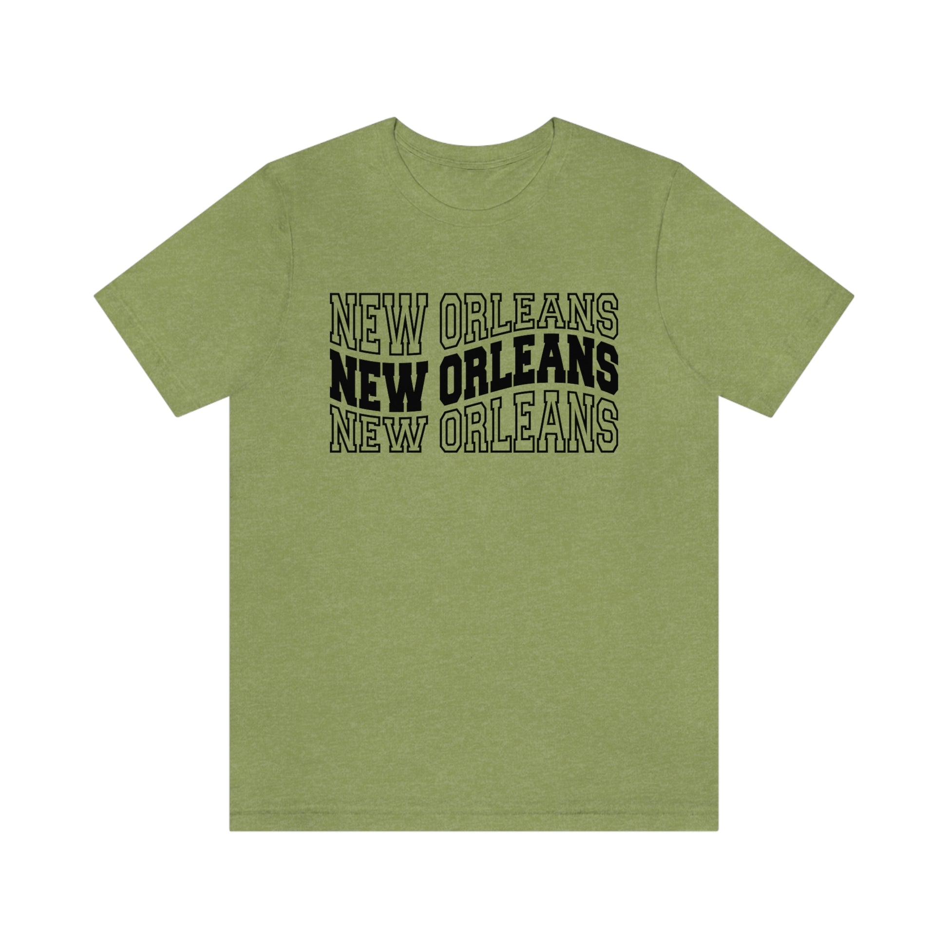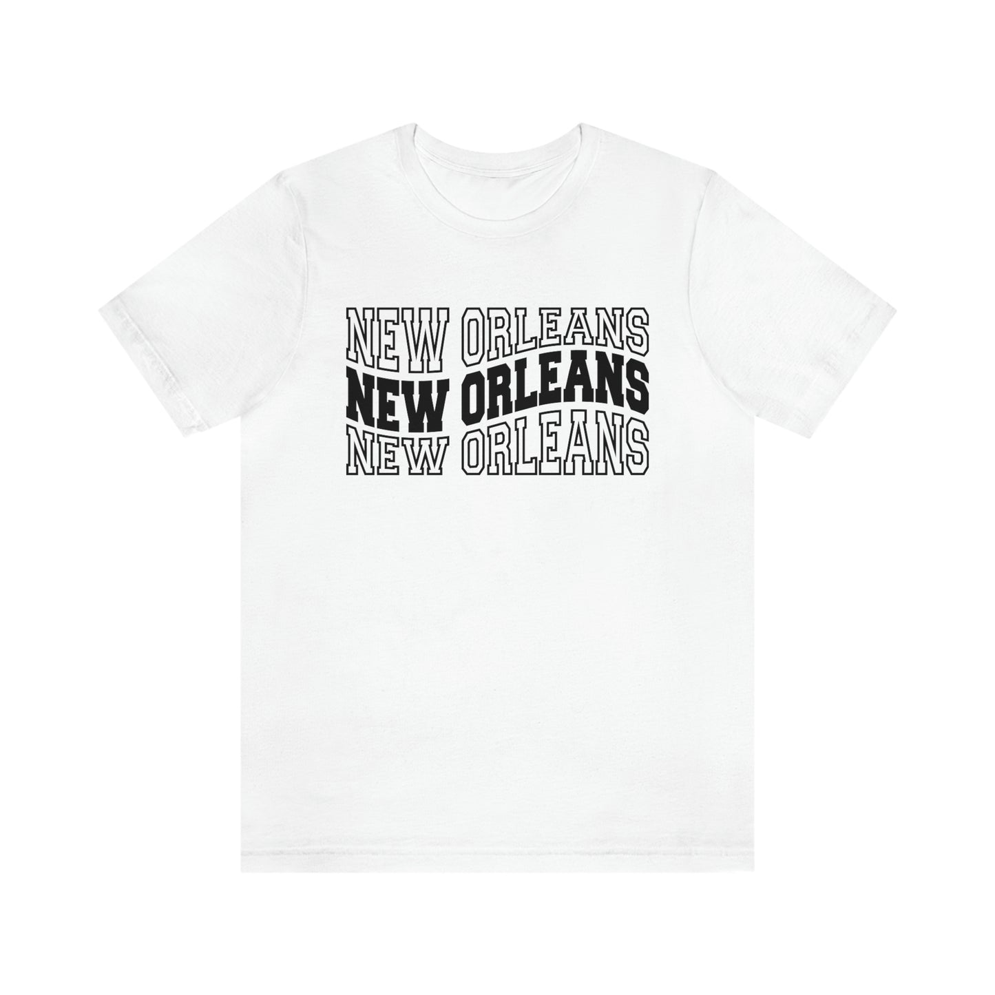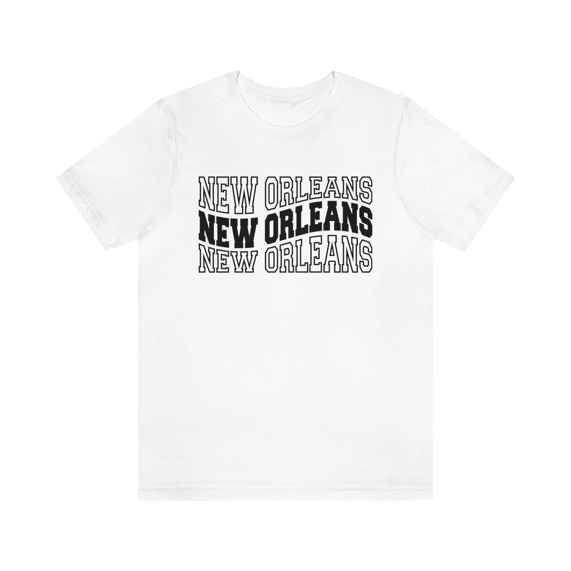 Show off your love and pride in New Orleans with this classic unisex short sleeve t-shirt showing New Orleans written in varsity letters in a triple wave design. This tee fits like a well-loved favorite. Soft cotton and quality print make you fall in love with it over and over again. These t-shirts have ribbed knit collars to bolster shaping. The shoulders have taping for better fit over time. Dual side seams hold the garment's shape for longer.