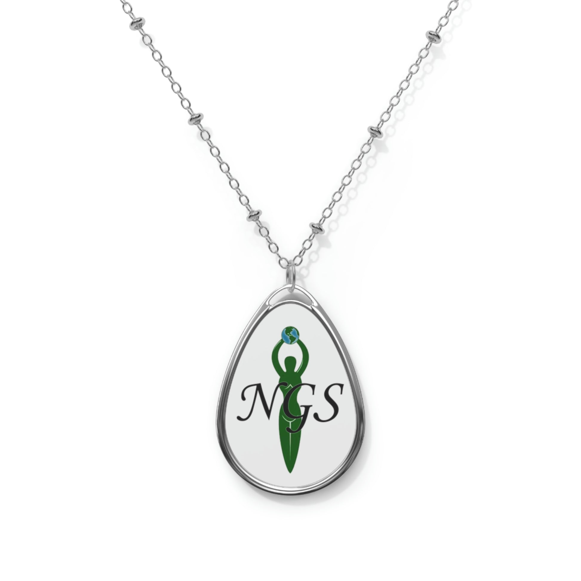 Show your support of North Georgia Solitaries with this white necklace showing a green goddess with NGS across it.