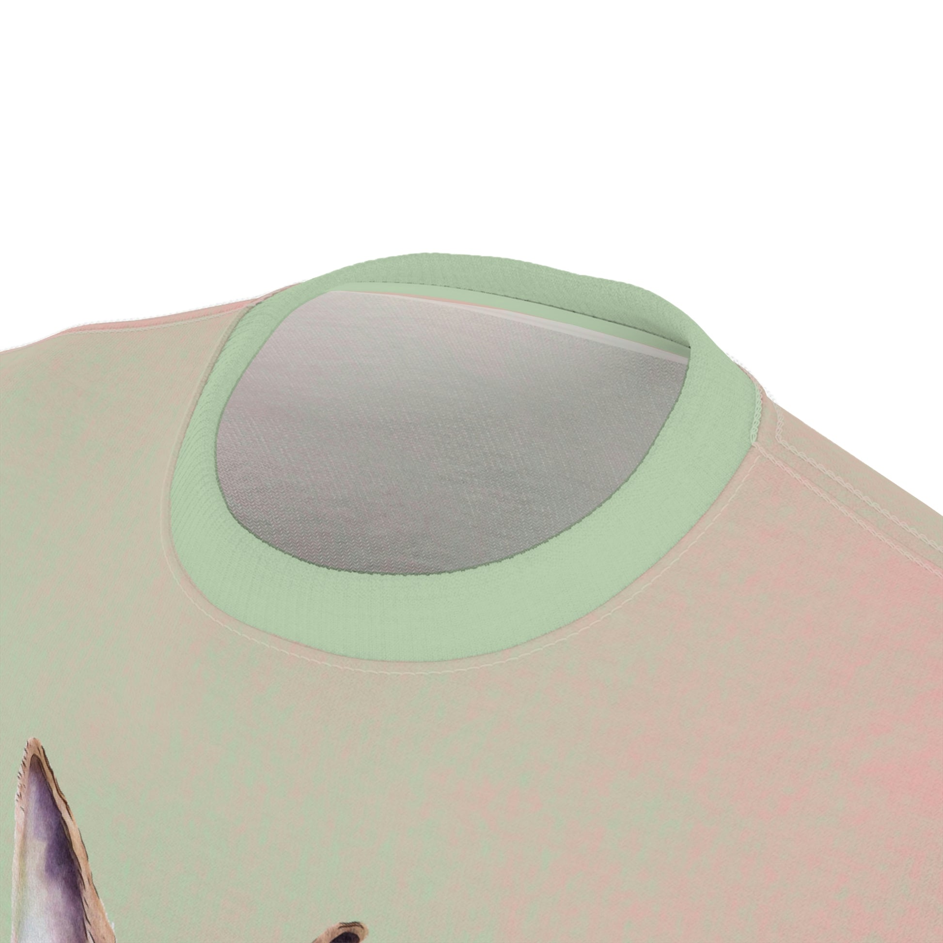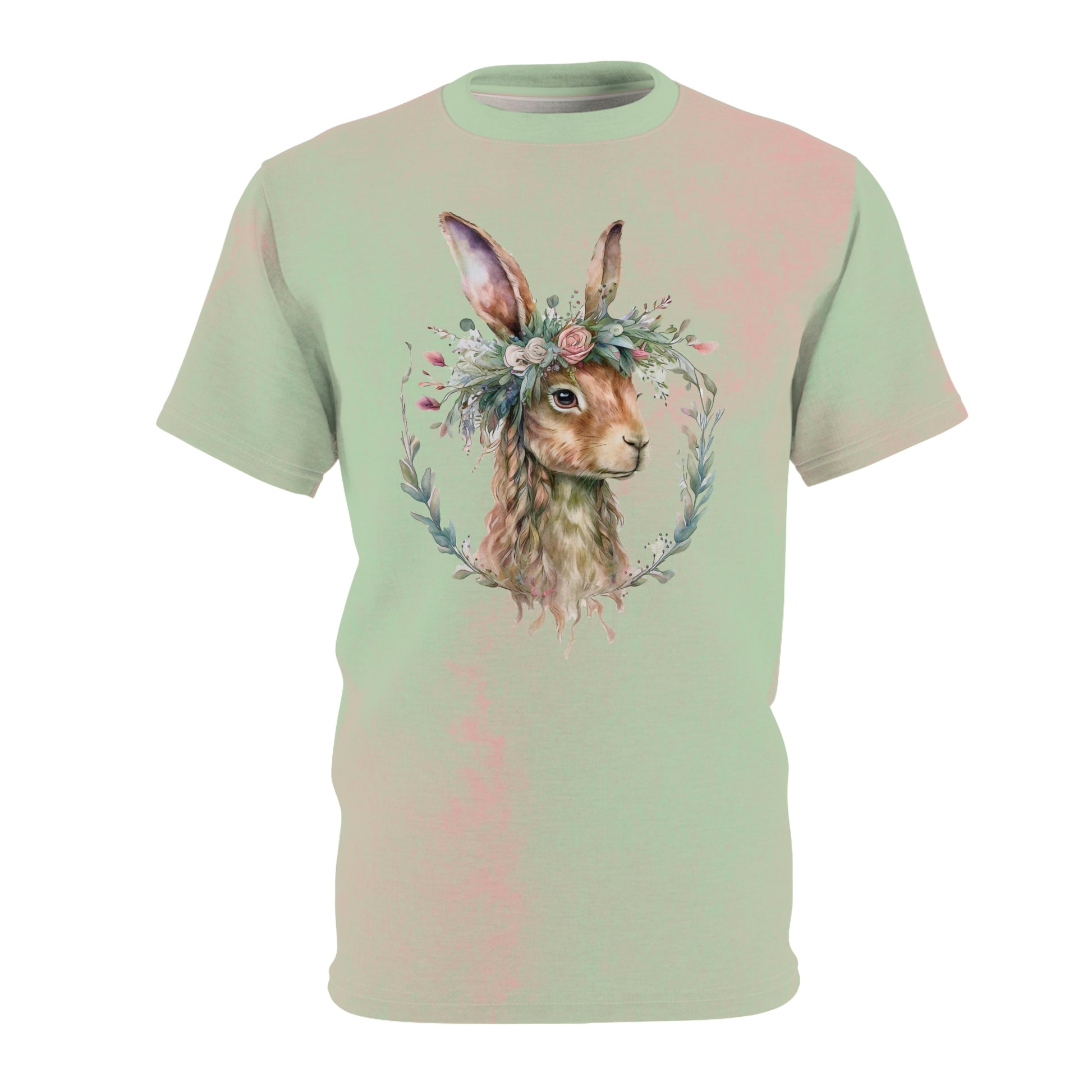 This shirt has a spring watercolor background and shows a rabbit in a spring flower wreath.