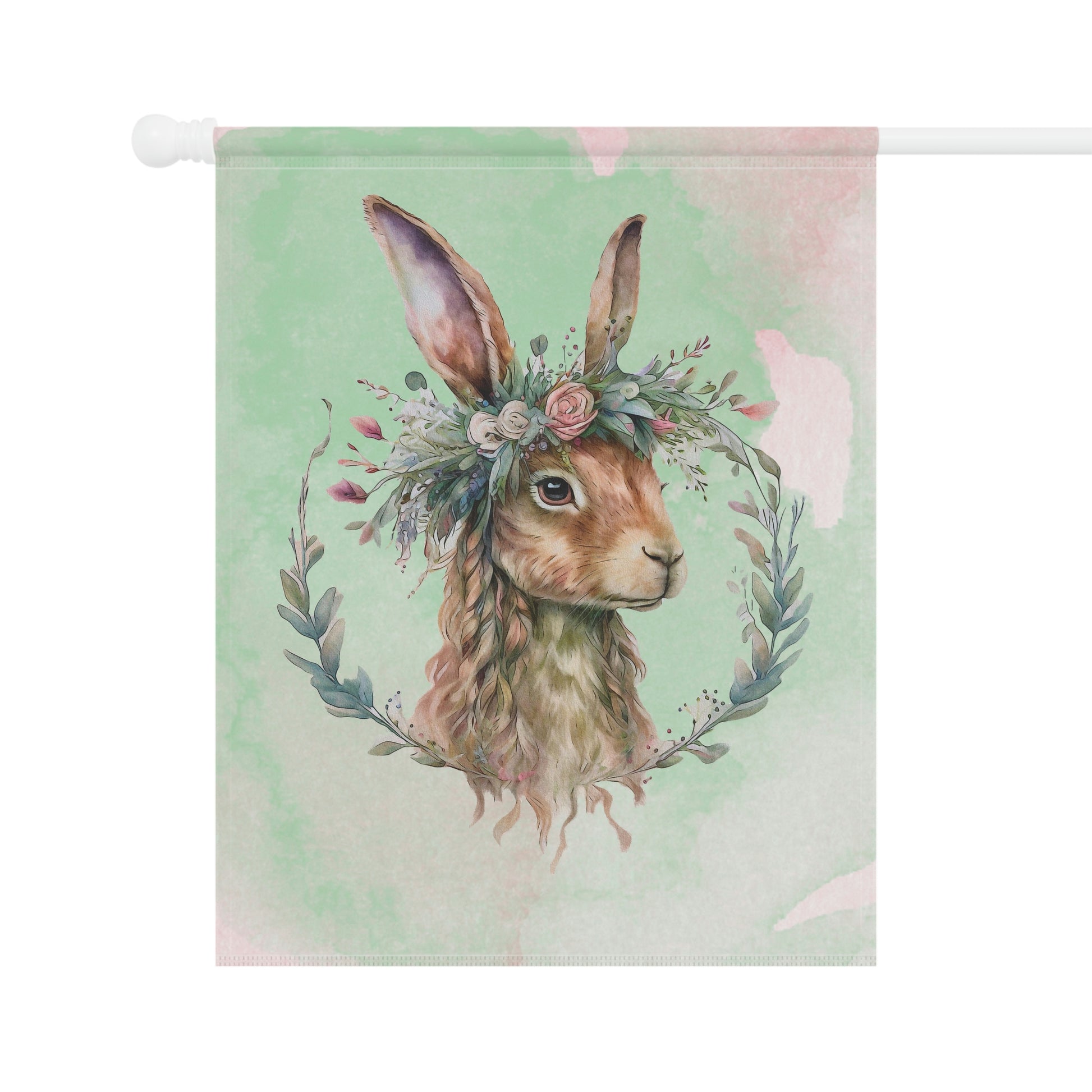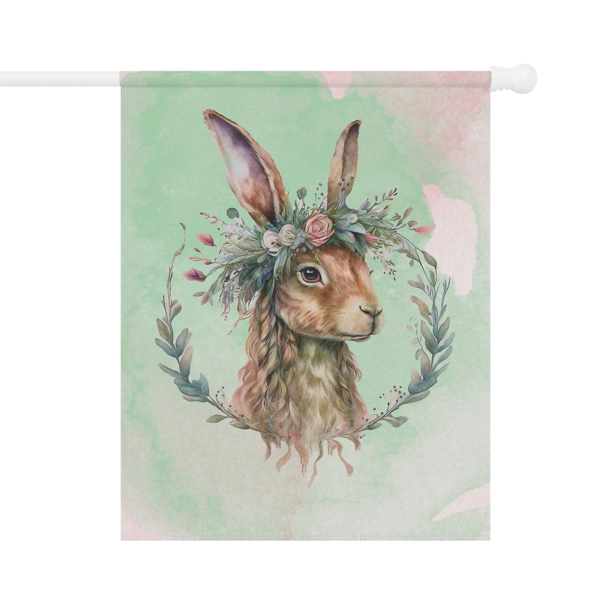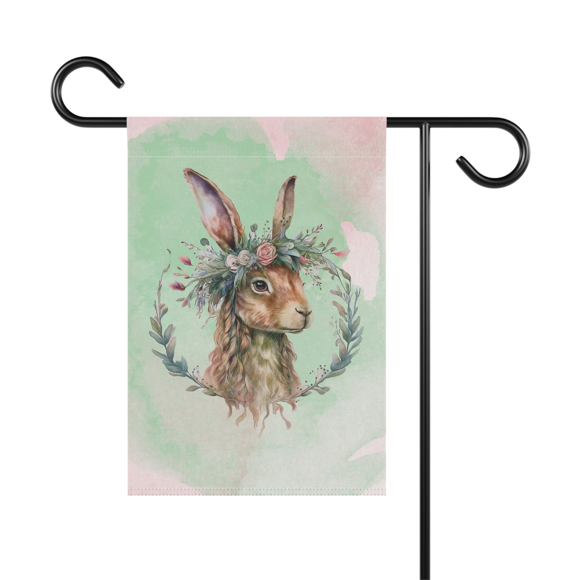 This flag comes in both the garden size and house size and shows a beautiful spring watercolor of a rabbit in a wreath.
