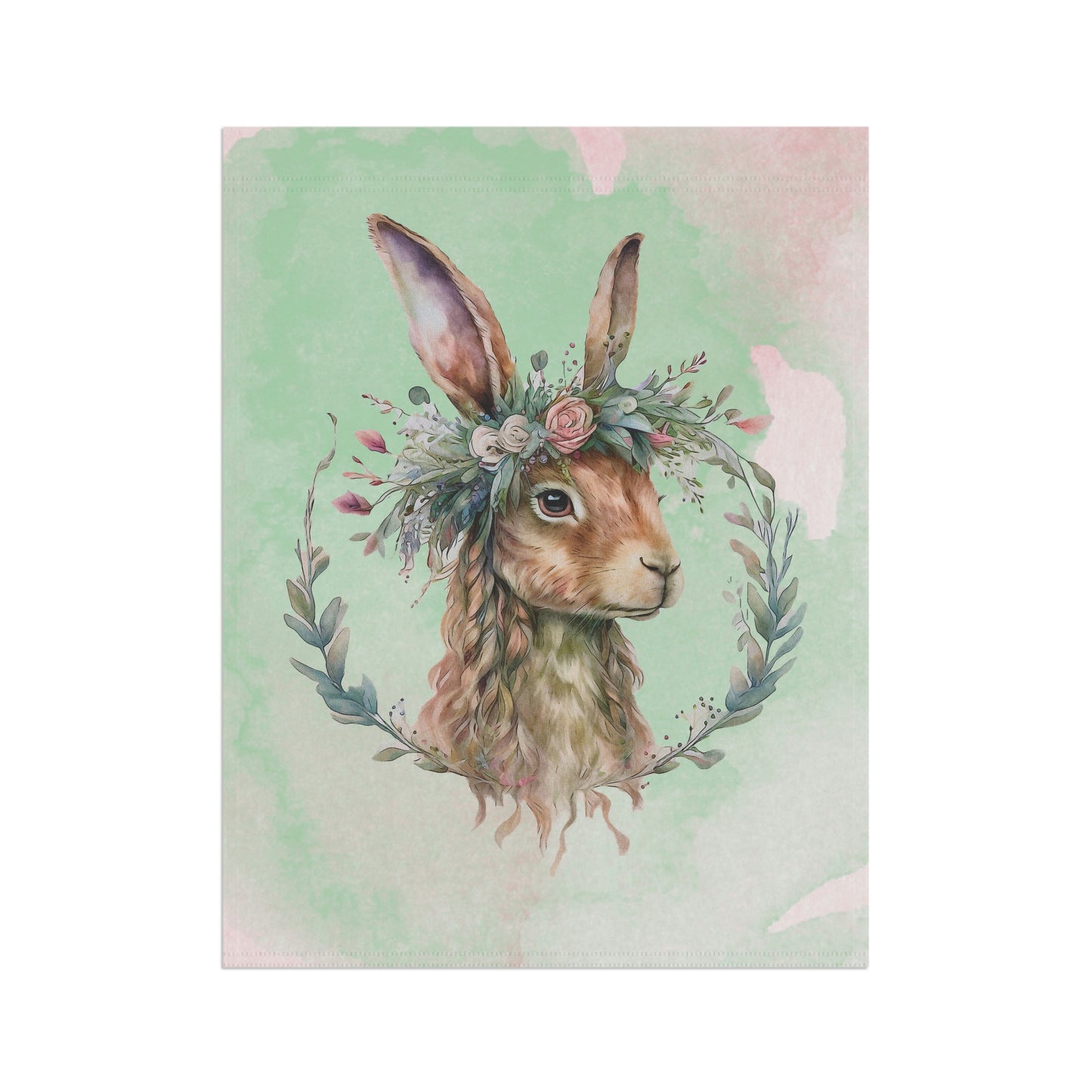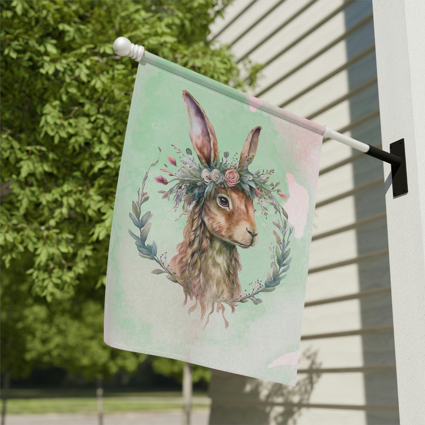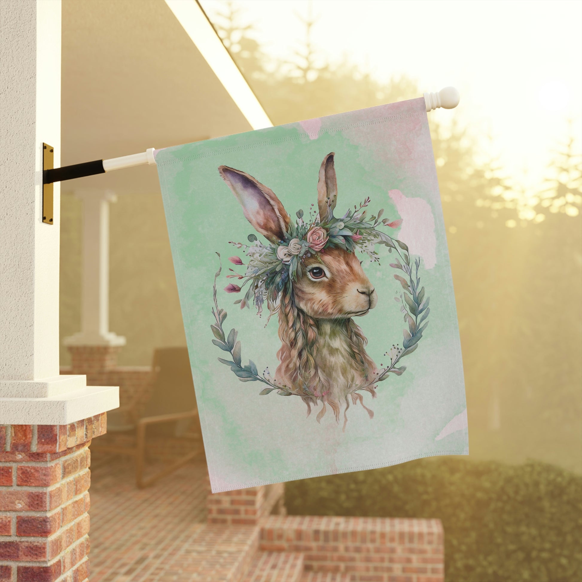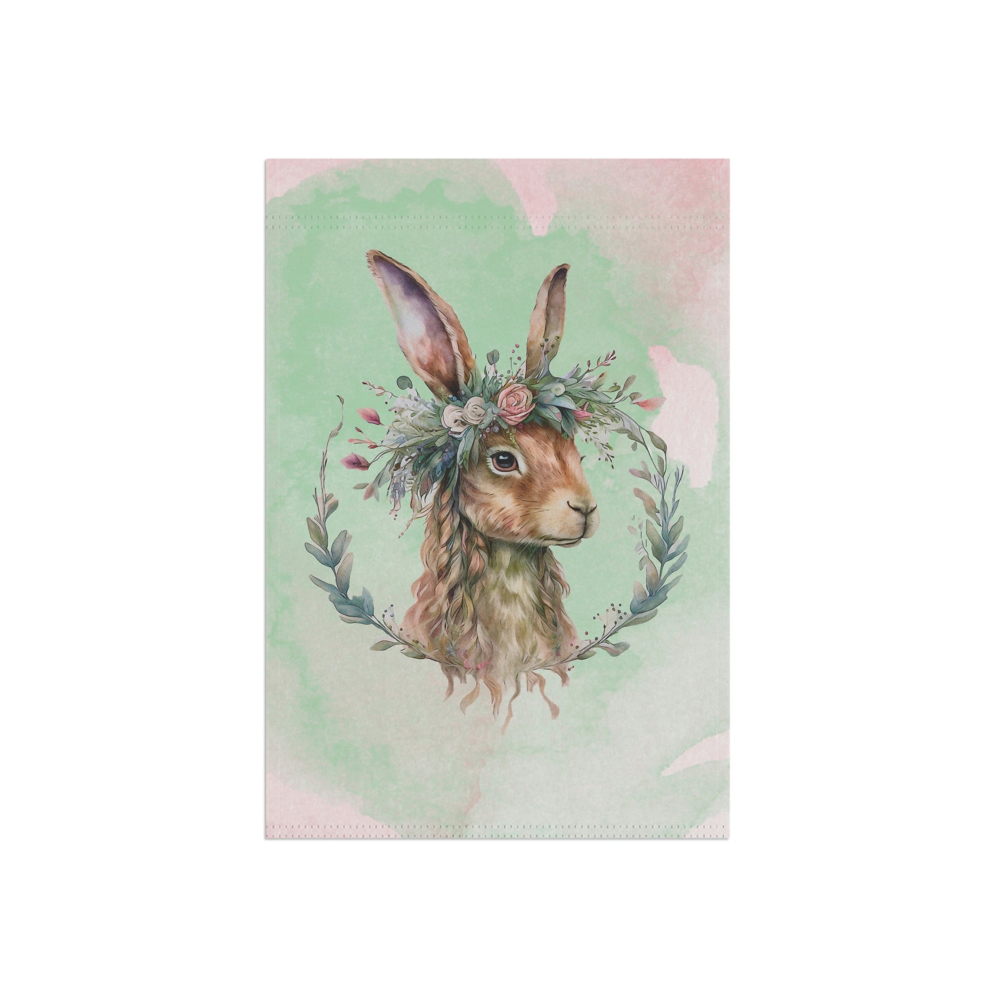 This flag comes in both the garden size and house size and shows a beautiful spring watercolor of a rabbit in a wreath.