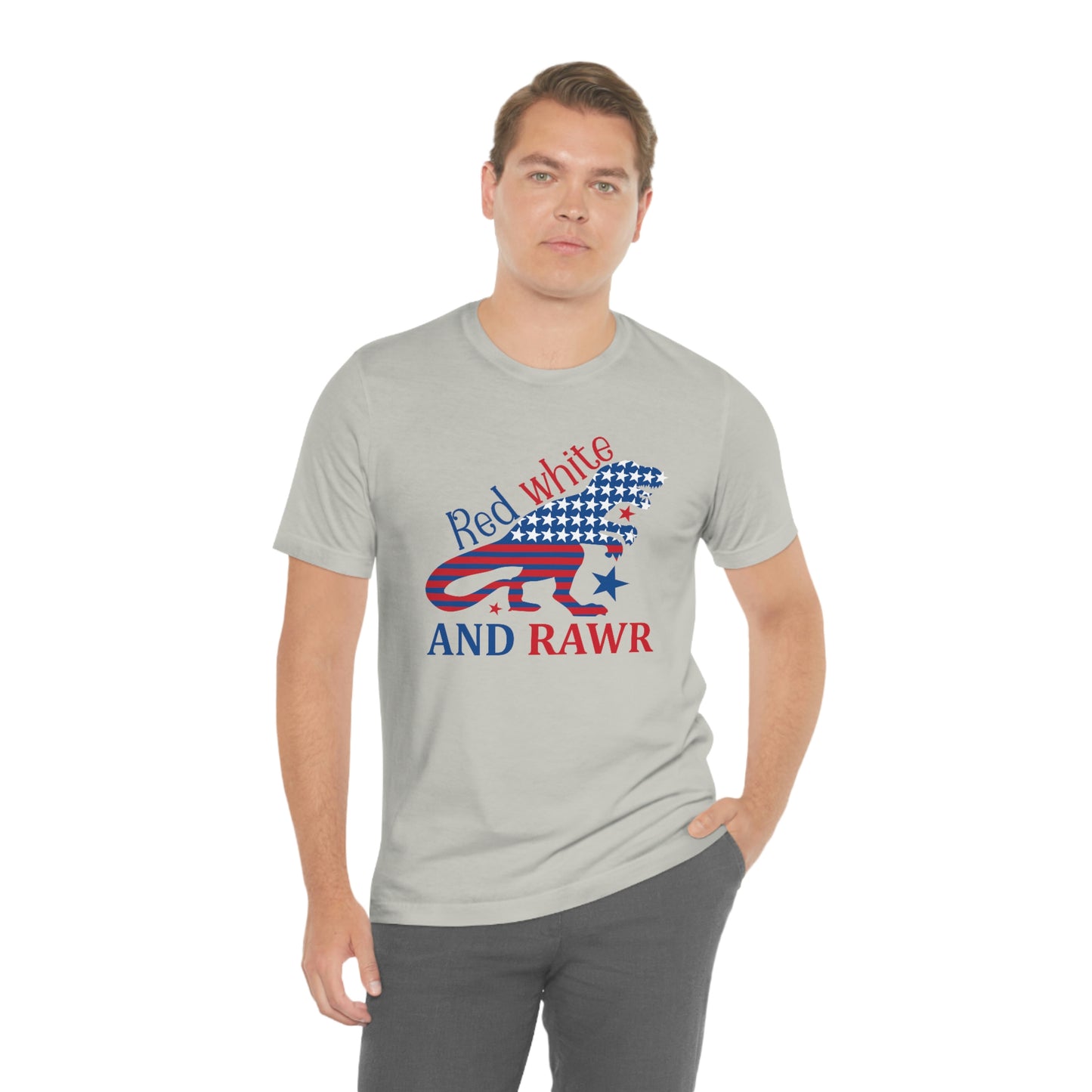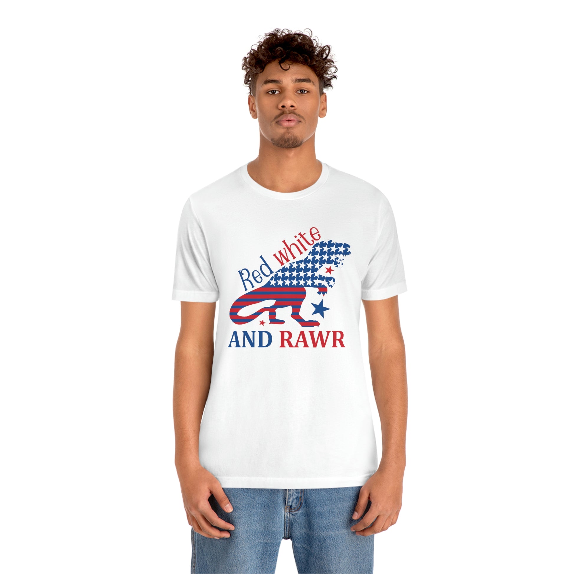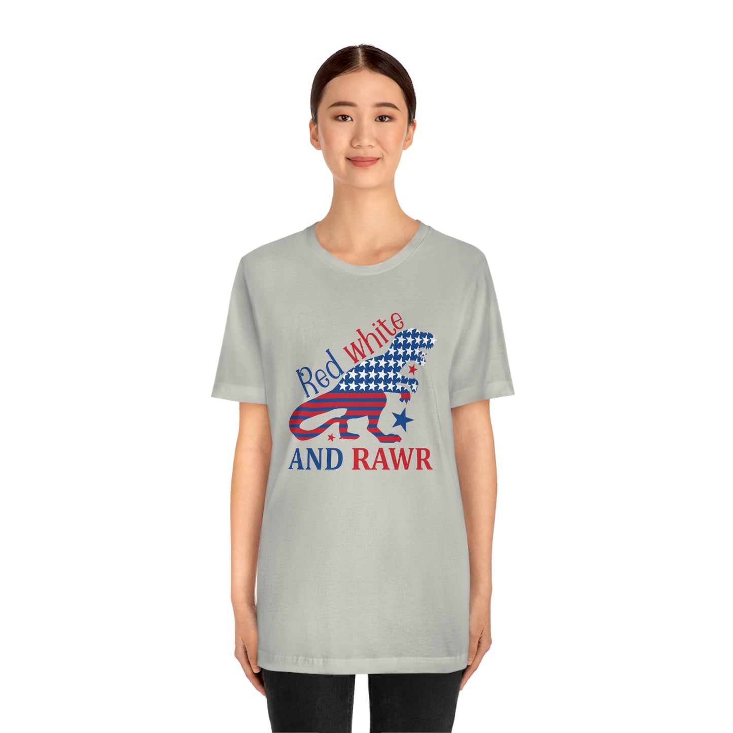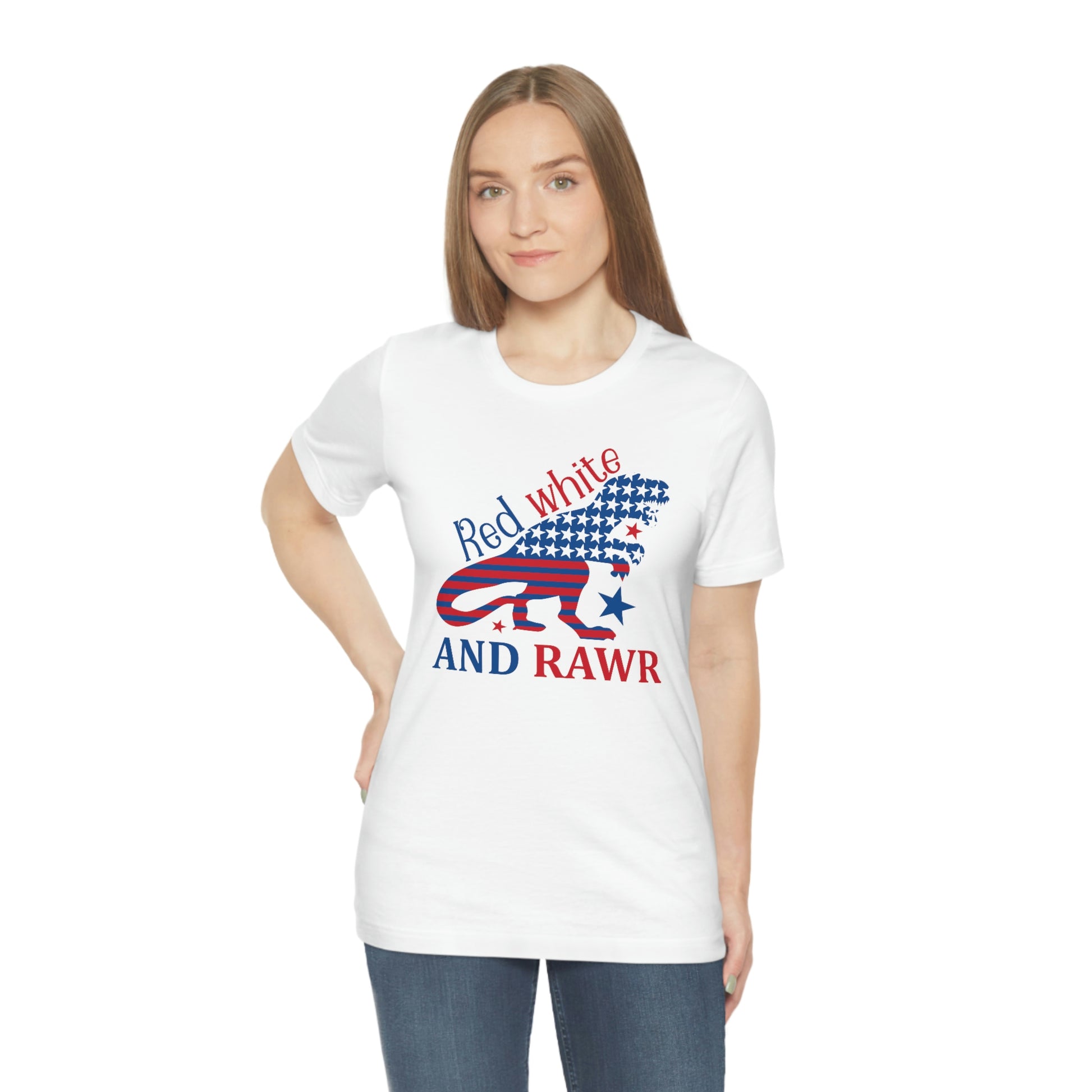 Red White Rawr Dinosaur 4th of July Unisex Jersey Short Sleeve Tee