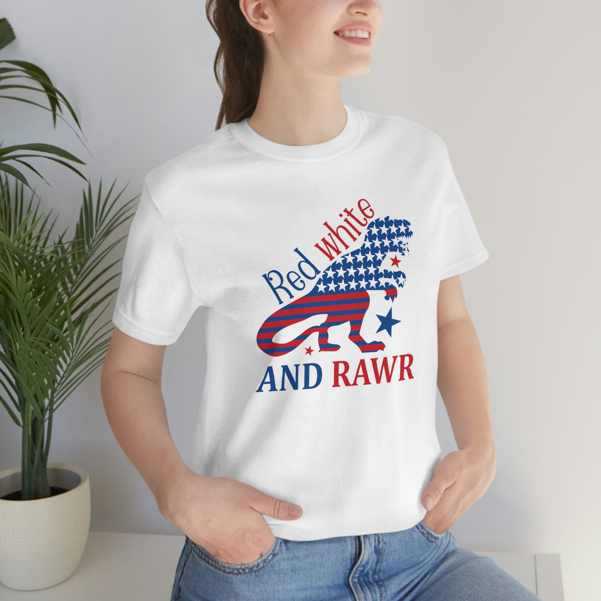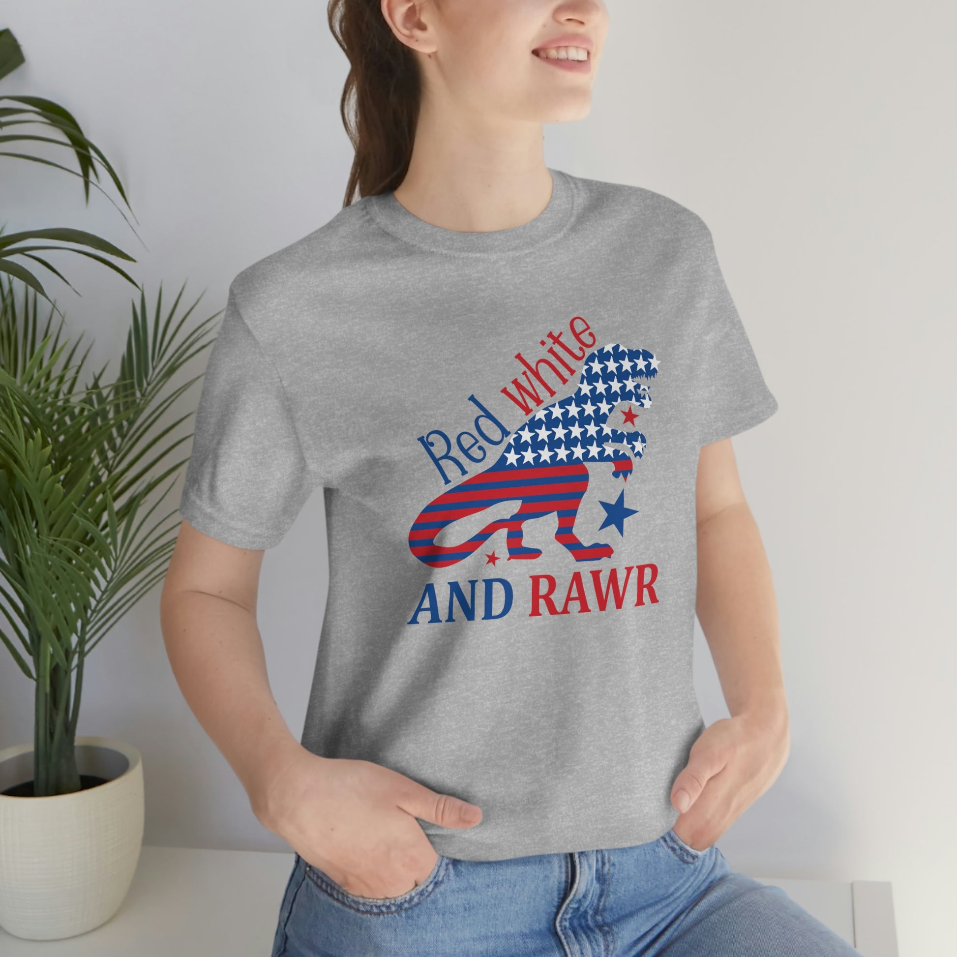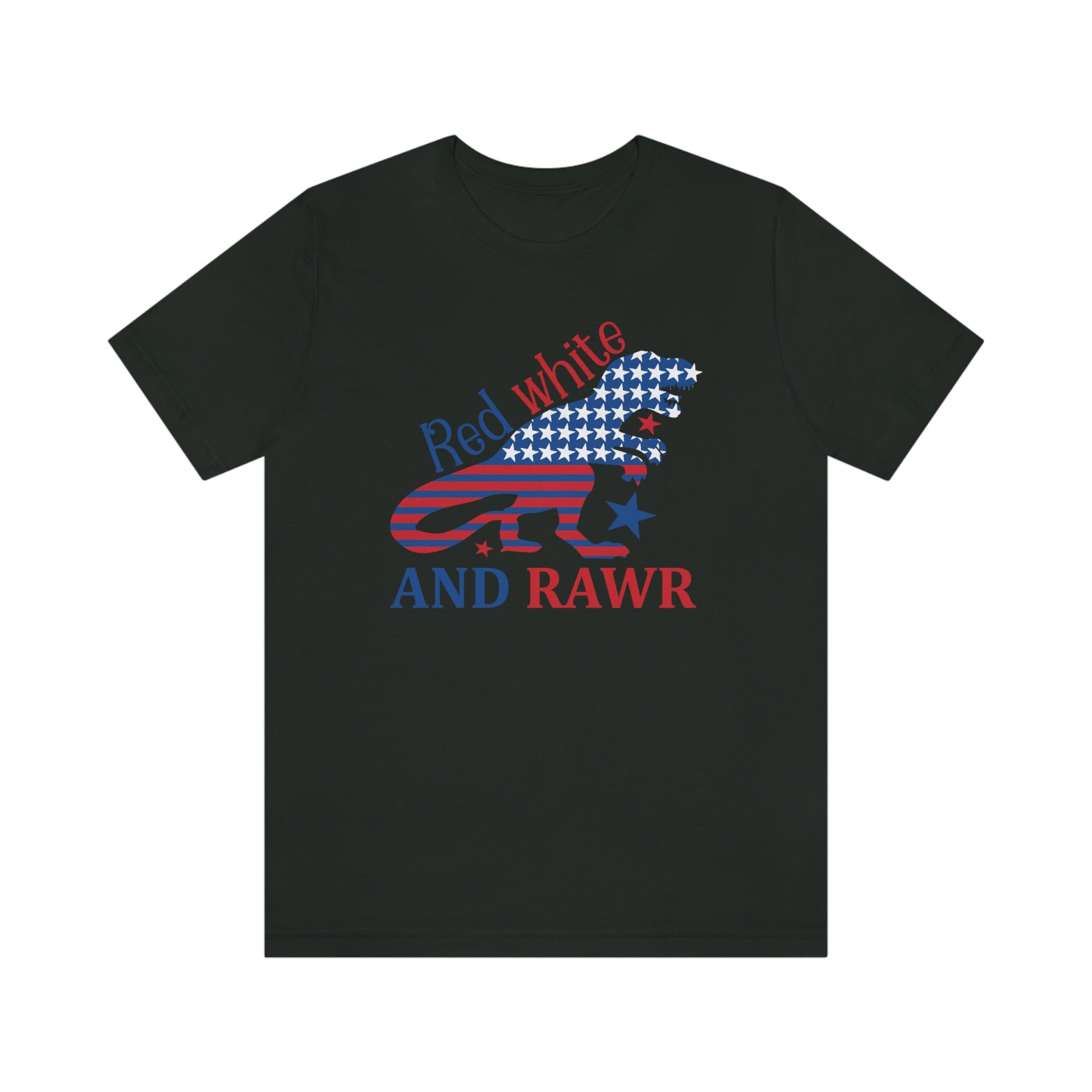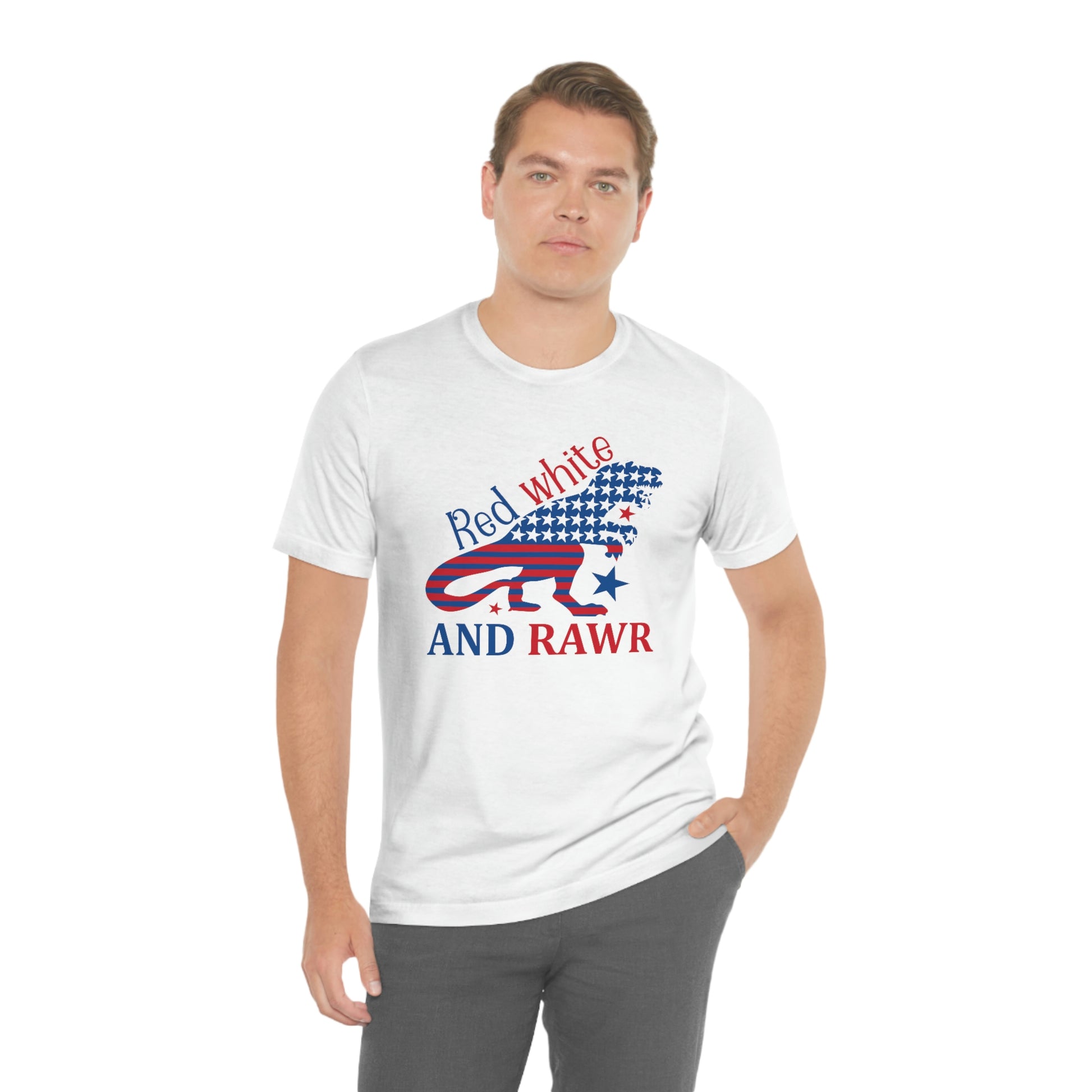 Red White Rawr Dinosaur 4th of July Unisex Jersey Short Sleeve Tee