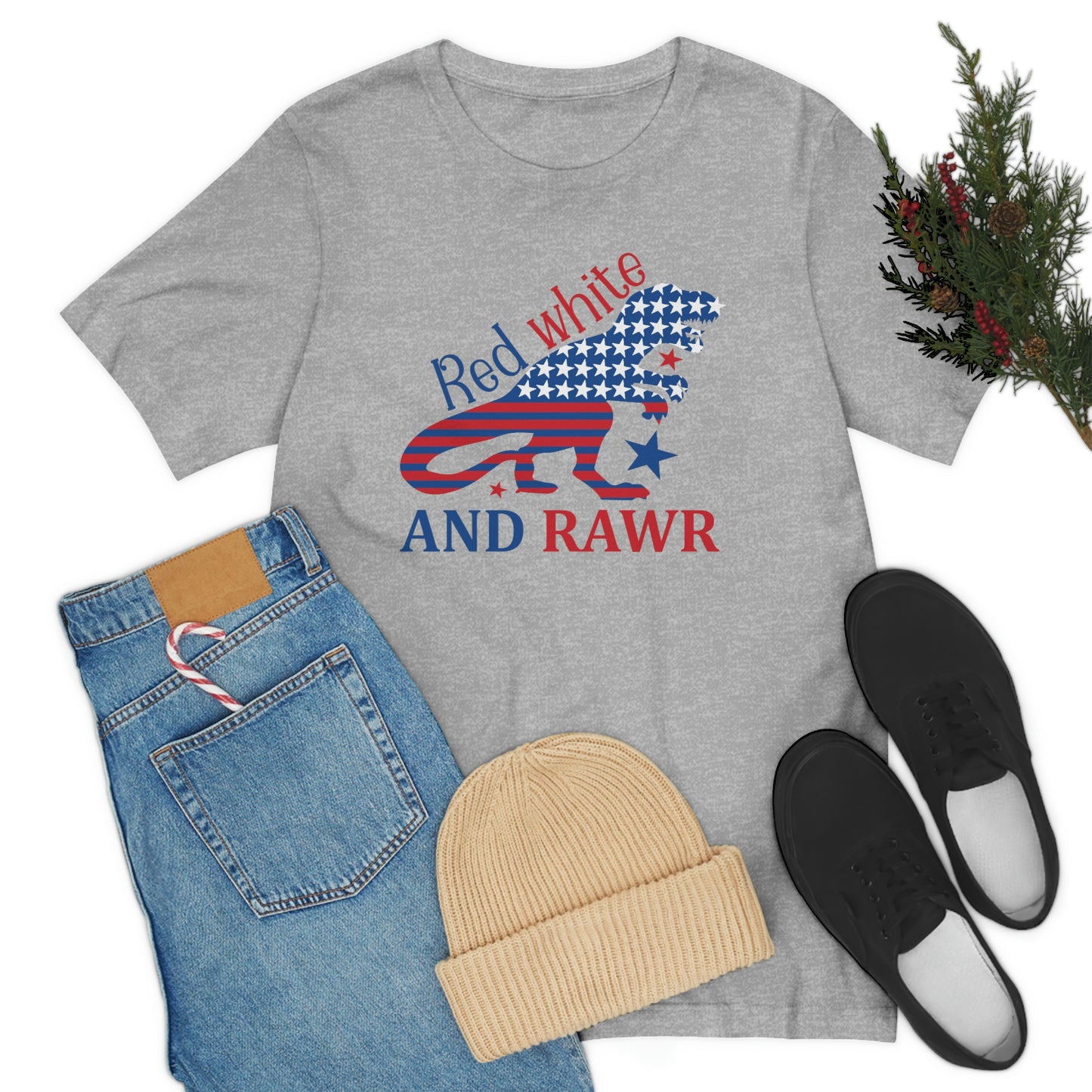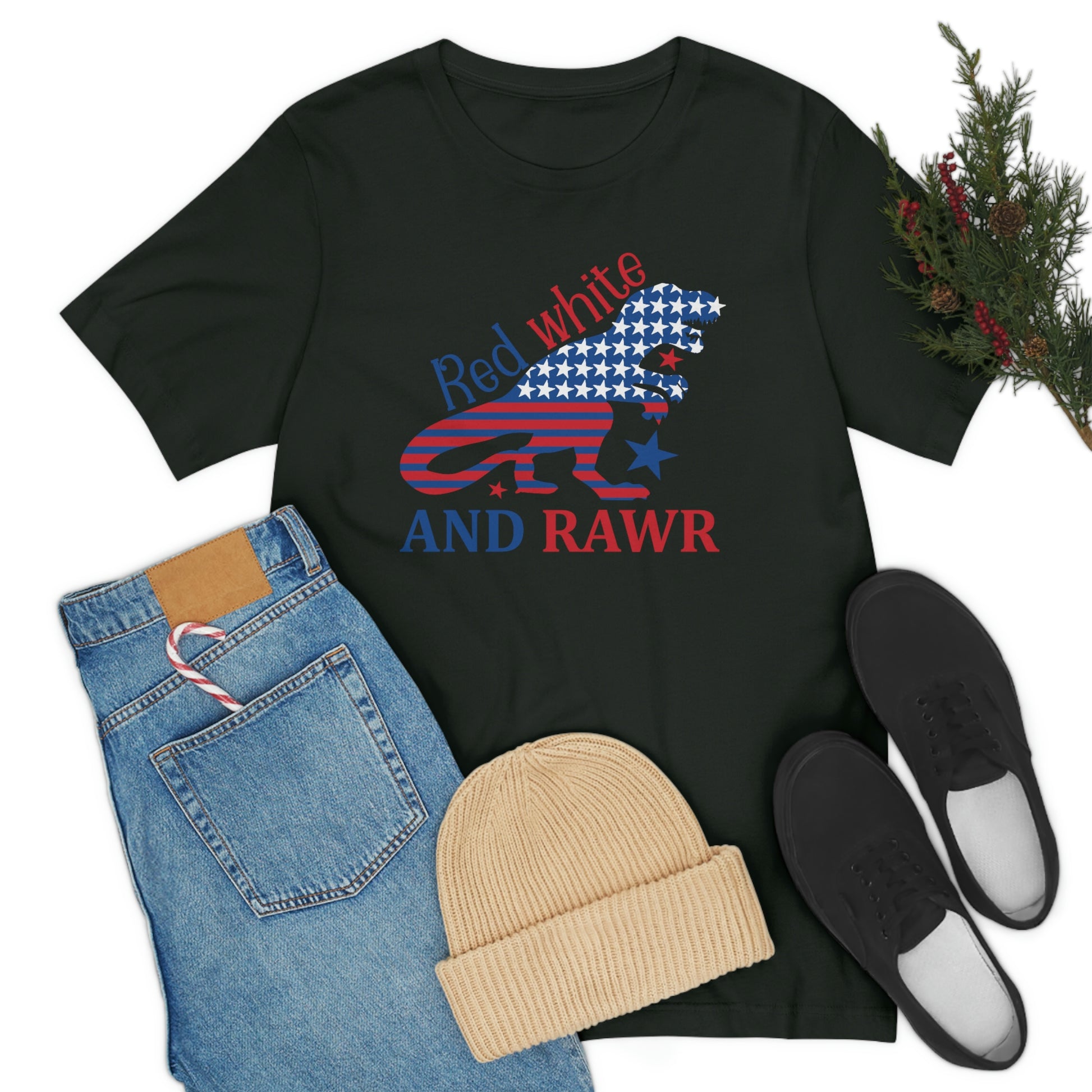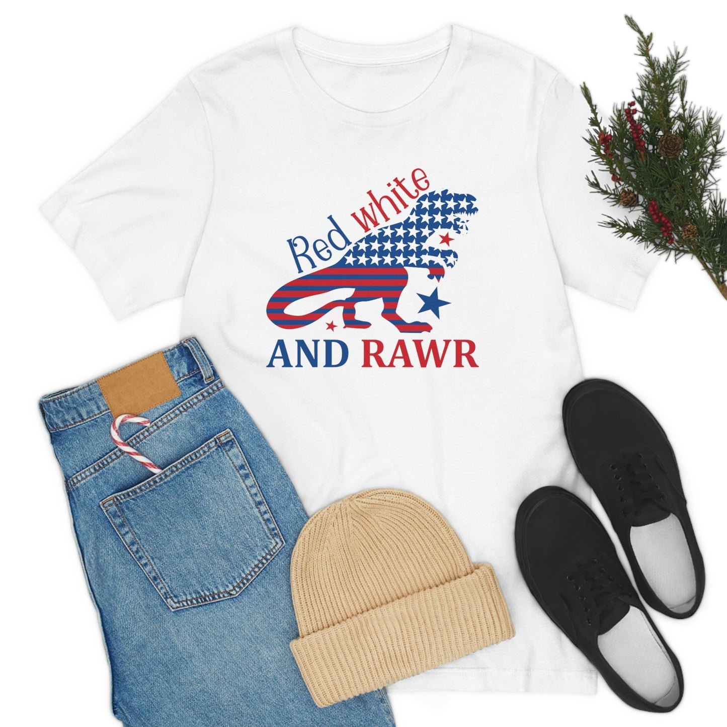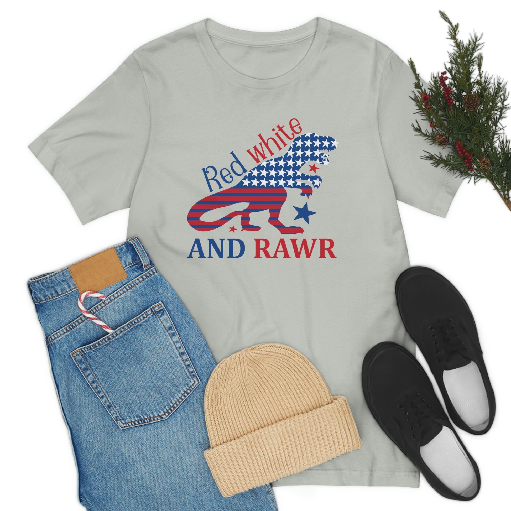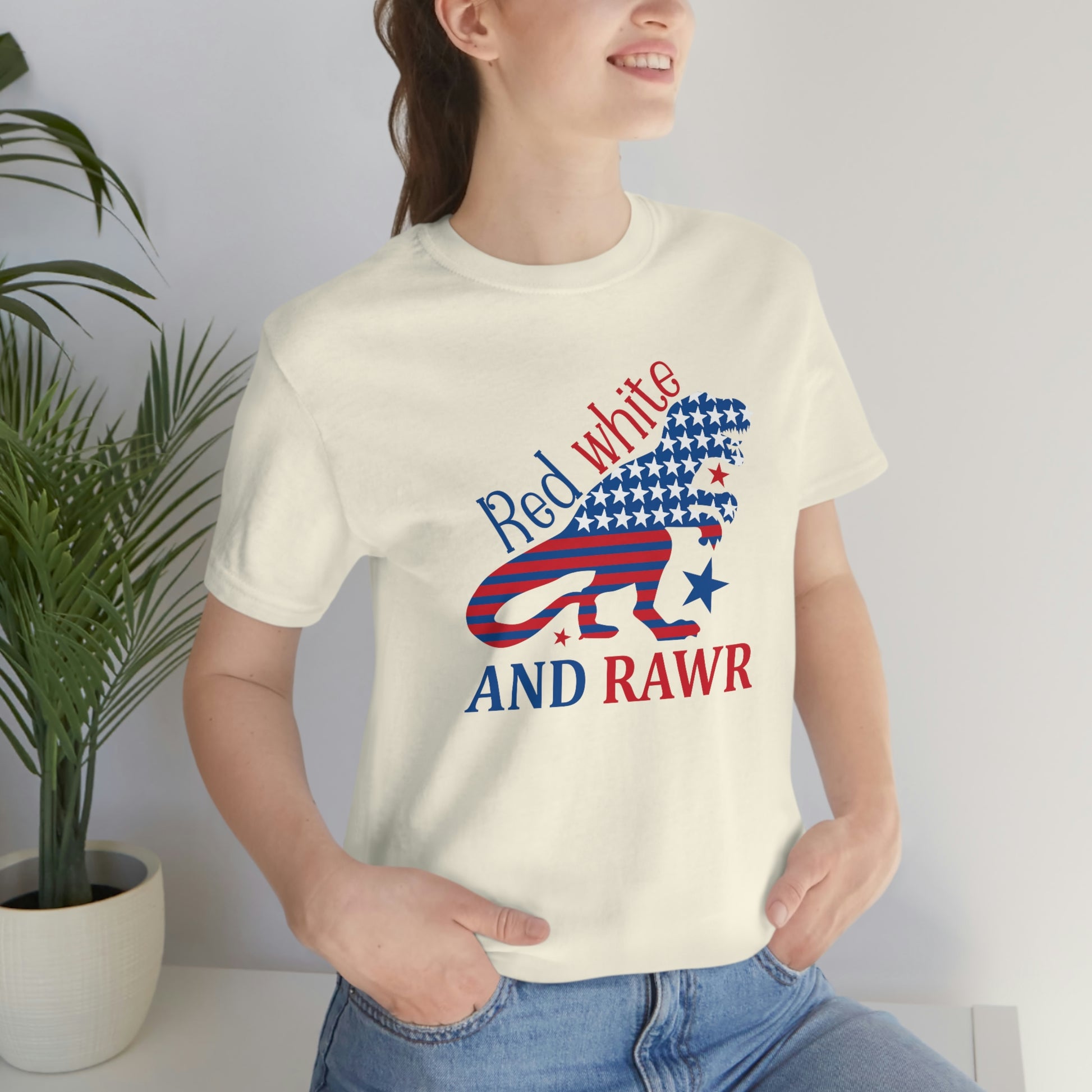 Red White Rawr Dinosaur 4th of July Unisex Jersey Short Sleeve Tee