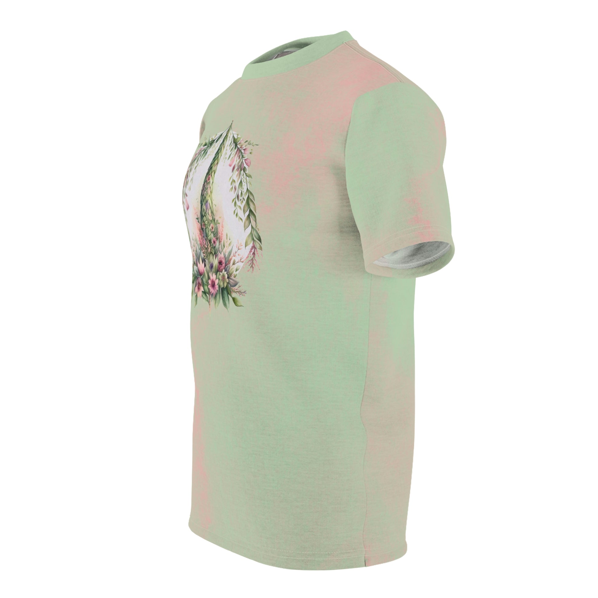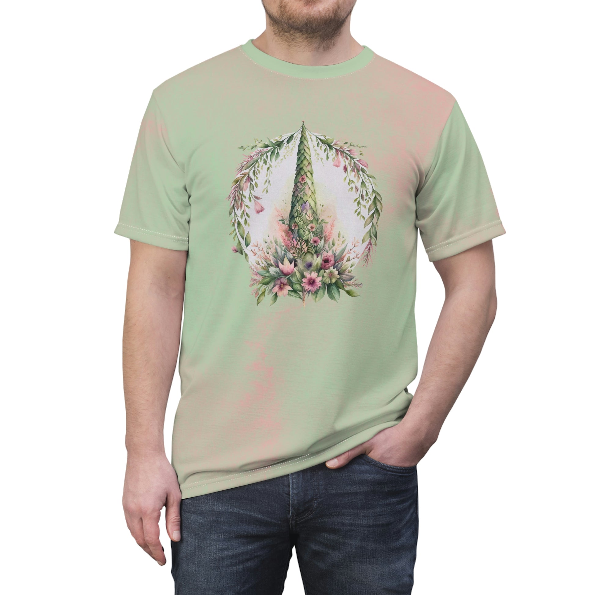 This shirt has a spring watercolor background and shows spring flower topiary design.