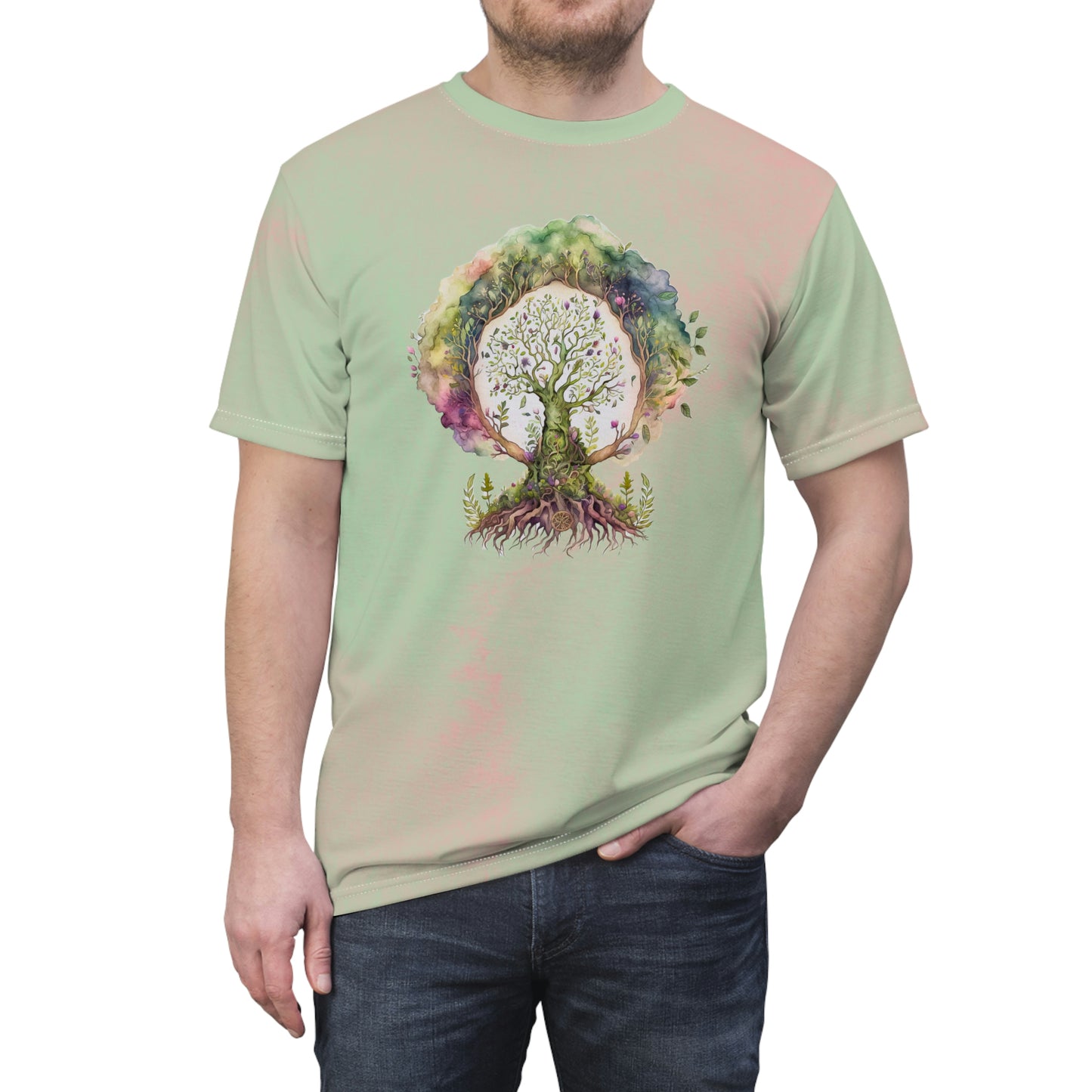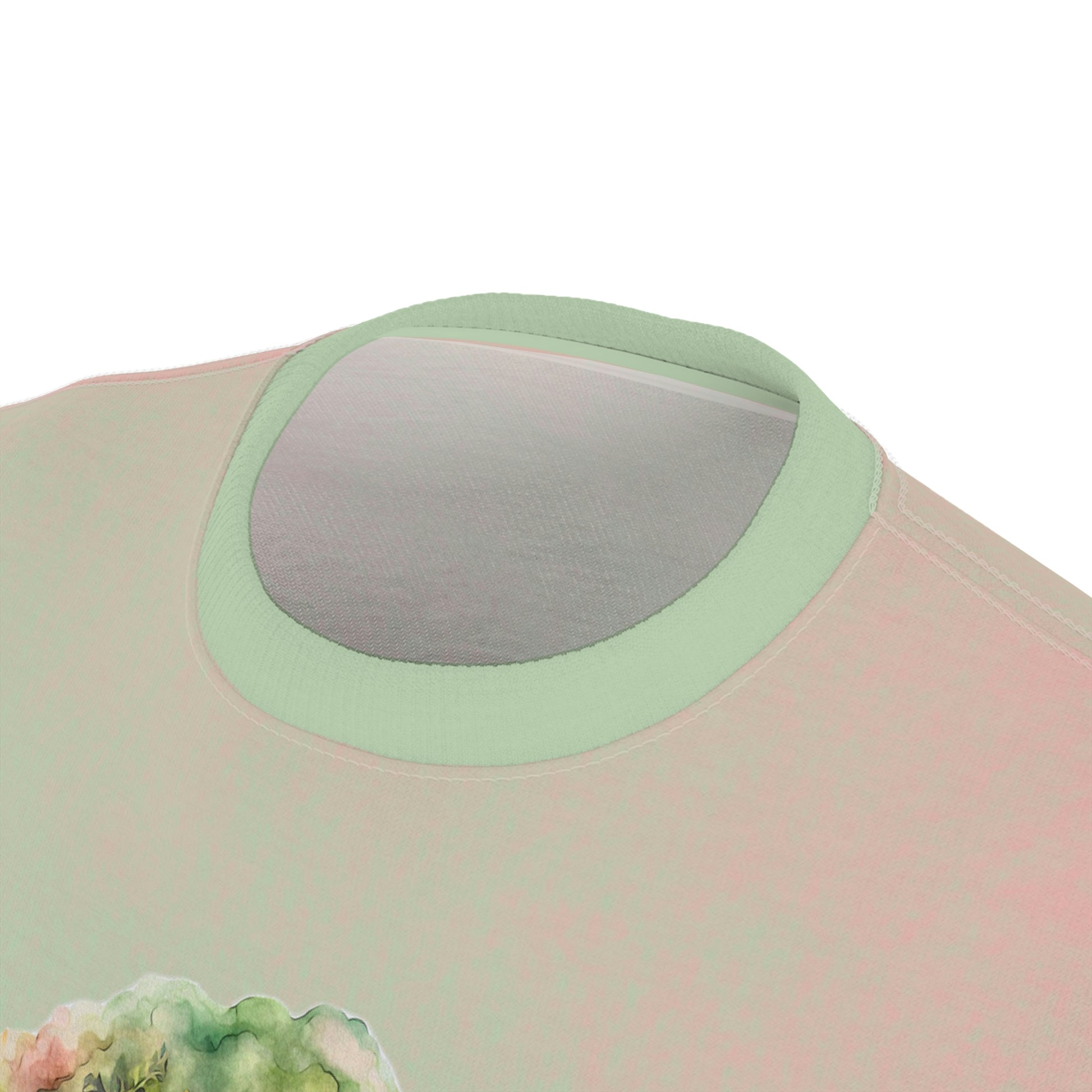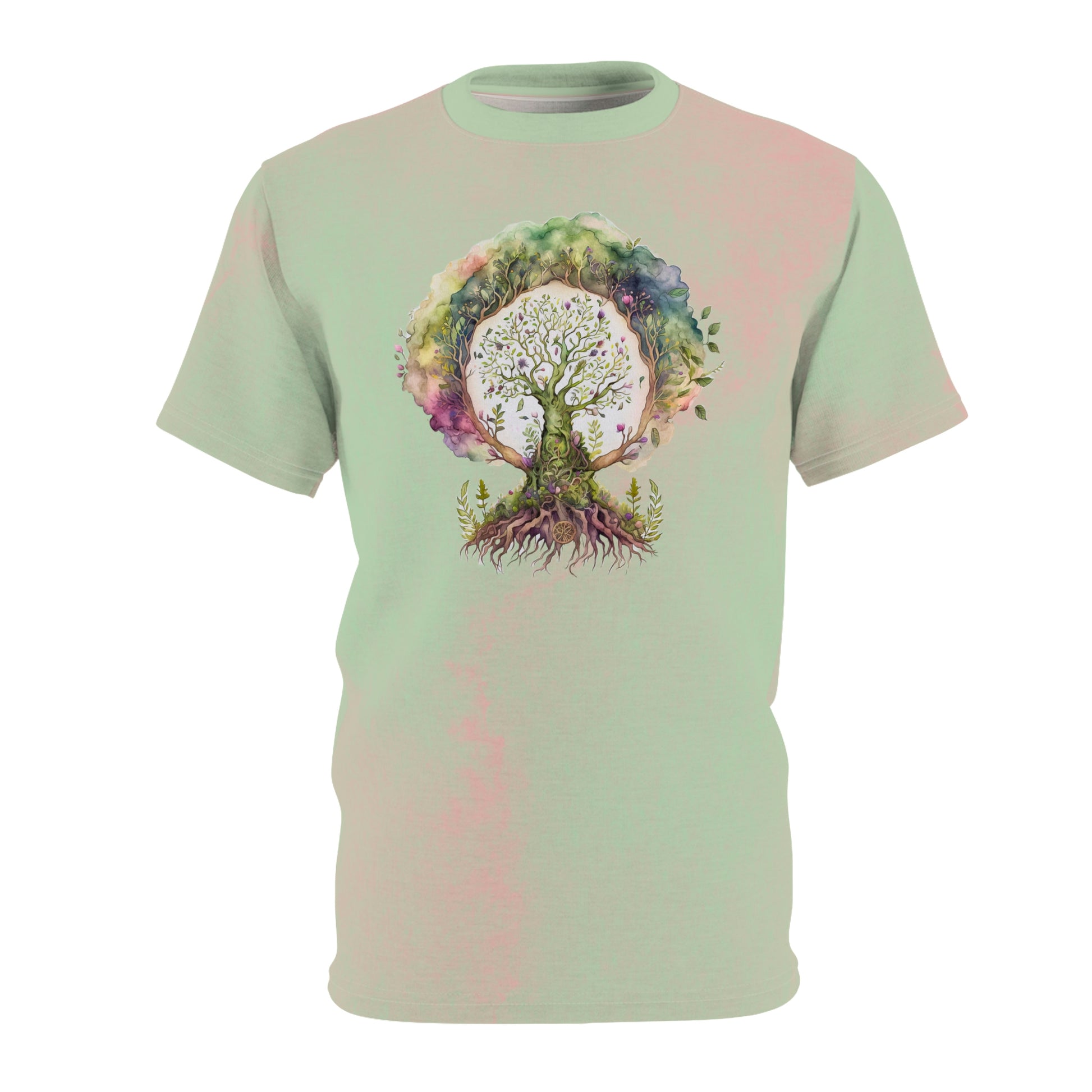 This shirt has a spring watercolor background and shows spring tree design.