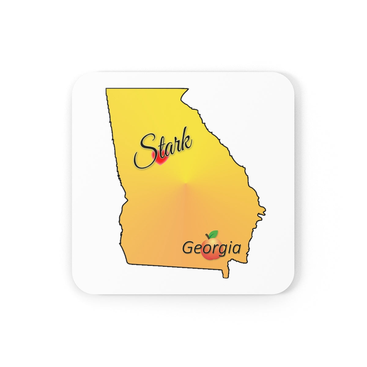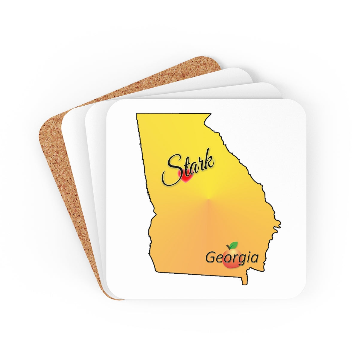 This coaster set comes with 4 coasters in one size.  They are made with a high-gloss top and feature a cork back to prevent sliding.
