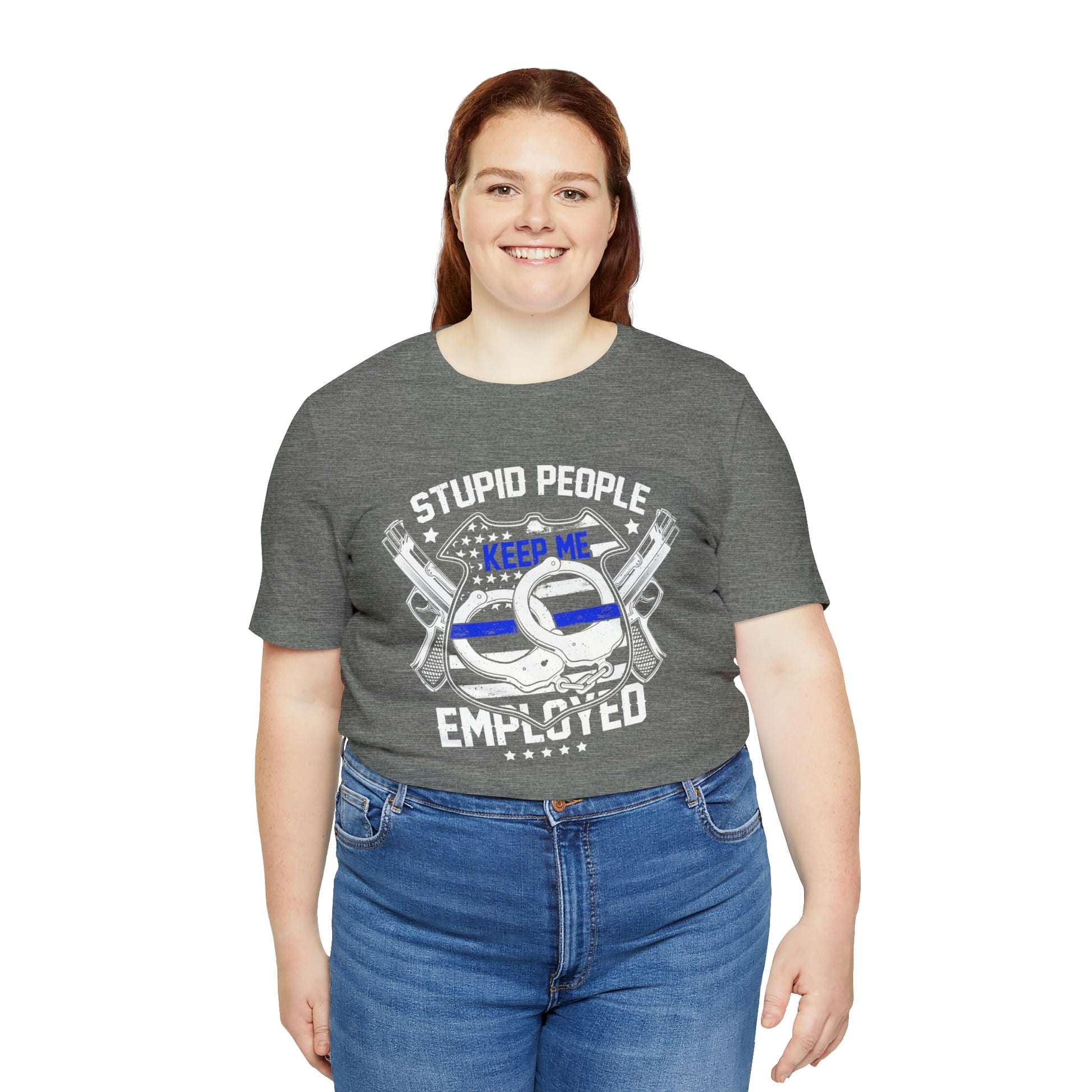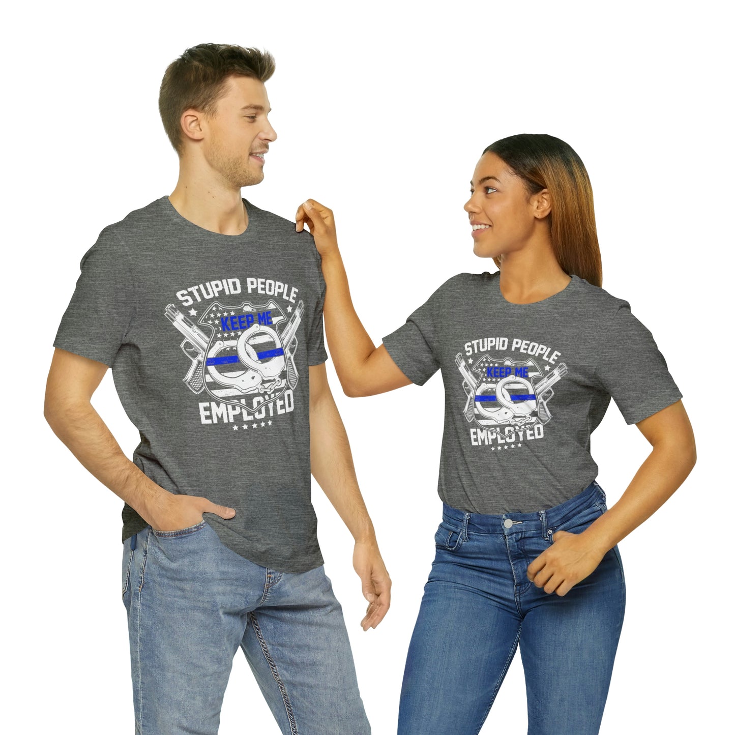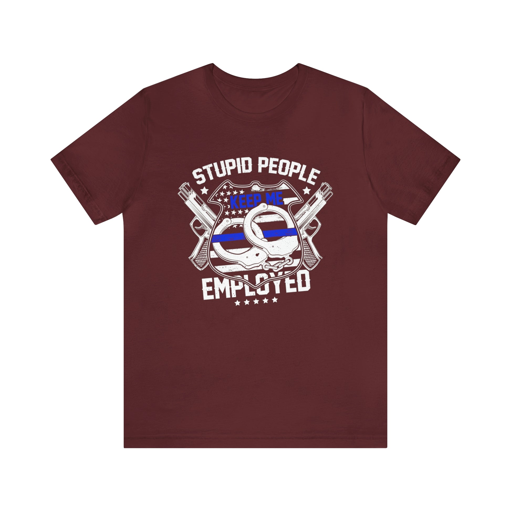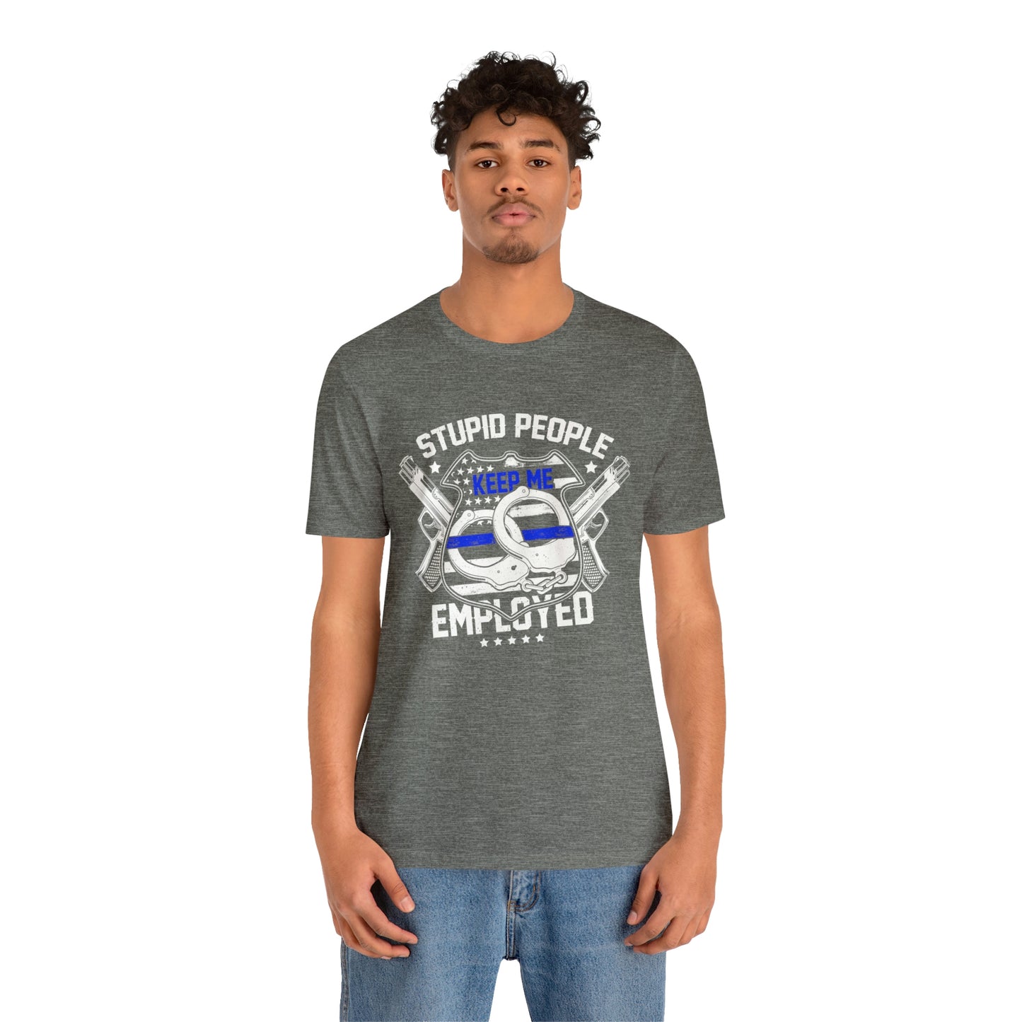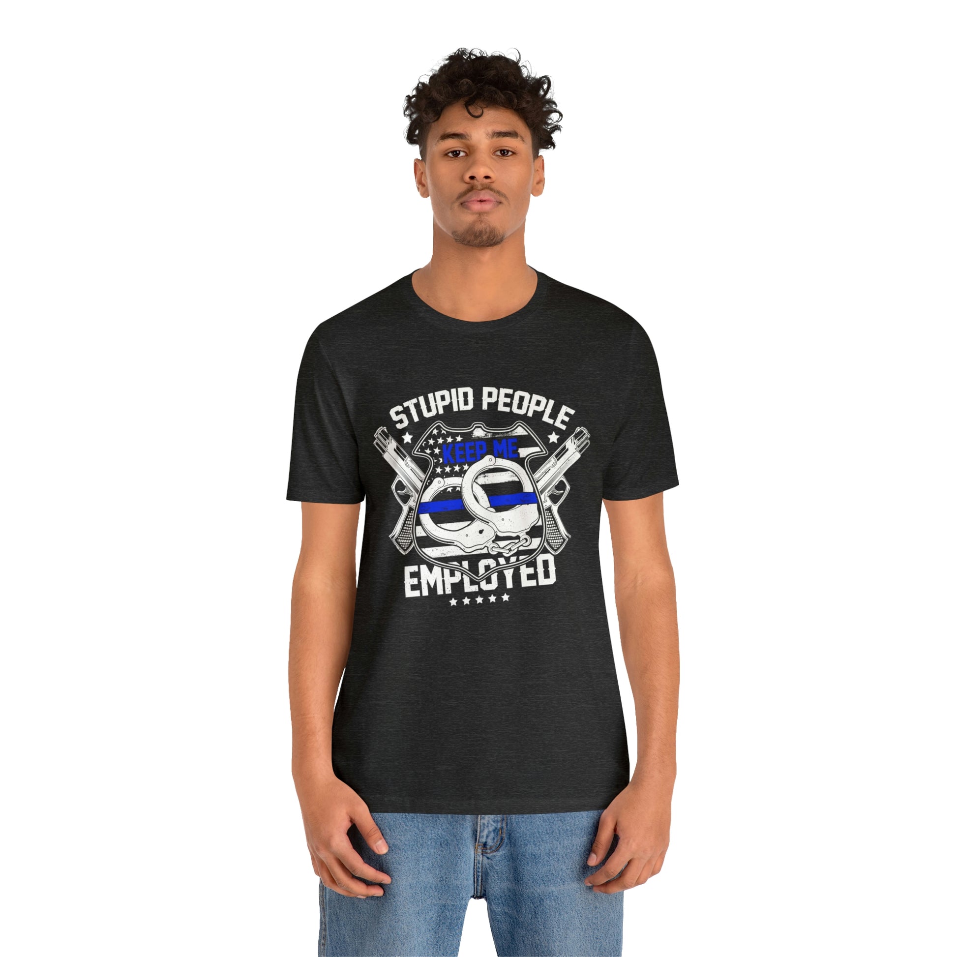 This classic unisex short sleeve t-shirt shows a police shield, handcuffs and guns and says Stupid People Keep Me Employed. This tee fits like a well-loved favorite. Soft cotton and quality print make you fall in love with it over and over again. These t-shirts have ribbed knit collars to bolster shaping. The shoulders have taping for better fit over time. Dual side seams hold the garment's shape for longer.