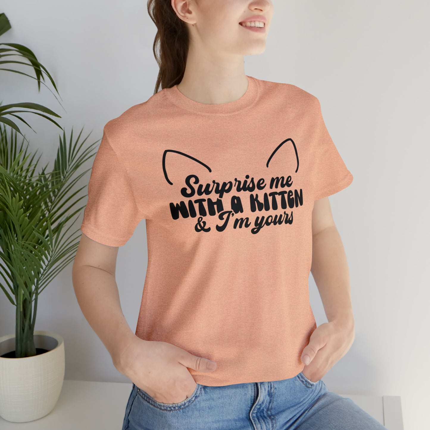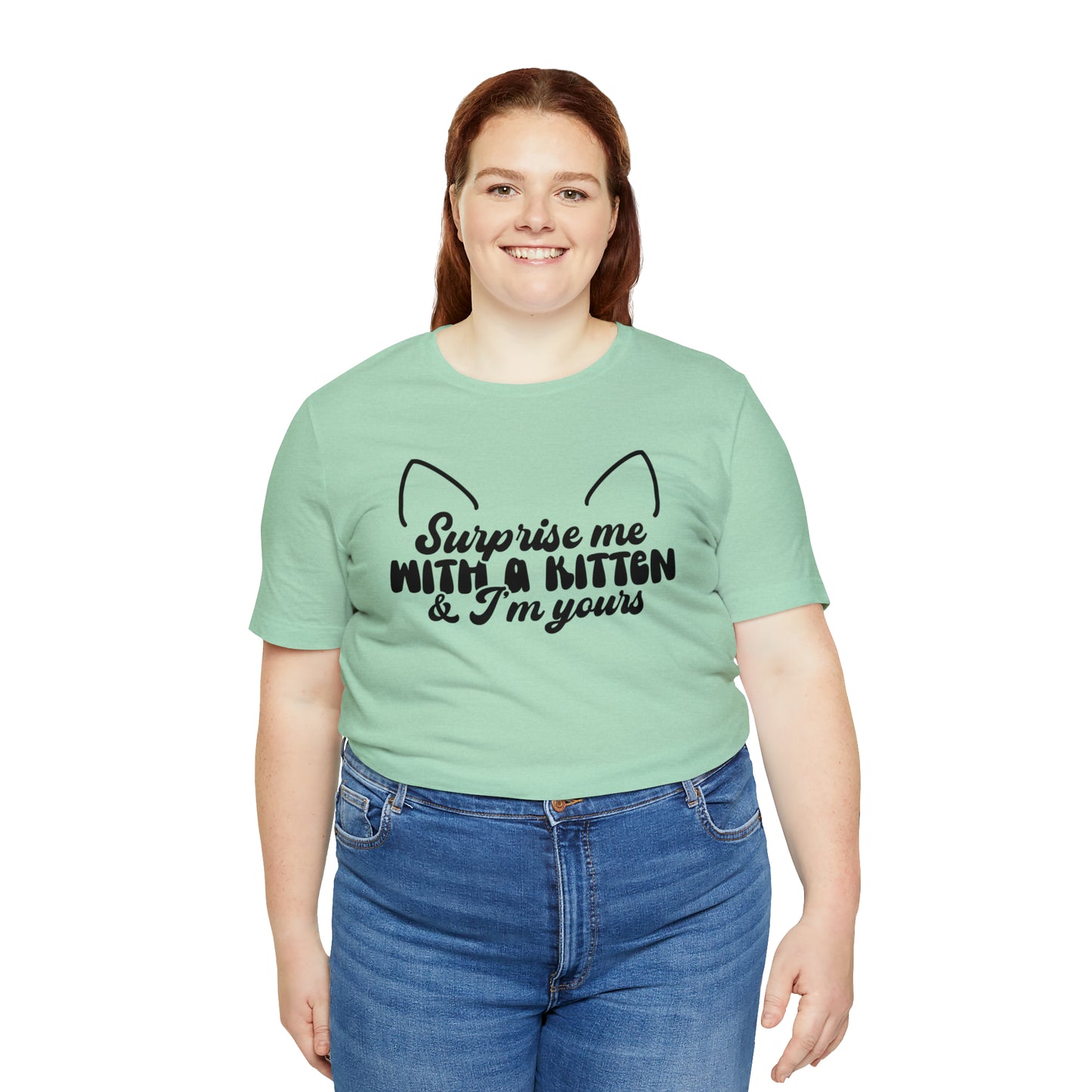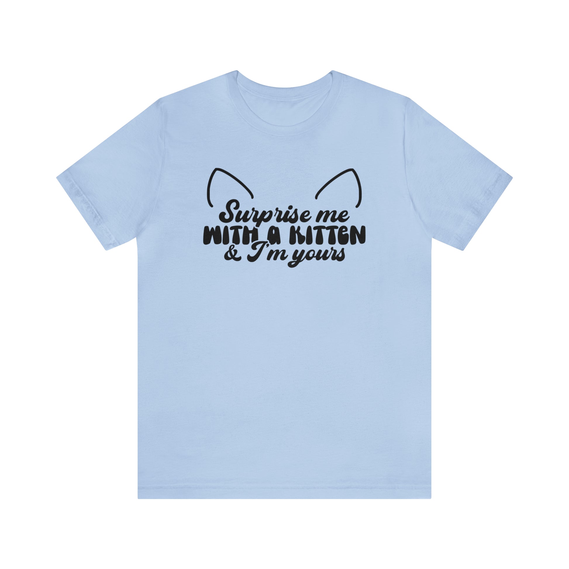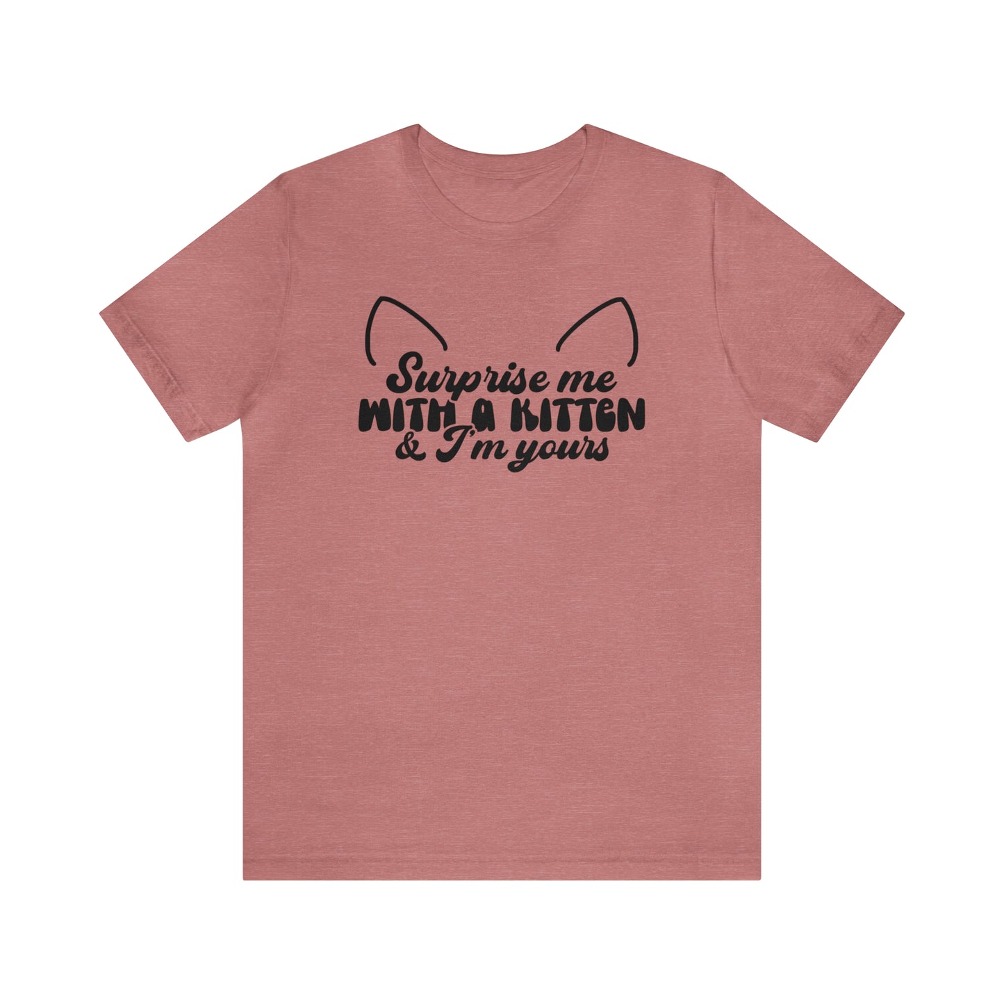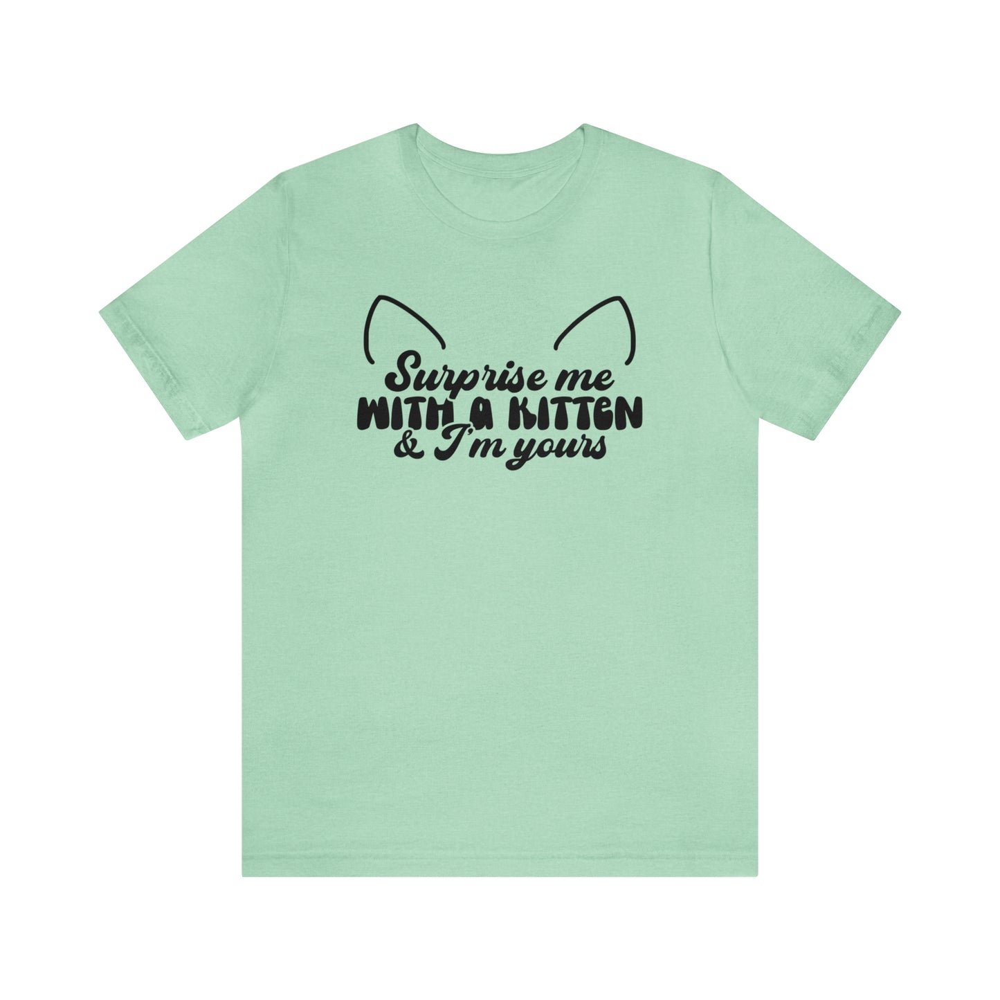 This classic unisex short sleeve cat t-shirt reads Surprise Me With a Kitten & I'm Yours. This tee fits like a well-loved favorite. Soft cotton and quality print make you fall in love with it over and over again. These t-shirts have ribbed knit collars to bolster shaping. The shoulders have taping for better fit over time. Dual side seams hold the garment's shape for longer.