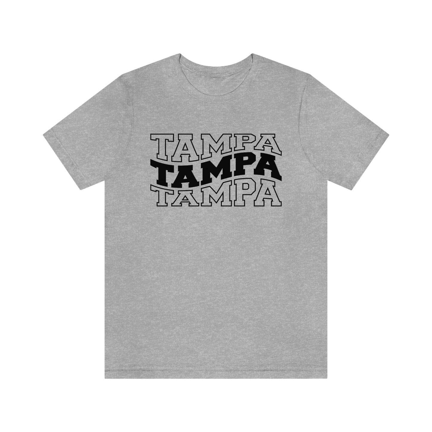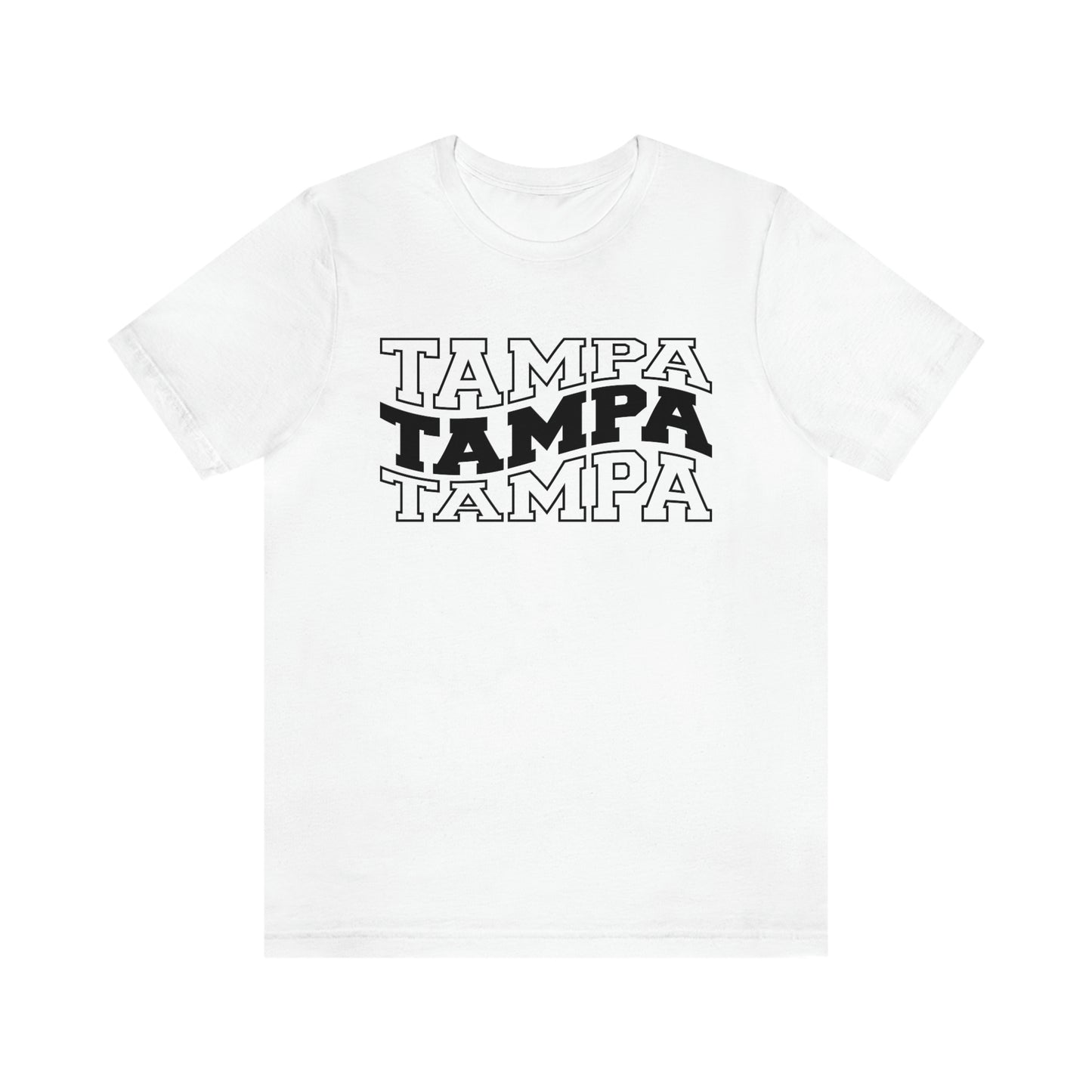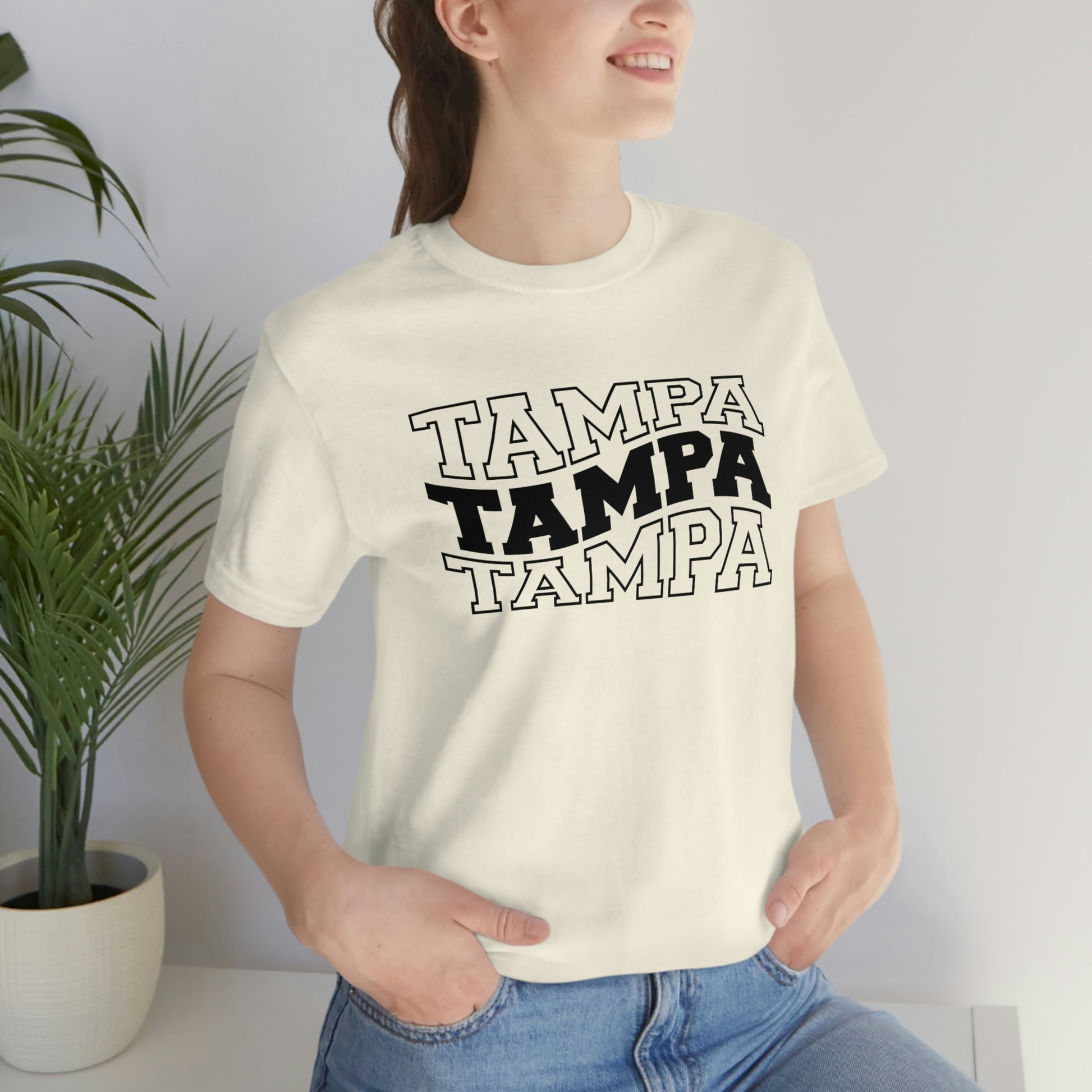 Show off your love and pride in Tampa with this classic unisex short sleeve t-shirt with Tampa written in a triple stacked varisty wavy pattern. This tee fits like a well-loved favorite. Soft cotton and quality print make you fall in love with it over and over again. These t-shirts have ribbed knit collars to bolster shaping. The shoulders have taping for better fit over time. Dual side seams hold the garment's shape for longer.