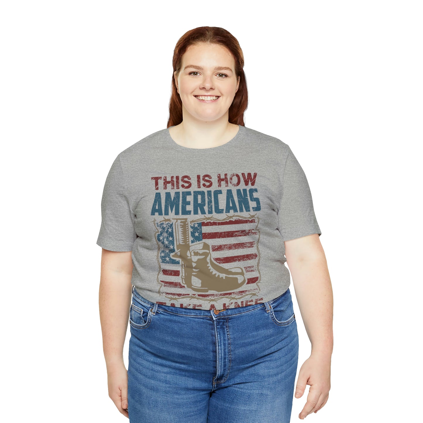 This classic unisex short sleeve t-shirt shows combat boots on over an American flag background with barbed wire around it and says This is How Americans Take a Knee. This tee fits like a well-loved favorite. Soft cotton and quality print make you fall in love with it over and over again. These t-shirts have ribbed knit collars to bolster shaping. The shoulders have taping for better fit over time. Dual side seams hold the garment's shape for longer.