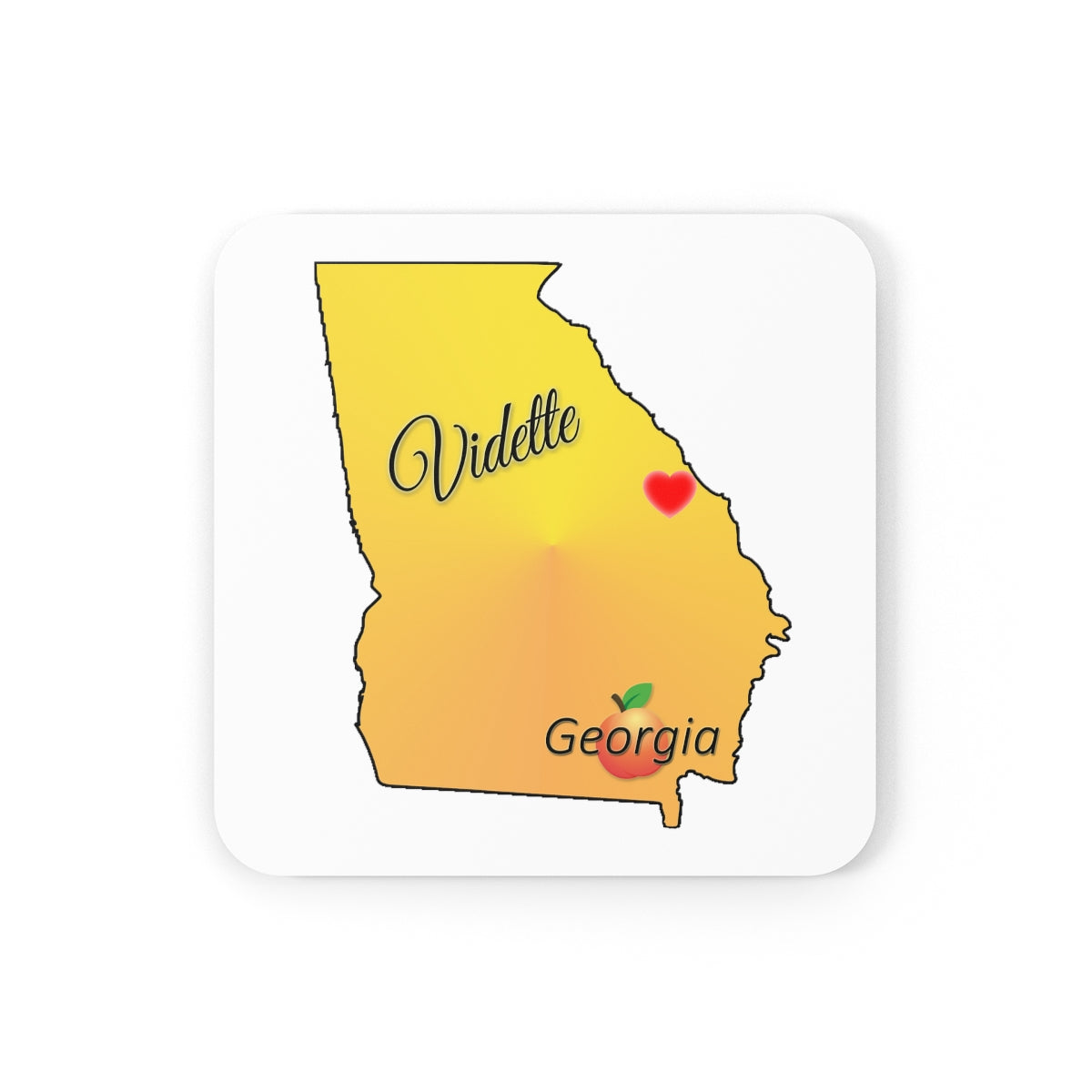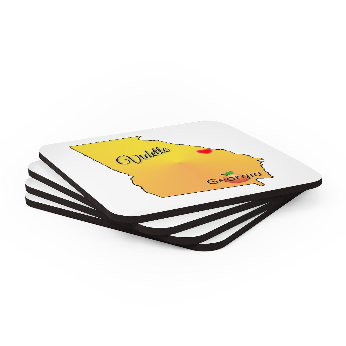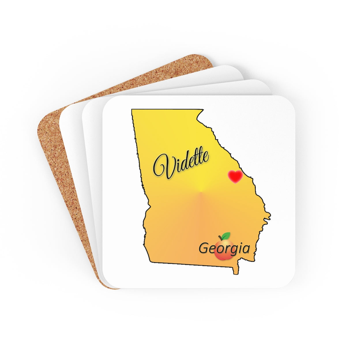 This coaster set comes with 4 coasters in one size. They are made with a high-gloss top and feature a cork back to prevent sliding.