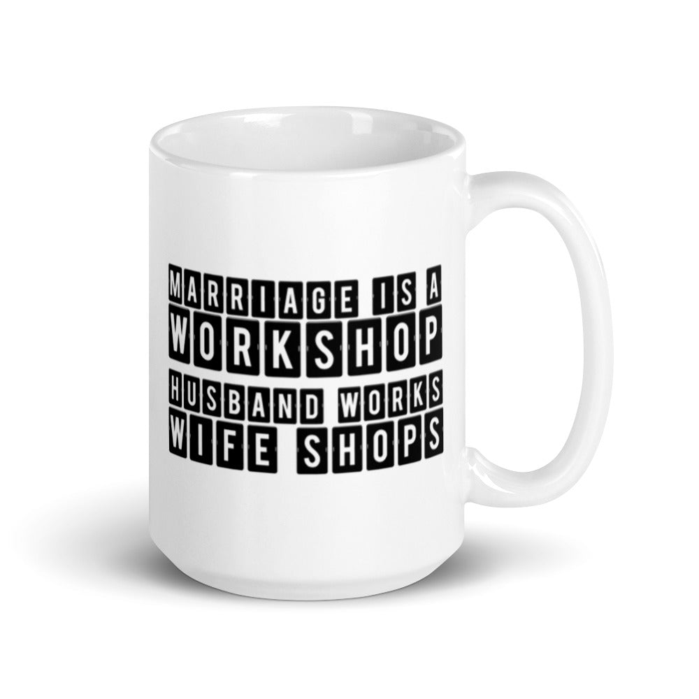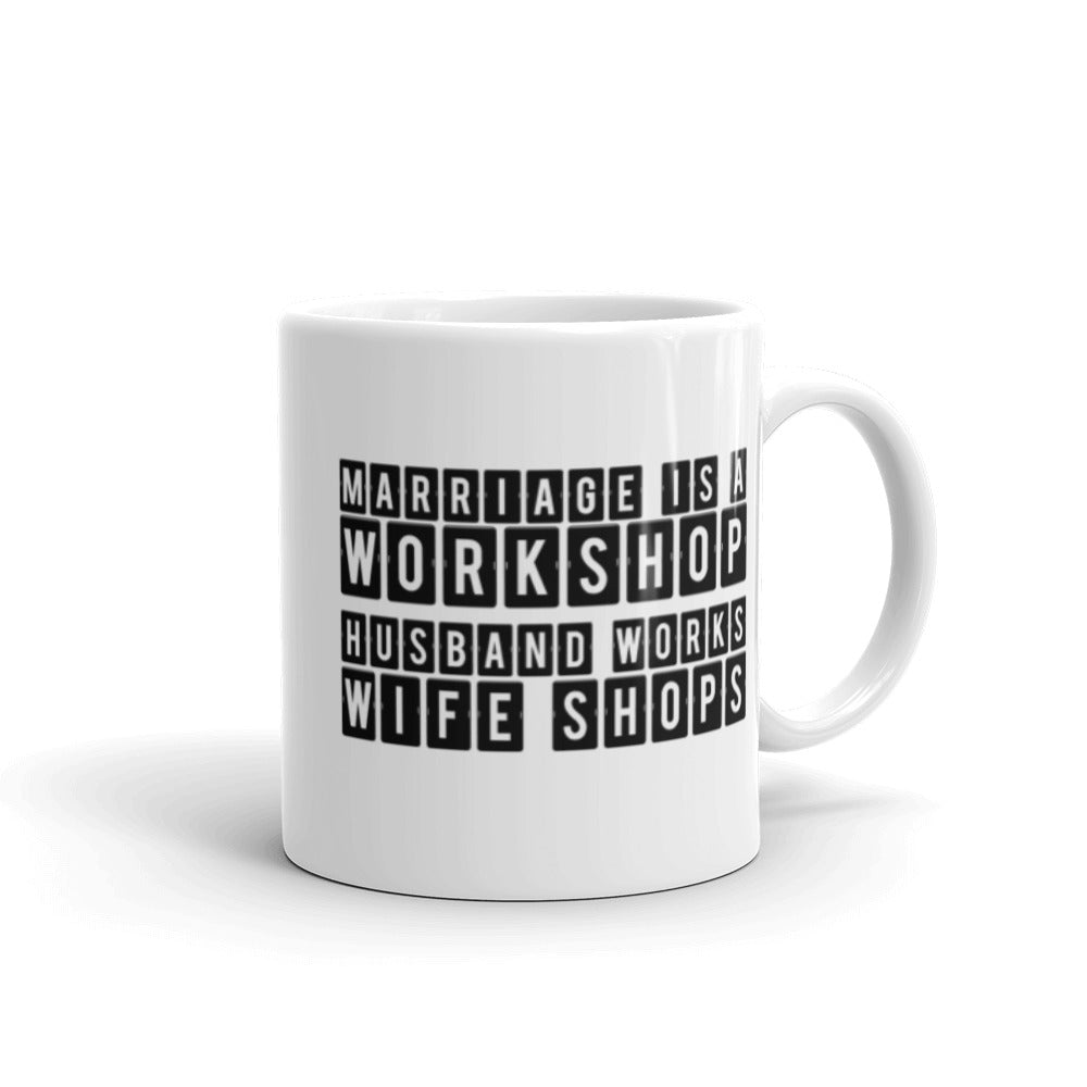 Marriage is a Workshop Husband Works Wife Shops White Ceramic Mug